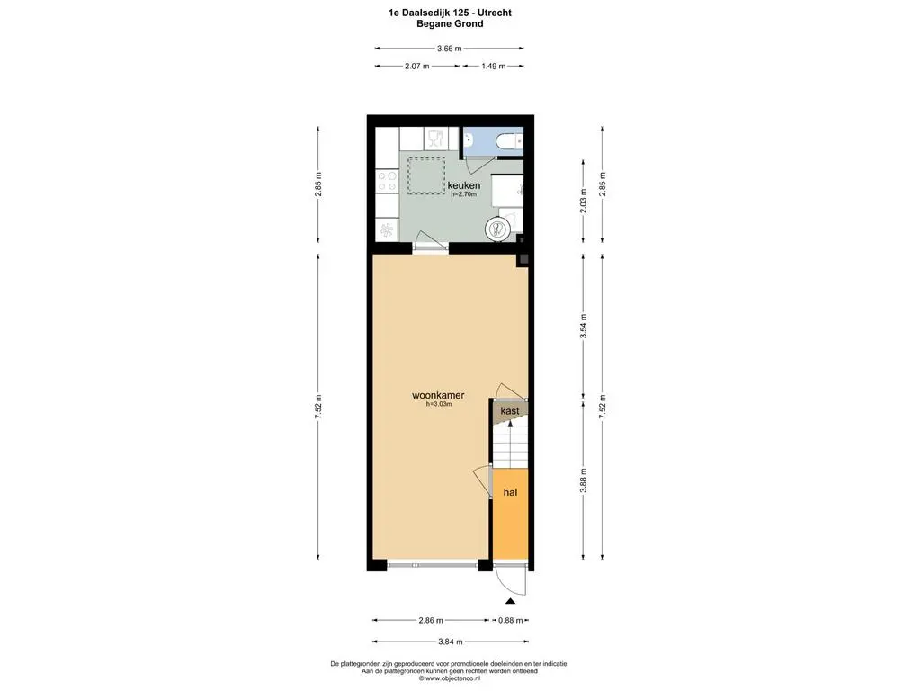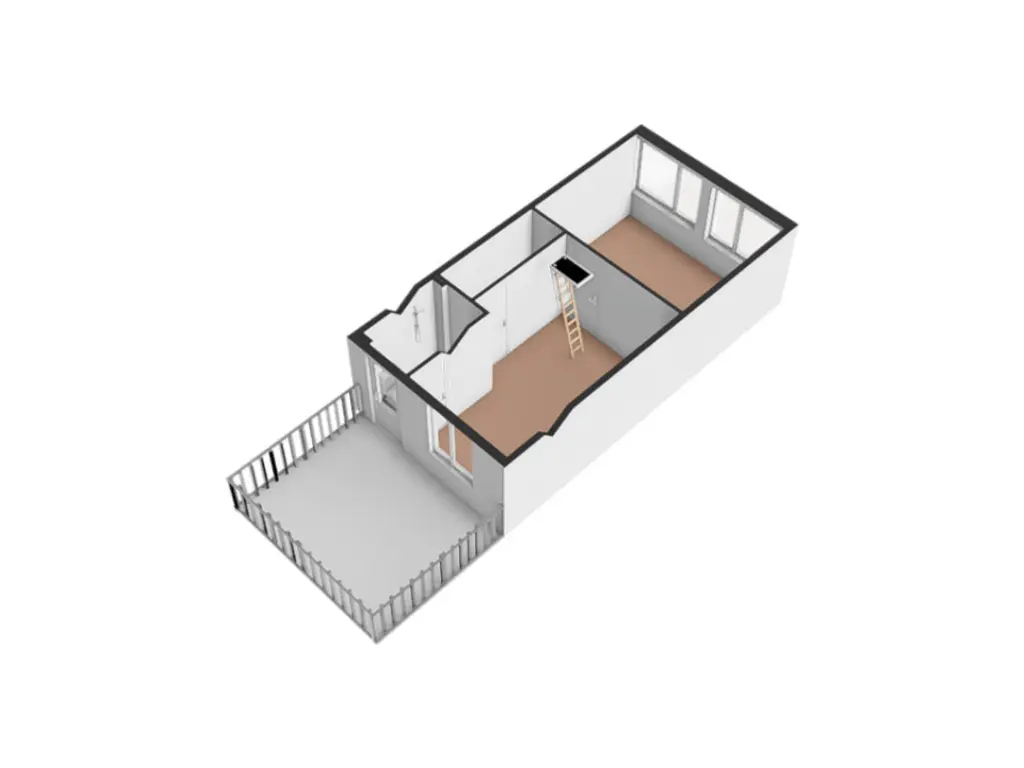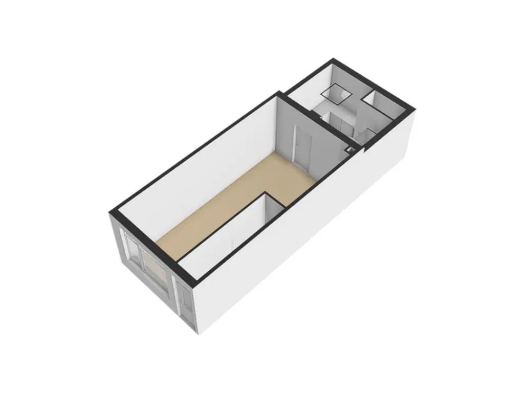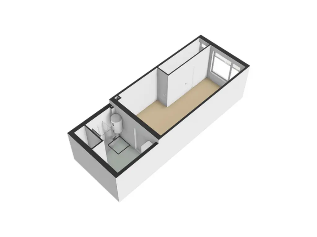 Begane grond: Binnenkomst in een lichte woonkamer met een open verbinding naar de keuken, compleet met inbouwapparatuur. Hier vind je ook de wasmachineaansluiting, een compacte doucheruimte en een afgesloten toiletruimte.