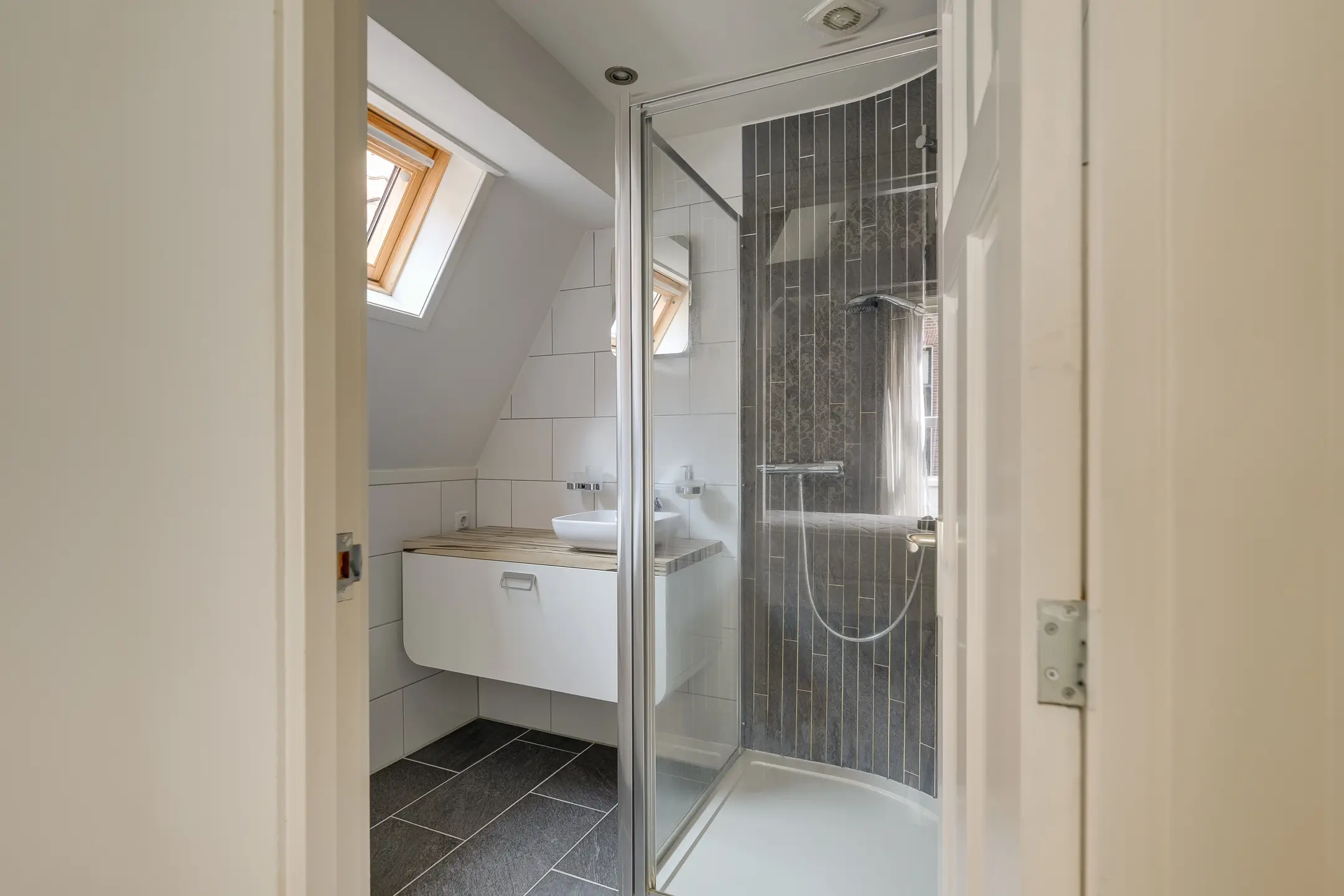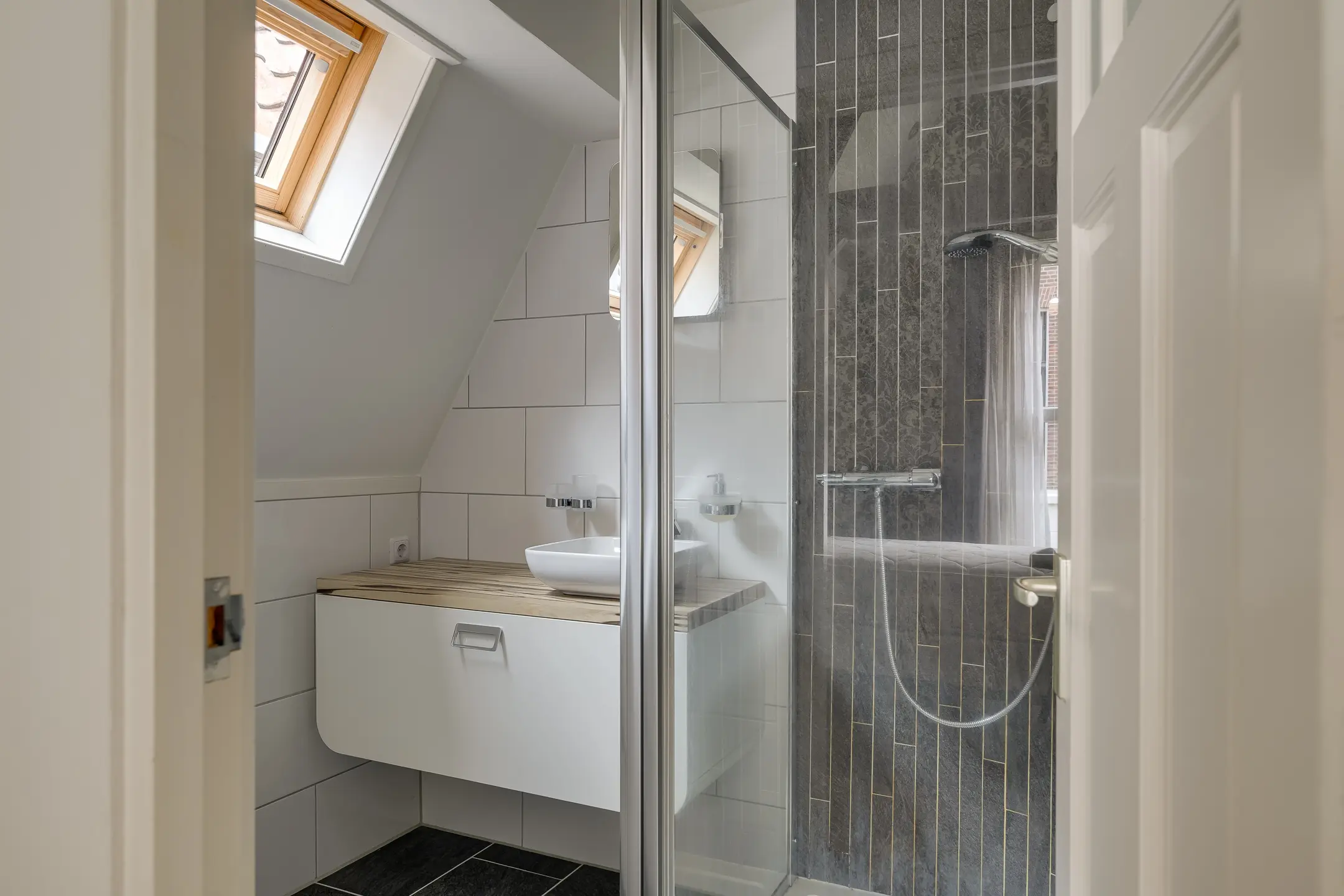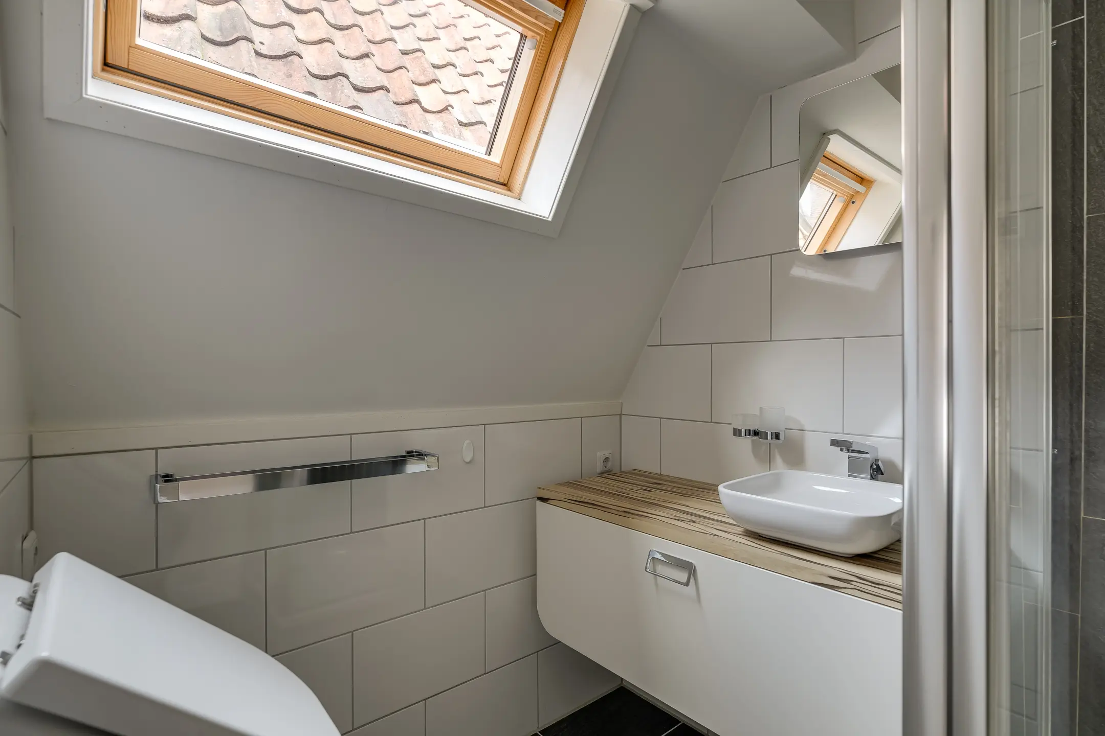 Op de eerste etage bevindt zich de royale slaapkamer (H=4,09 m), die door de hoge nok een bijzonder ruimtelijk gevoel geeft. Aan achterzijde zijn aan weerszijden praktische inbouwkasten en een plek voor een bureau. De badkamer is uitgerust met een douche, wastafel en urinoir.