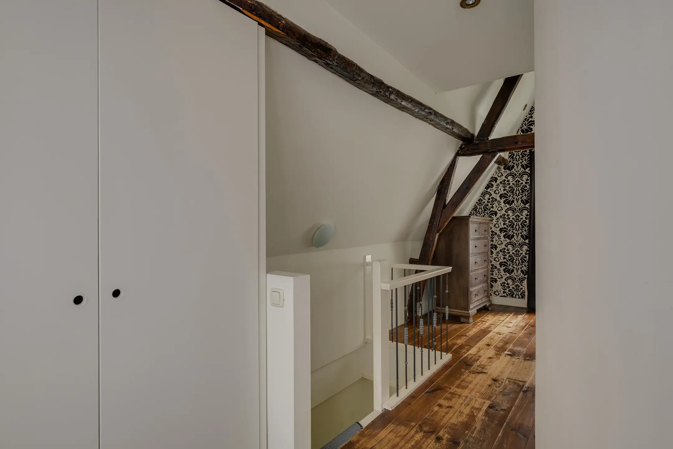 On the first floor, you will find the spacious bedroom (ceiling height: 4.09 m), which, thanks to its high ceiling, provides a wonderfully open and airy feel. At the rear, there are practical built-in wardrobes on both sides and space for a desk. The bathroom is equipped with a shower, washbasin, and urinal.
