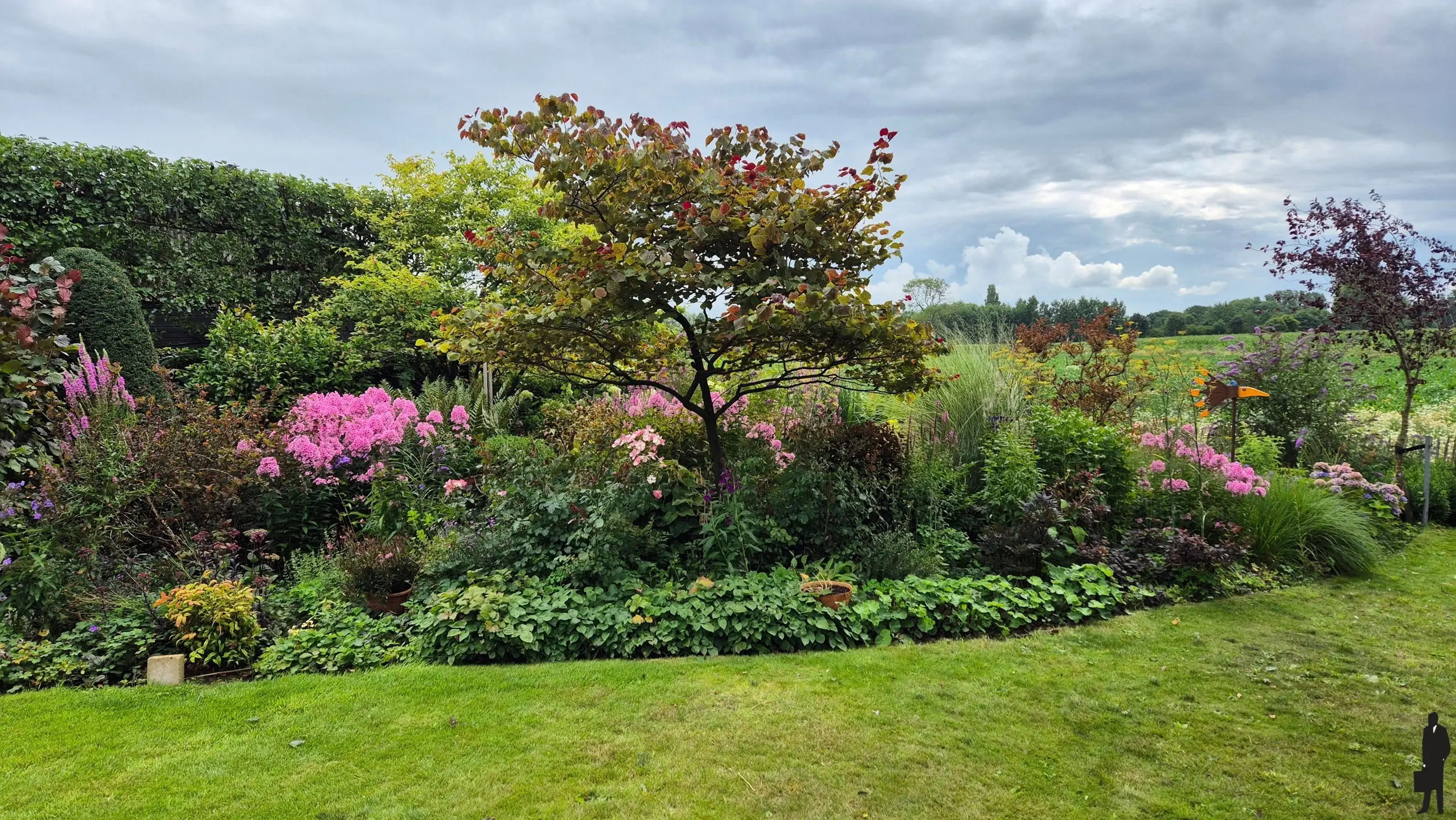 In de tuin is er een praktische berging voor het tuingereedschap en er is een sproei installatie die te bedienen is via een app.