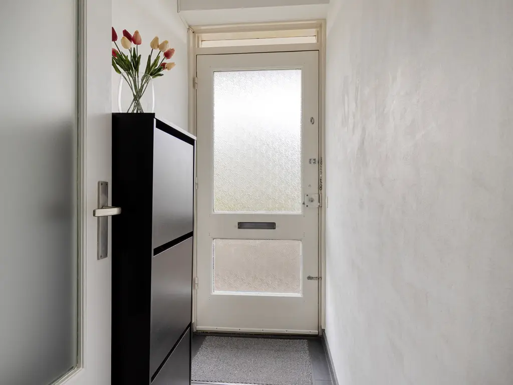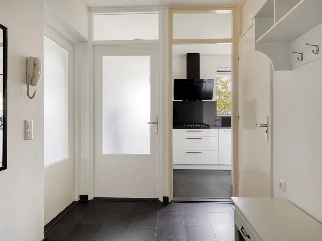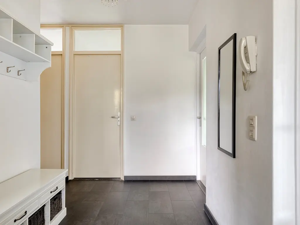 Via de overdekte galerij kom je bij de entree van het appartement. Binnen tref je een