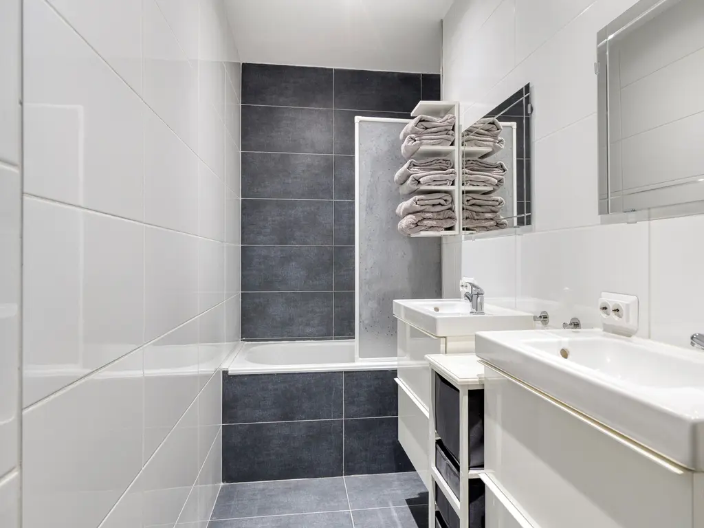 De badkamer is netjes afgewerkt en voorzien van een bad, douche, twee