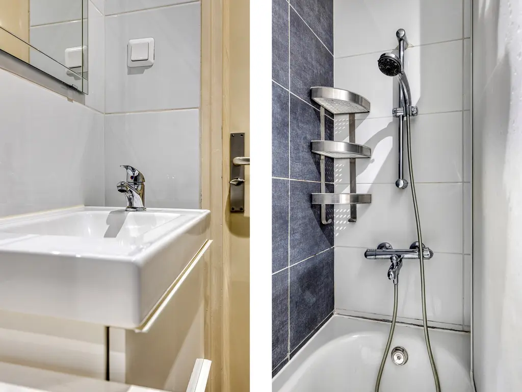 The bathroom is neatly finished and equipped with a bathtub, shower, two washbasin