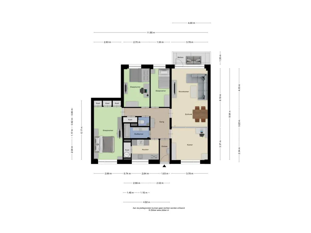 Het appartement beschikt over drie slaapkamers van goed formaat. De