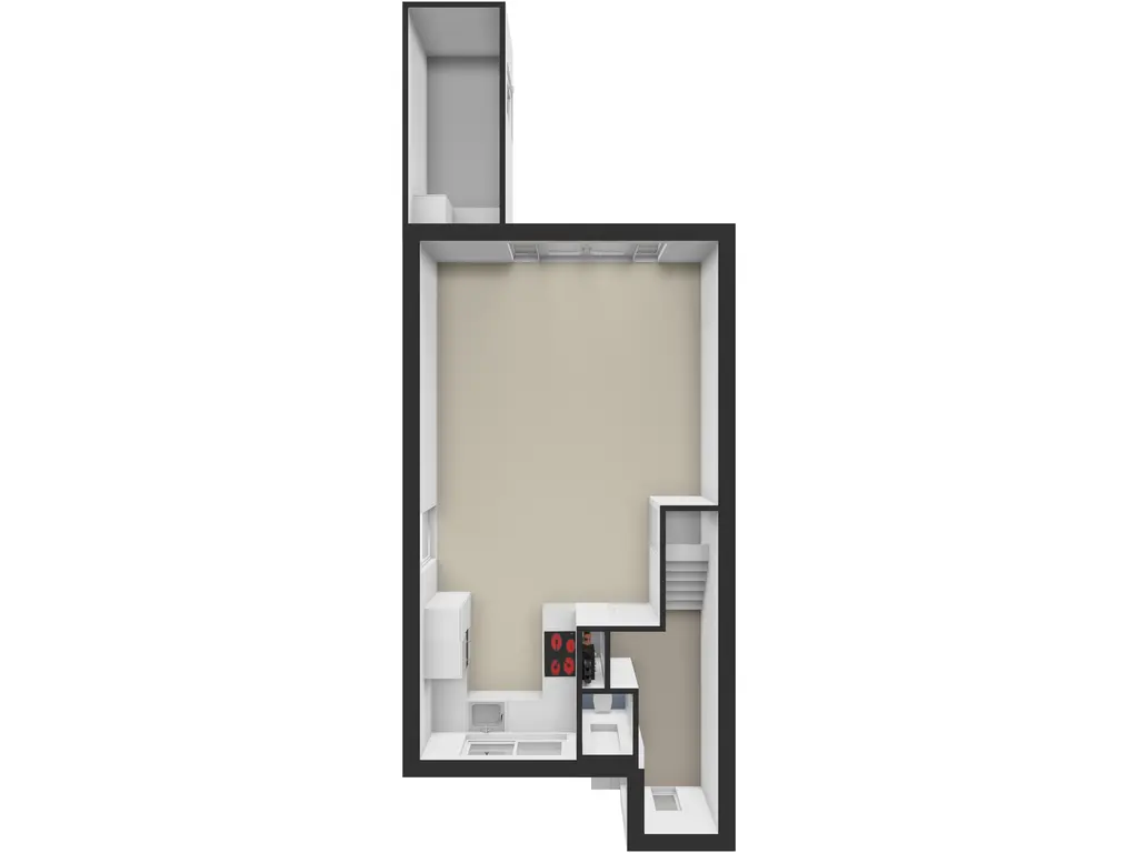 Je komt binnen in een ruime hal waar direct de nette afwerking opvalt. Hier vind je de meterkast met 3 fase aansluiting (3x 25 Amp), de toiletruimte en de trap naar de eerste verdieping. De trap is afgewerkt met houten bekleding en zwart stalen trapleuningen – een stoer detail dat meteen sfeer brengt. Het toilet is modern uitgevoerd in grijs/wit tegelwerk en voorzien van een hangend toilet en fonteintje.