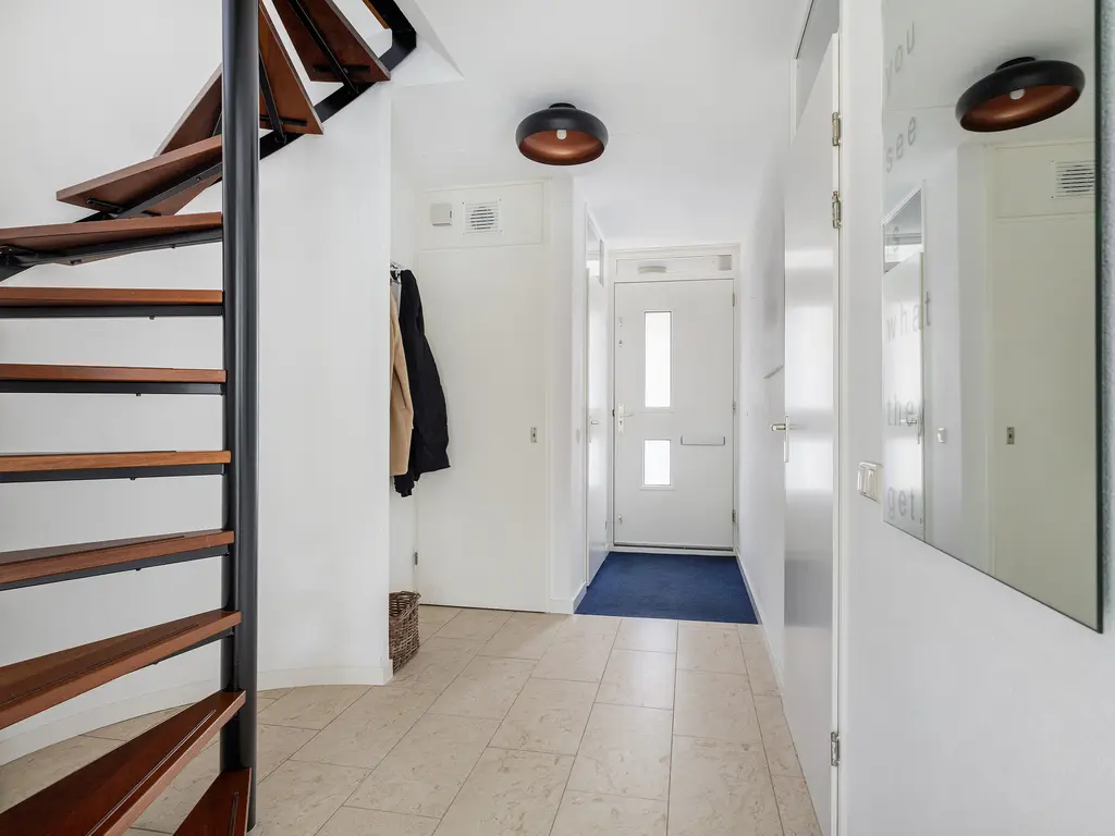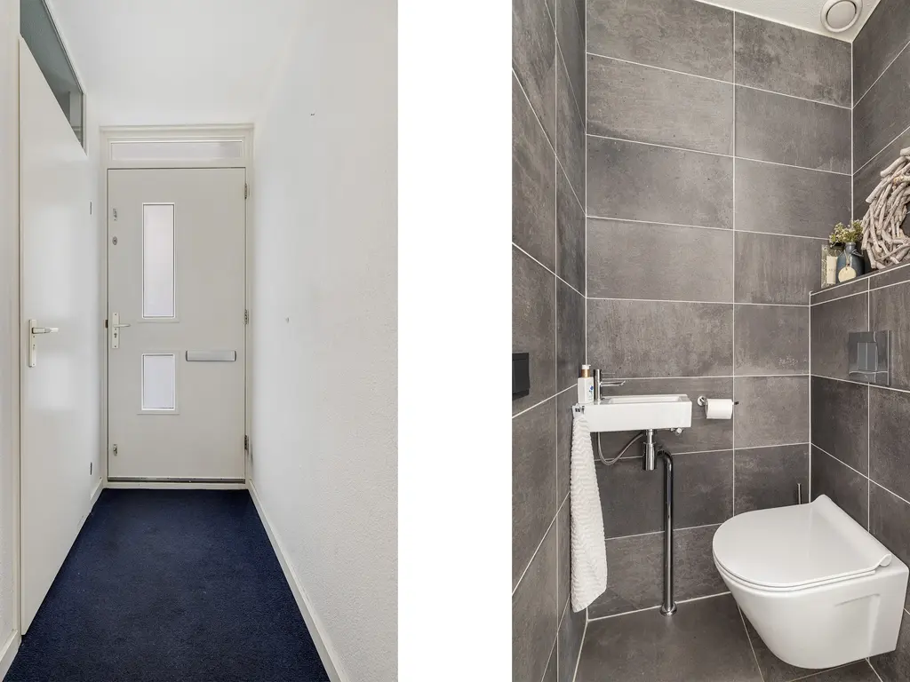 Bij binnenkomst valt direct de ruimte en het licht op. De royale hal biedt toegang tot de garage, het toilet en de woonkamer.