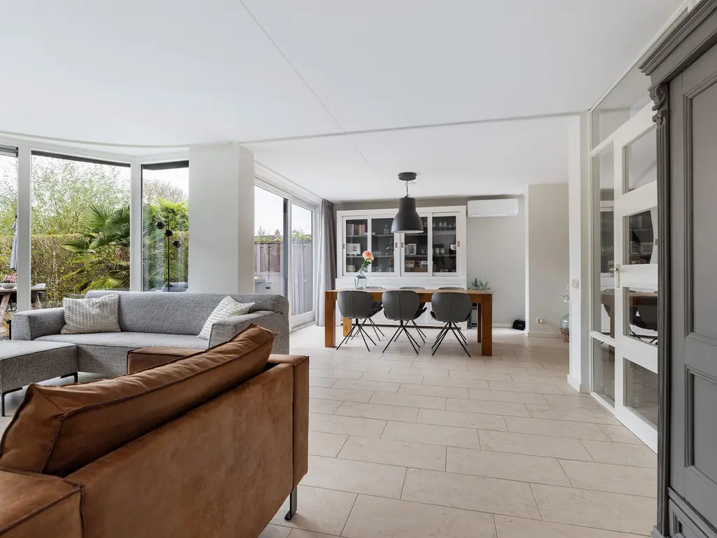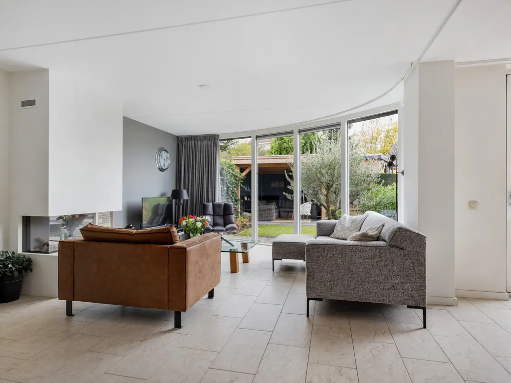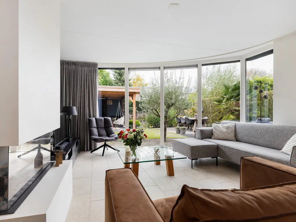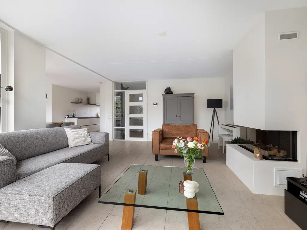 De glazen paneeldeur geeft toegang tot de sfeervolle woonkamer. De lichte plavuizen vloer met vloerverwarming zorgt voor comfort, terwijl de grote raampartijen en de ronde glazen pui aan de tuinzijde een prachtig uitzicht bieden over de achtertuin. De moderne schouw met gashaard en airconditioning (koeling/verwarming) maken het geheel compleet.