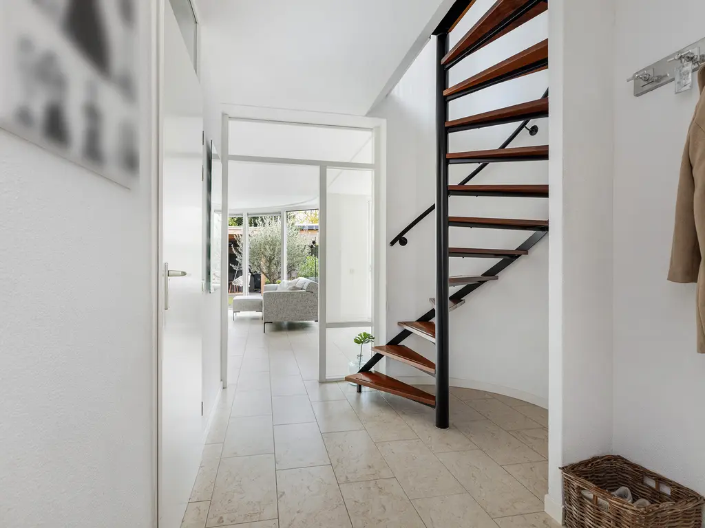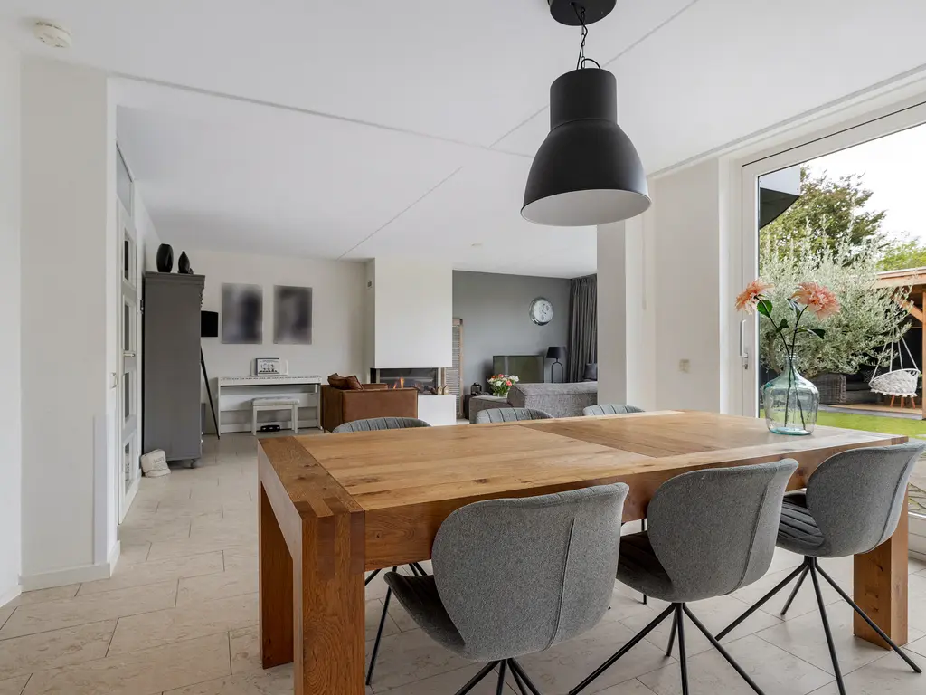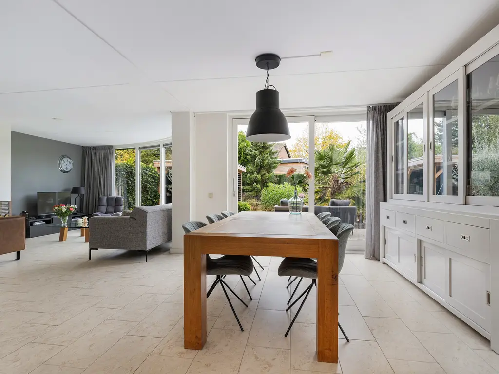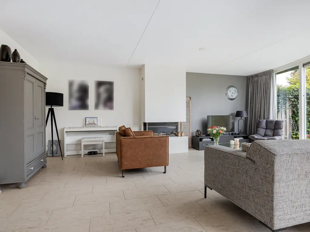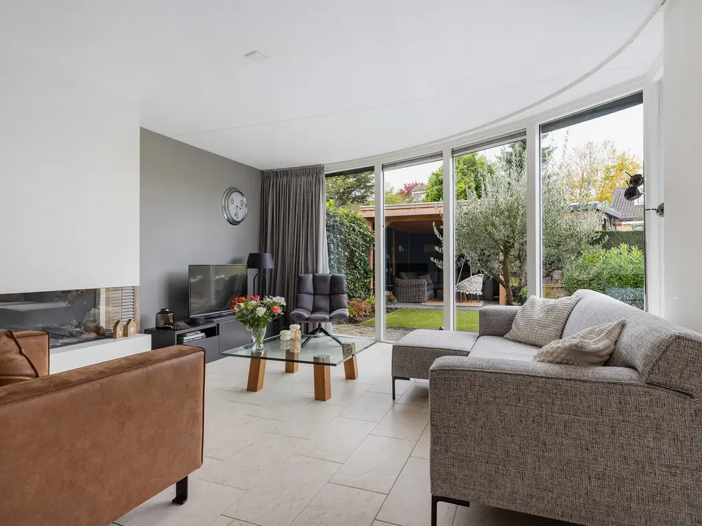 De glazen paneeldeur geeft toegang tot de sfeervolle woonkamer. De lichte plavuizen vloer met vloerverwarming zorgt voor comfort, terwijl de grote raampartijen en de ronde glazen pui aan de tuinzijde een prachtig uitzicht bieden over de achtertuin. De moderne schouw met gashaard en airconditioning (koeling/verwarming) maken het geheel compleet.
