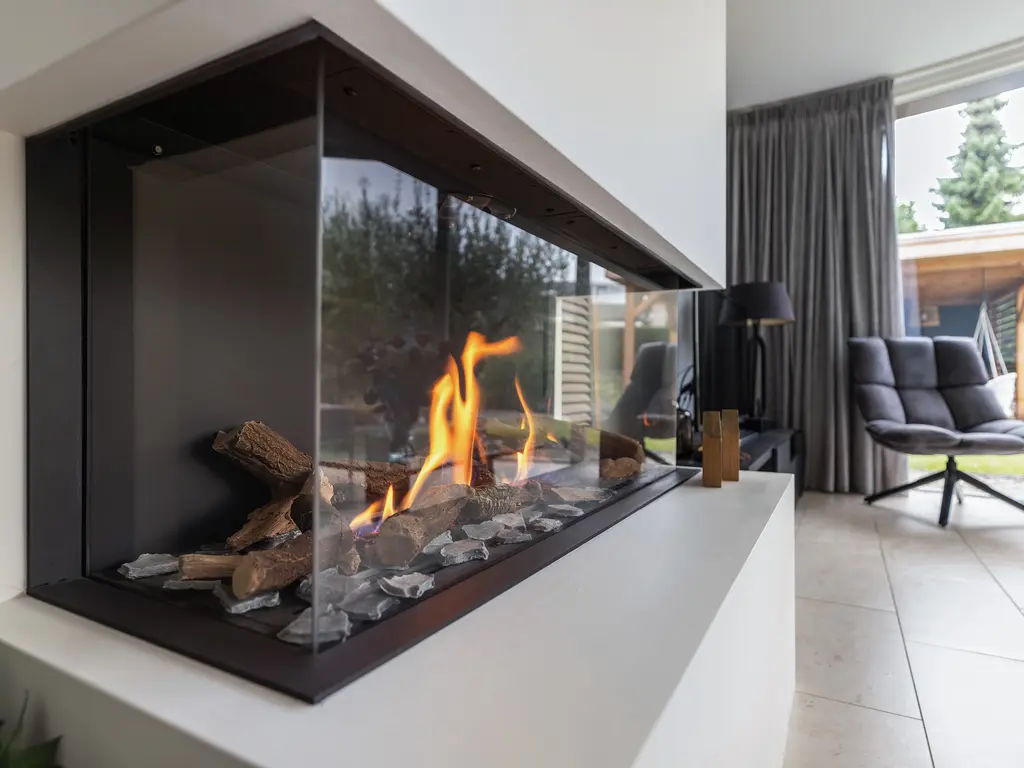 Lichte woonkamer met vloerverwarming, gashaard en airconditioning (koelen en verwarmen)