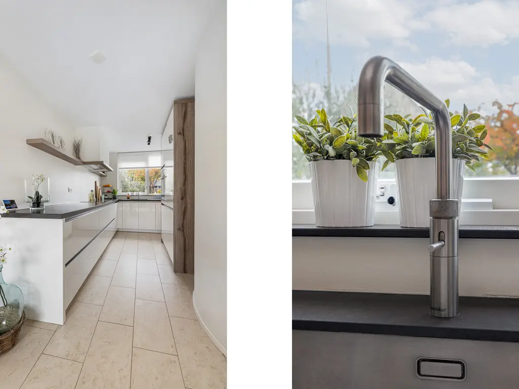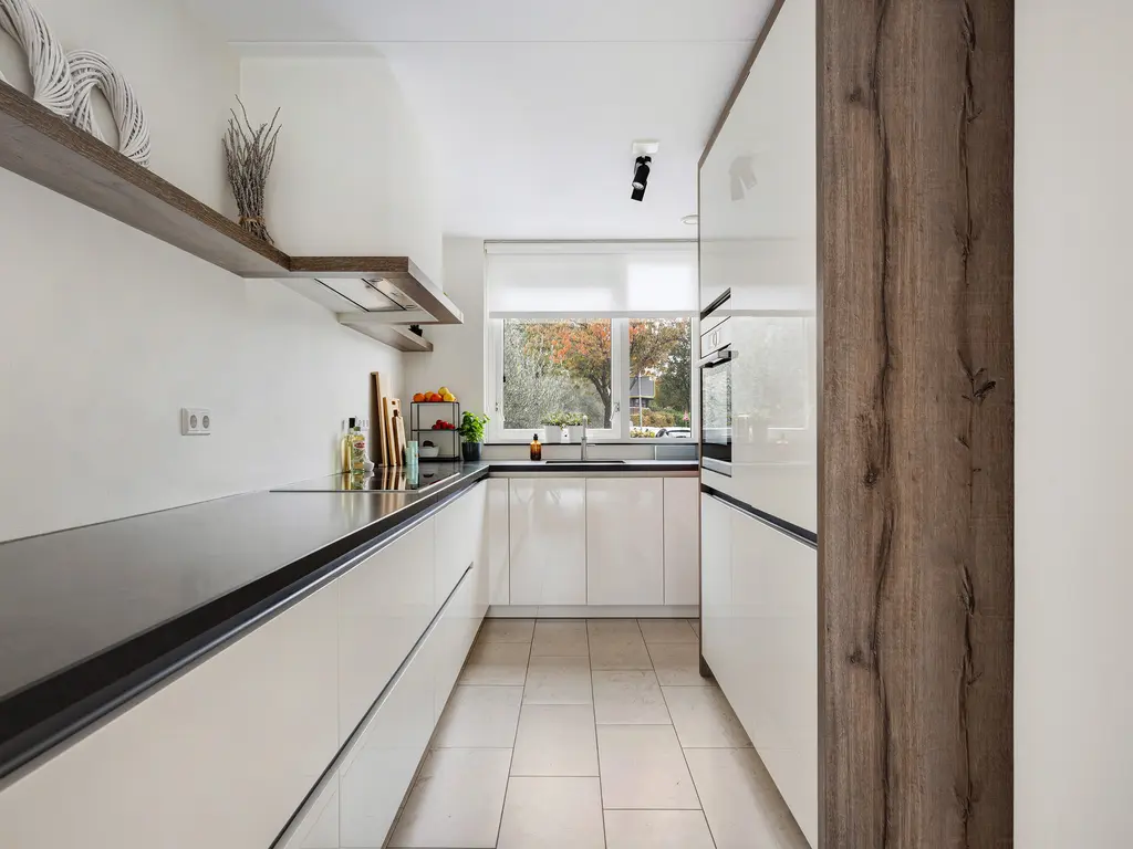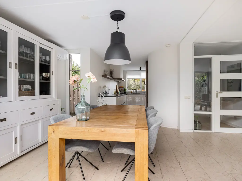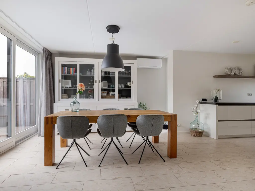 Het eetgedeelte grenst aan de schuifpui naar de tuin (voorzien van elektrisch rolluik), ideaal voor lange zomeravonden. De halfopen keuken aan de voorzijde is luxe uitgevoerd in wit hoogglans met een donkergrijs composiet werkblad. De keuken is voorzien van hoogwaardige inbouwapparatuur, waaronder een combi-oven, koel-vriescombinatie, vaatwasser, 5-pits inductiekookplaat met geïntegreerde afzuigkap, Quooker-kraan, apothekerskast en praktische LeMans-carrouselkast.