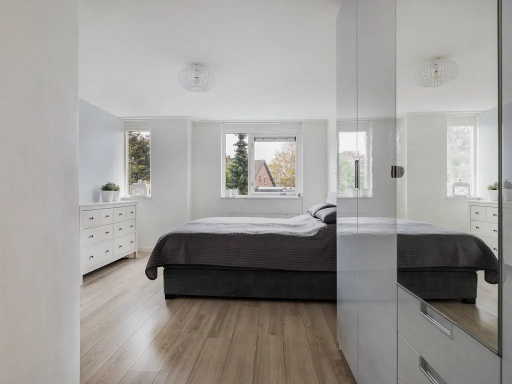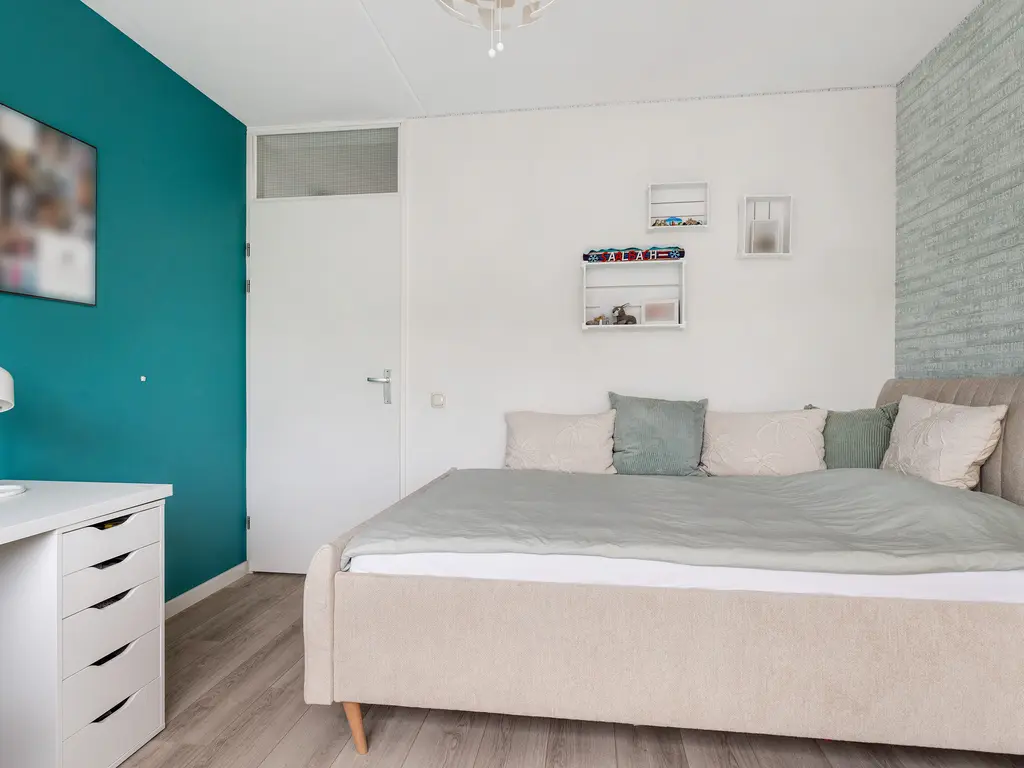 Slaapkamer 2 ligt aan de voorzijde, heeft een vaste kast en toegang tot het balkon.