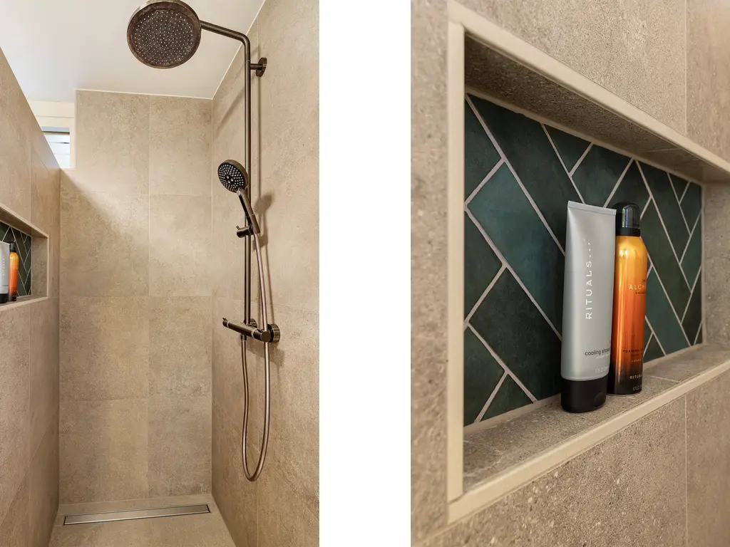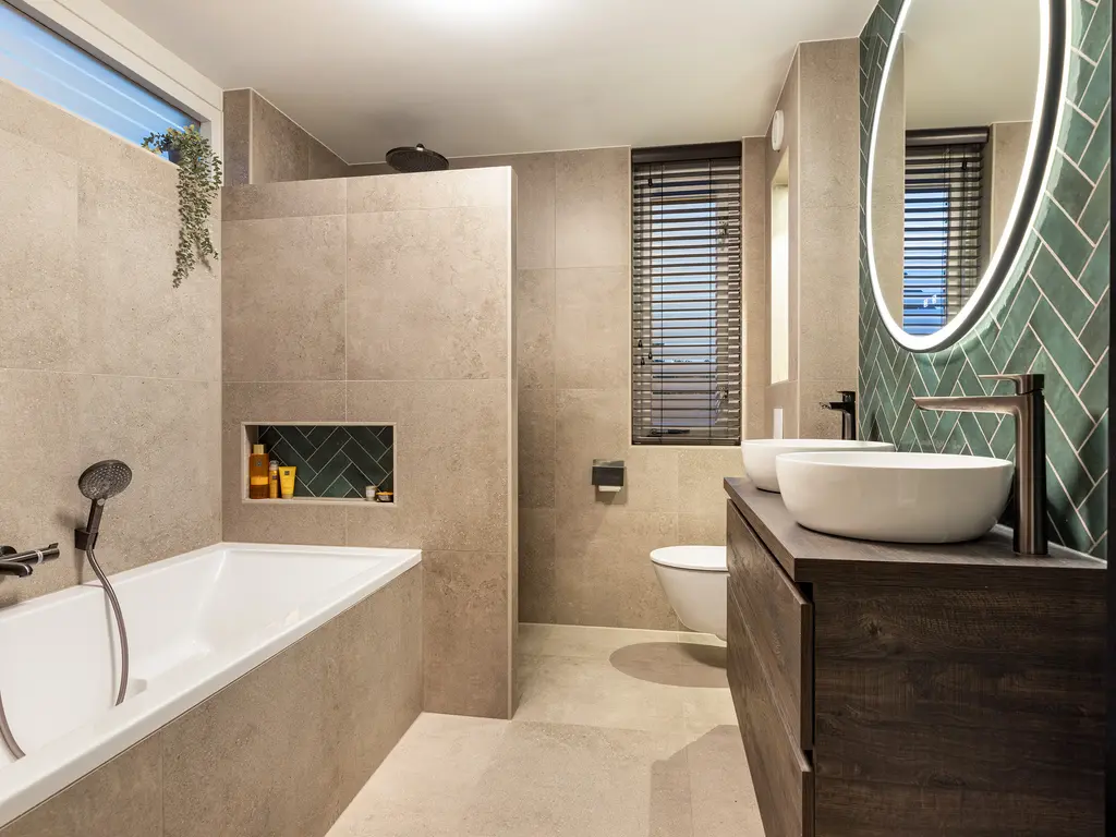 Slaapkamer 1 ligt aan de achterzijde en beschikt over een ruime kastenwand en een luxe badkamer en suite. Deze badkamer is uitgevoerd in warme beige tinten en voorzien van een ligbad, inloopdouche, hangend toilet, dubbel wastafelmeubel met twee waskommen, verwarmde en verlichte spiegel en stijlvolle gunmetal kranen.
