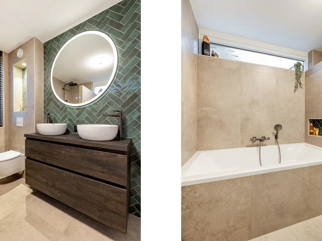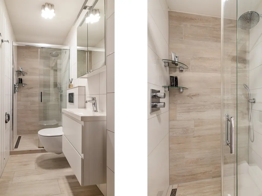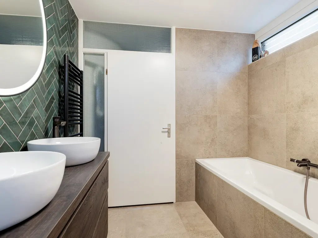 De tweede badkamer is volledig betegeld in wit/beige tinten en voorzien van een inloopdouche, wastafelmeubel met spiegelkast en hangend toilet – perfect voor gezinnen of gasten.