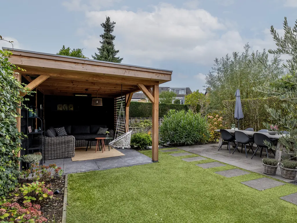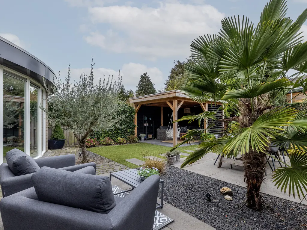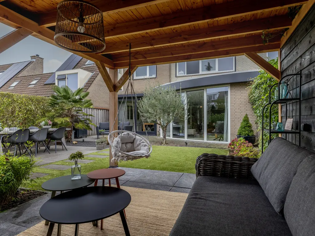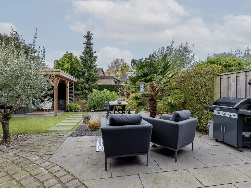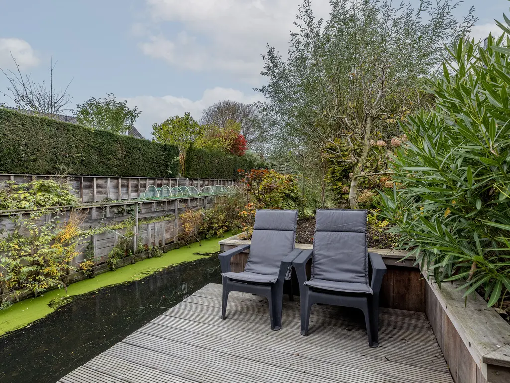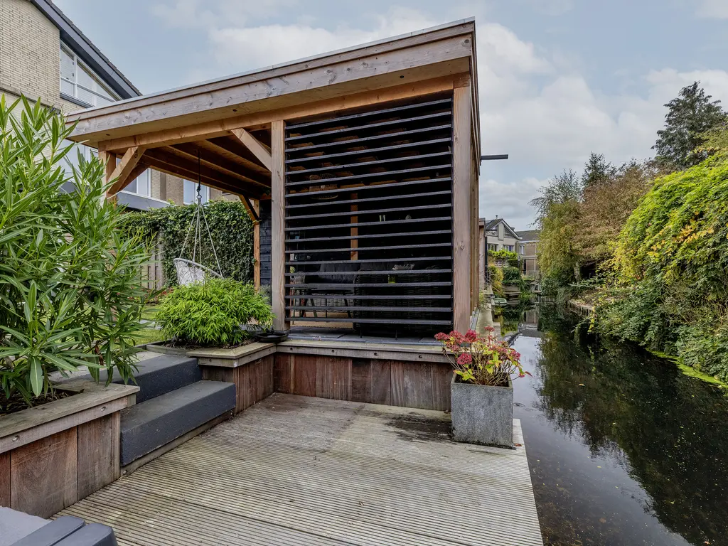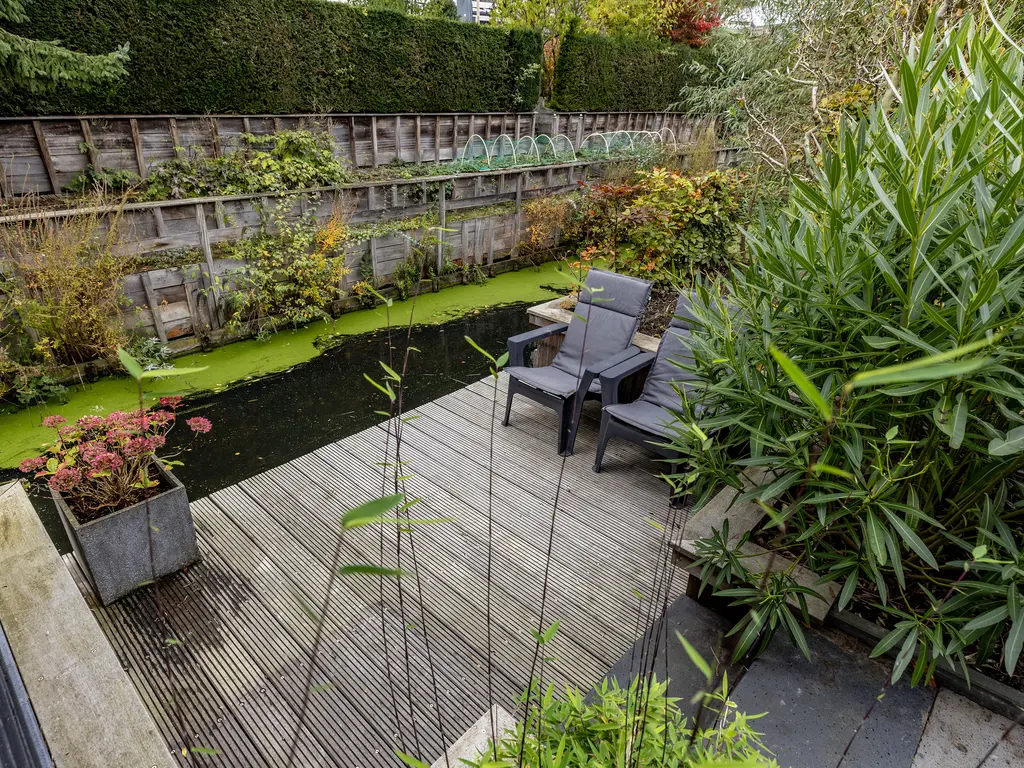 De achtertuin ligt op het westen en is een ware oase van rust. Fraai aangelegd met kunstgras, volwassen groen – waaronder een olijfboom, palm en perenboom – en een recent vernieuwde beschoeiing en vlonderterras aan de waterkant. Achter in de tuin bevindt zich een sfeervolle veranda van Douglas hout, perfect voor een loungehoek met uitzicht over de gezellige tuin.
