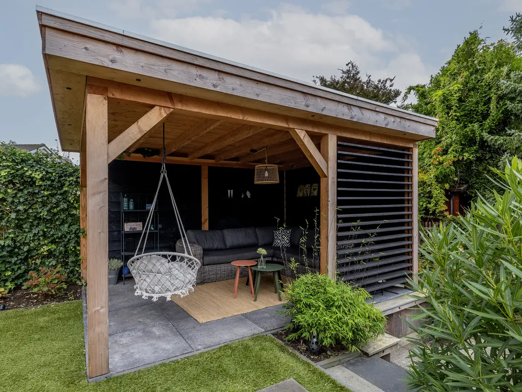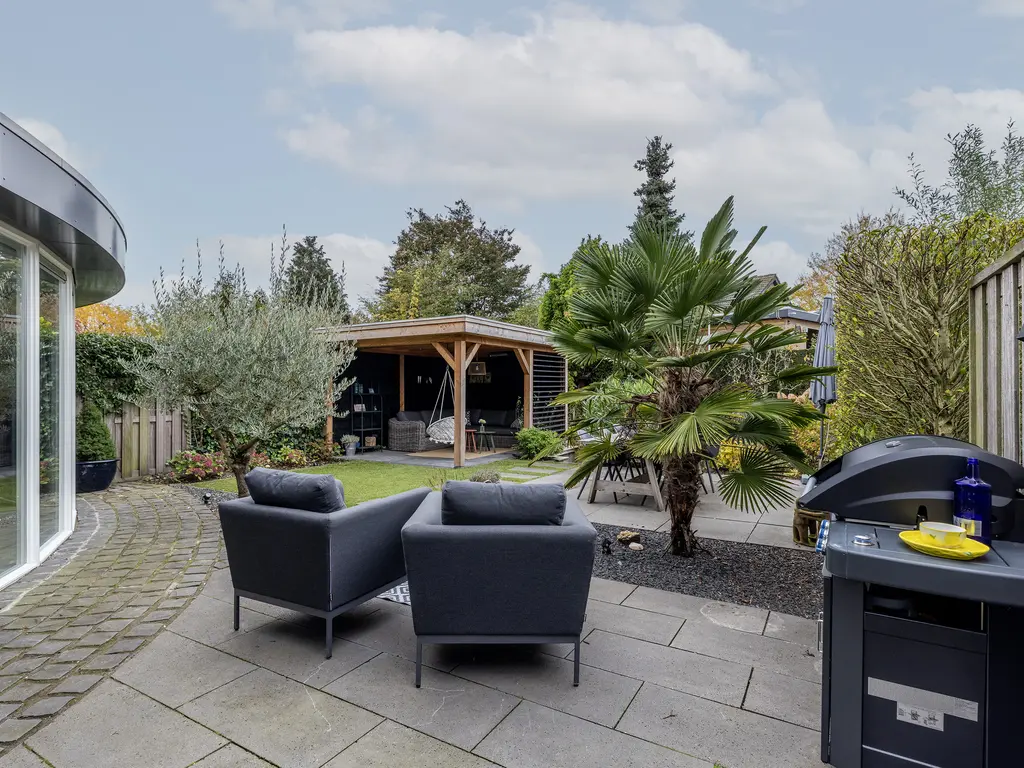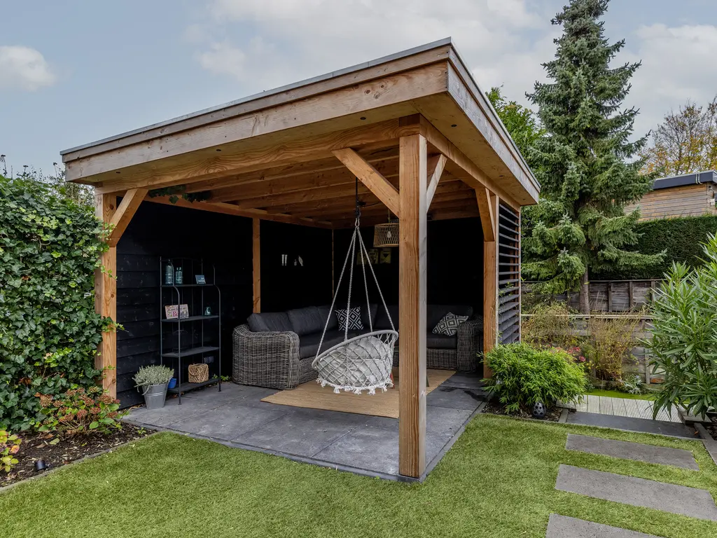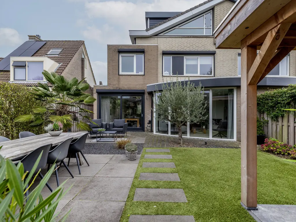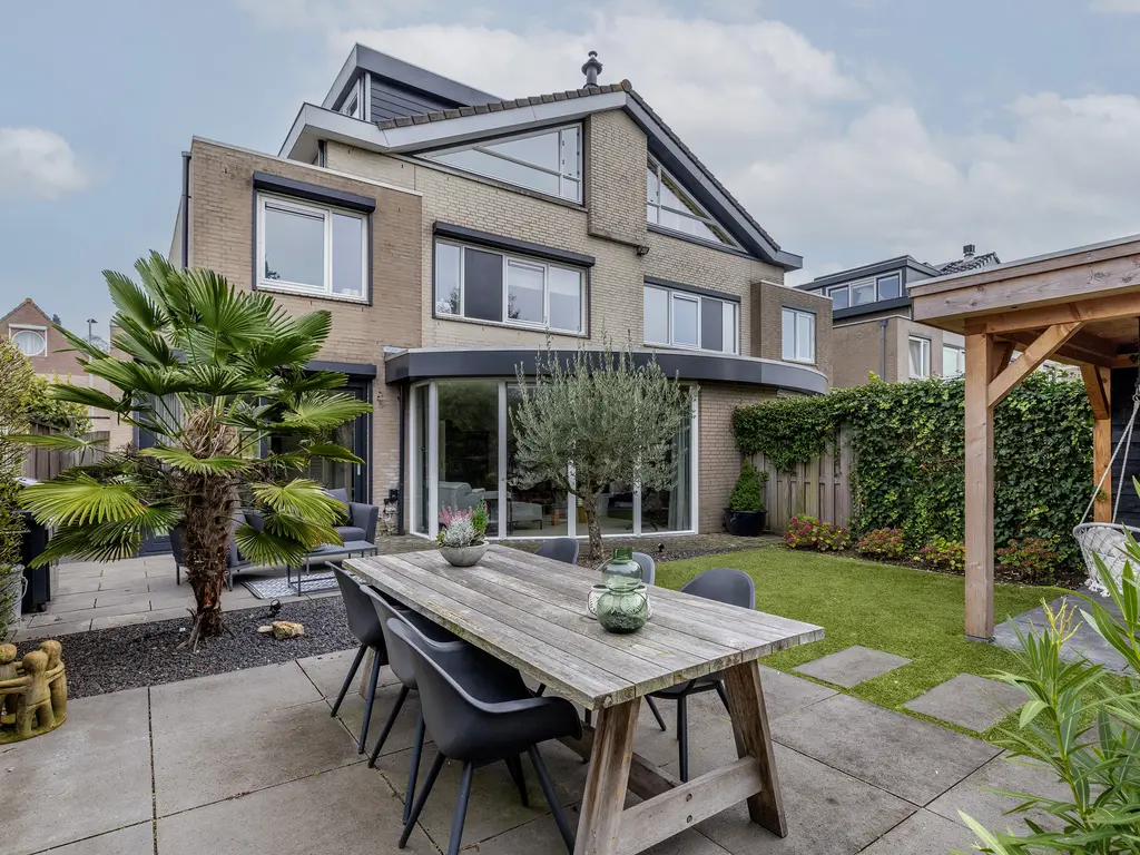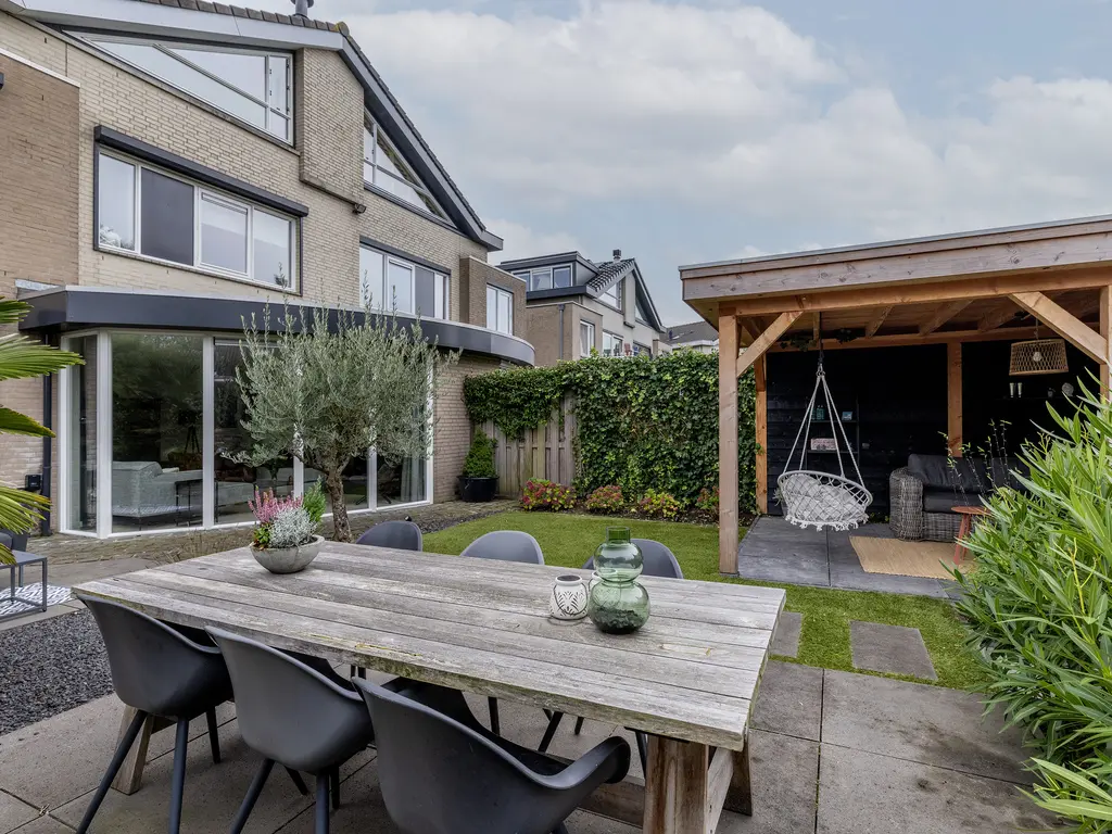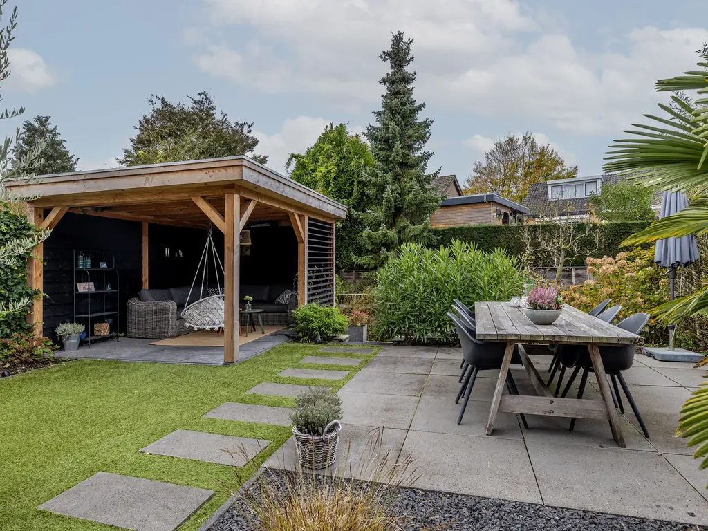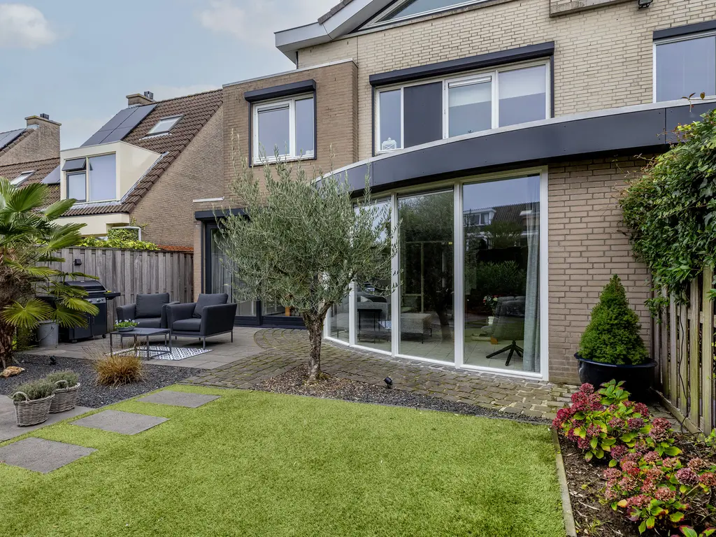 De achtertuin ligt op het westen en is een ware oase van rust. Fraai aangelegd met kunstgras, volwassen groen – waaronder een olijfboom, palm en perenboom – en een recent vernieuwde beschoeiing en vlonderterras aan de waterkant. Achter in de tuin bevindt zich een sfeervolle veranda van Douglas hout, perfect voor een loungehoek met uitzicht over de gezellige tuin.
