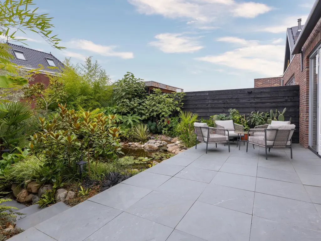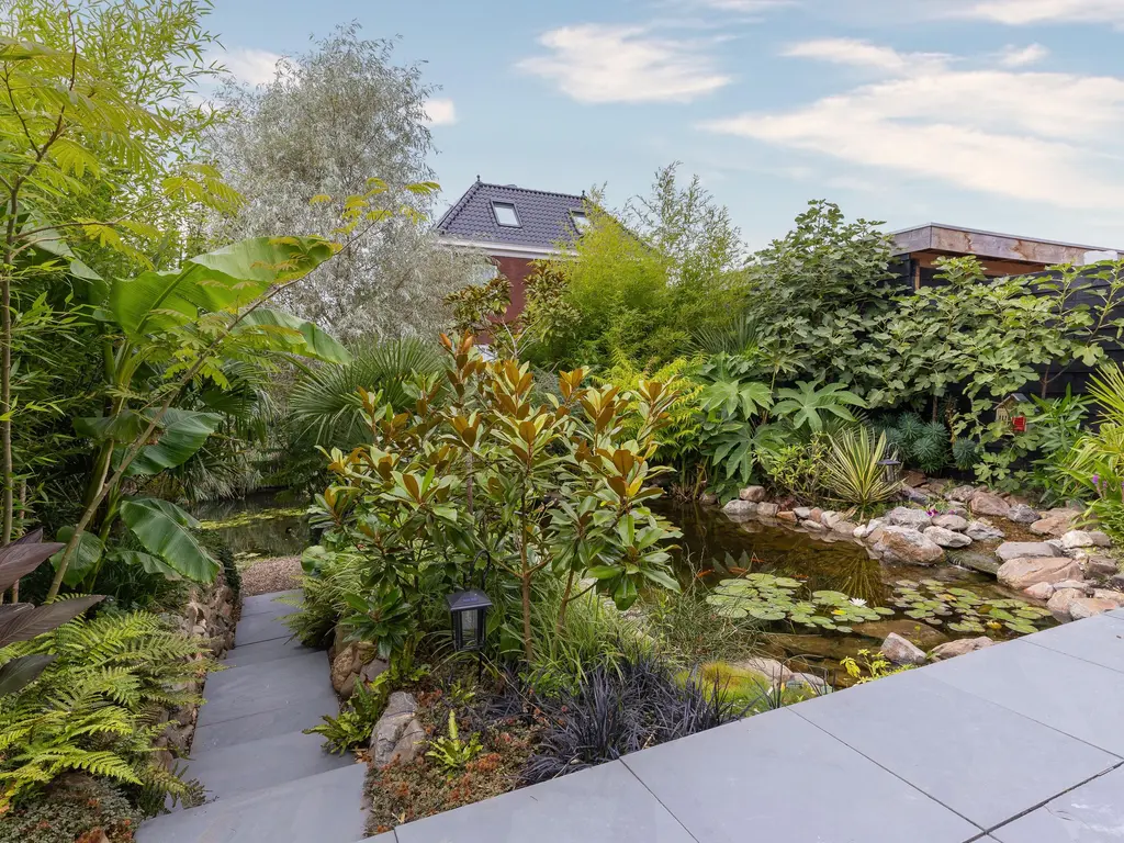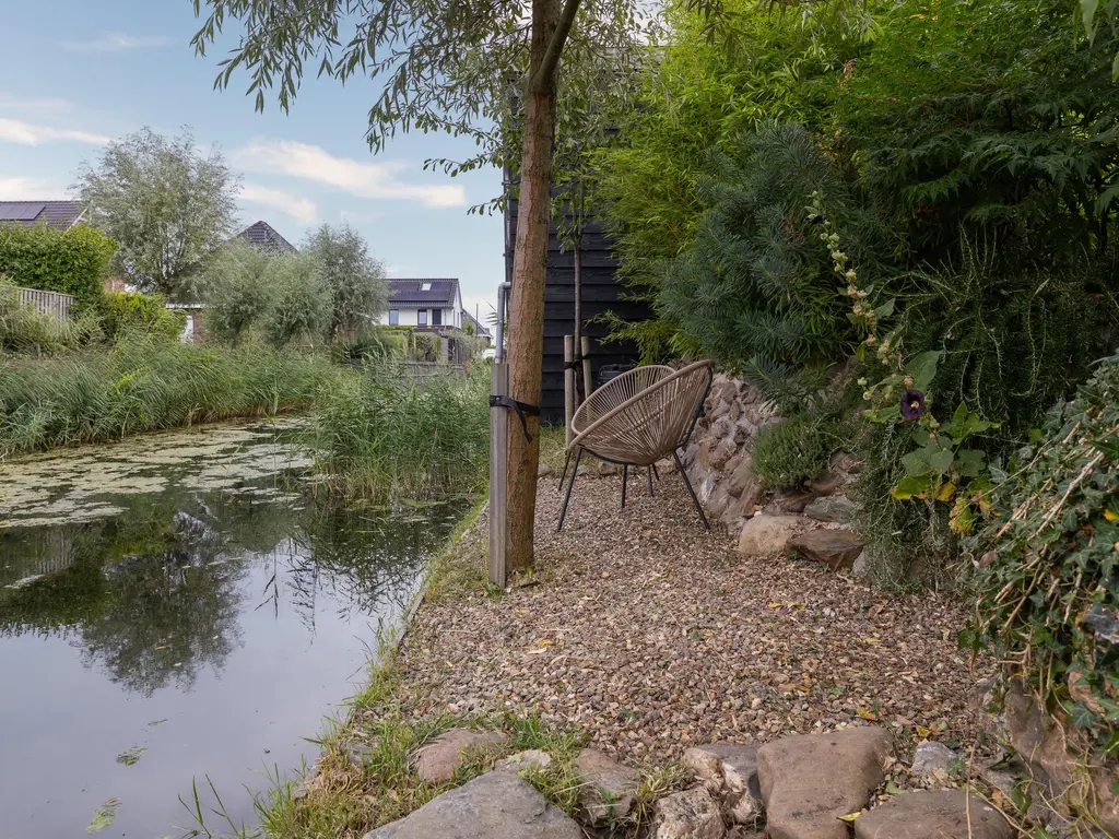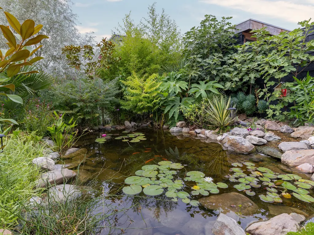 De fraai aangelegde tuin is een echte blikvanger met een rustgevende vijver en smaakvolle beplanting die een mediterrane sfeer oproept – alsof je in het buitenland bent. Gelegen aan het water en op het westen georiënteerd, geniet je hier elke avond van de schitterende ondergaande zon. Een perfecte plek om te ontspannen, te borrelen met vrienden of gewoon te genieten van de natuur en het water.