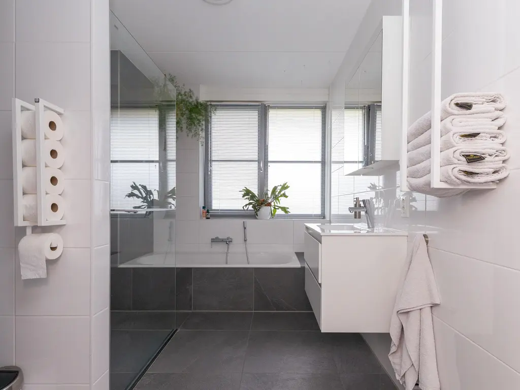De luxe en fraai afgewerkte badkamer is een echte wellness-oase met een inloopdouche, een ligbad, een stijlvol badkamermeubel en een modern toilet. Voor extra comfort is de gehele verdieping voorzien van vloerverwarming, wat zorgt voor een aangename warmte, zelfs op koude dagen.