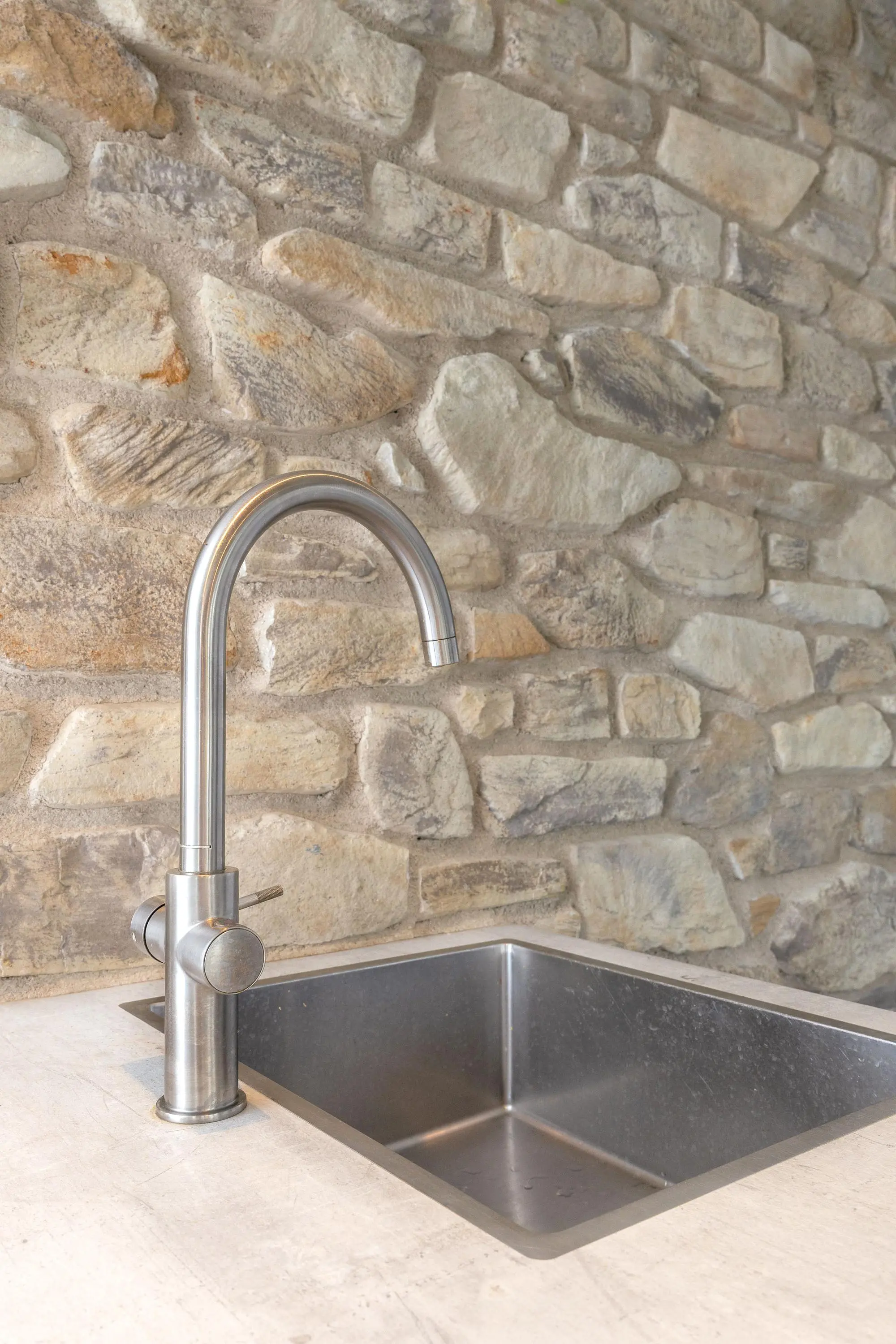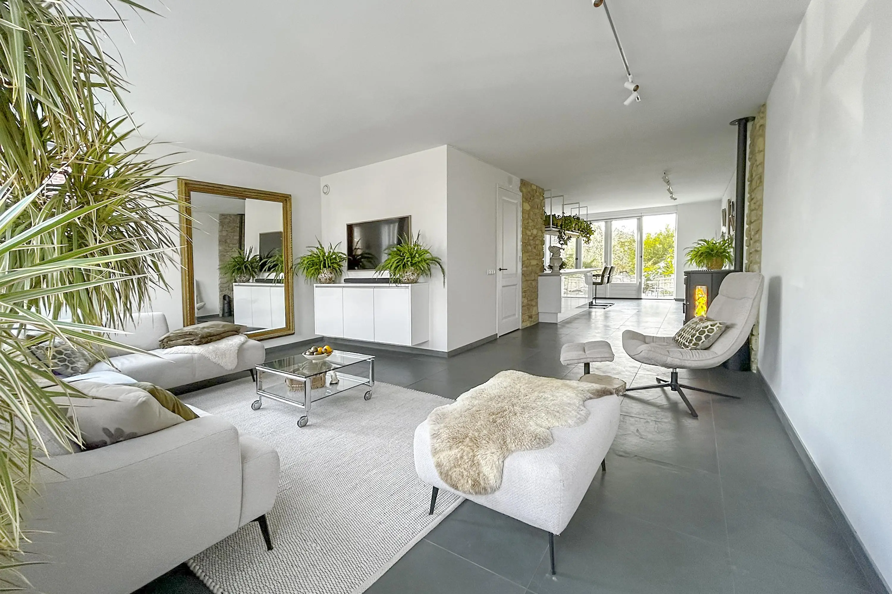 De ruime woonkamer ademt sfeer en comfort. Grote raampartijen zorgen voor een zee van licht, terwijl de vloerverwarming en de gezellige pelletkachel uitnodigen tot ontspannen avonden. Dankzij het uitgebalanceerde lichtplan ontstaat altijd de juiste sfeer – perfect afgestemd op zowel rustige avonden als gezellige momenten met vrienden.