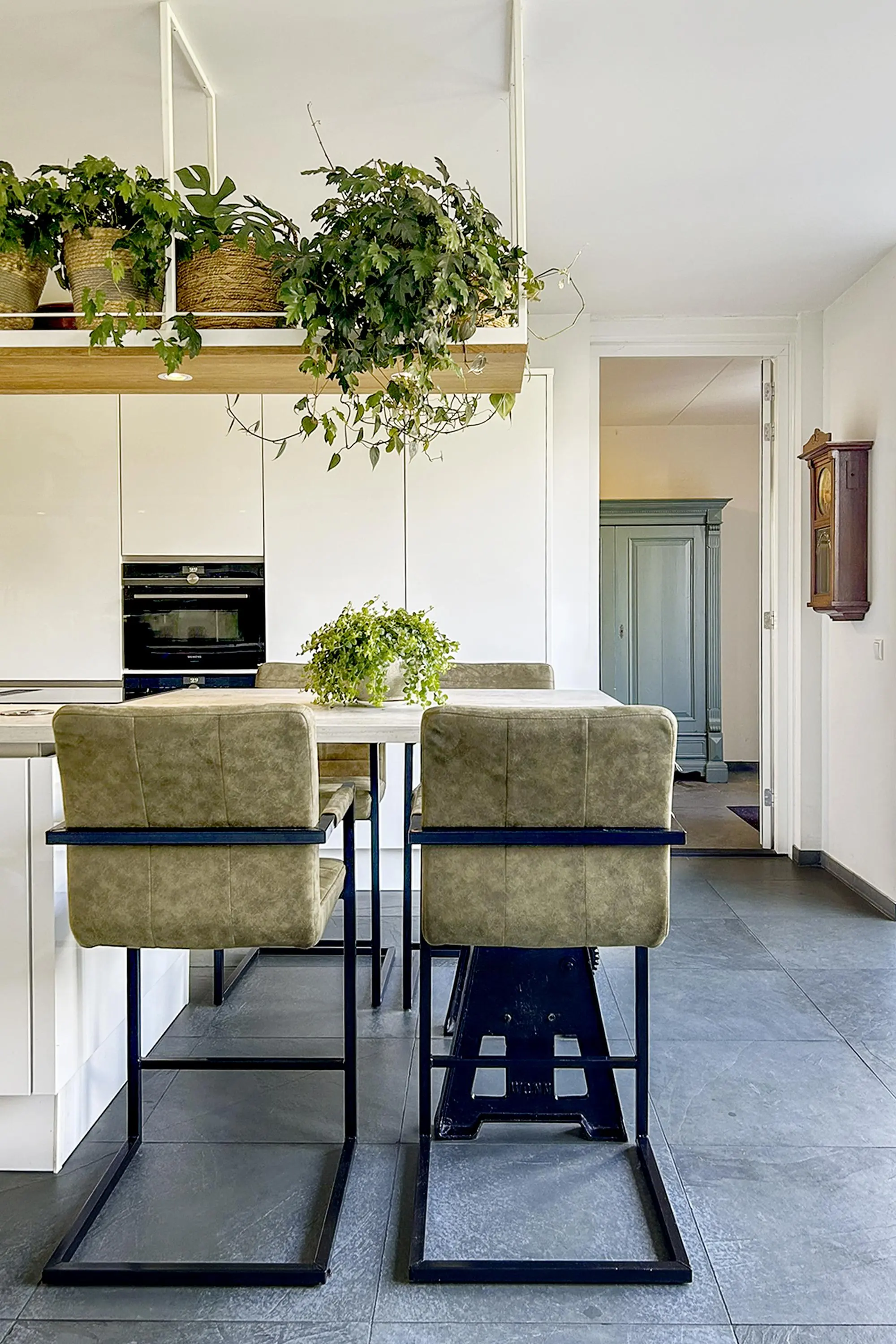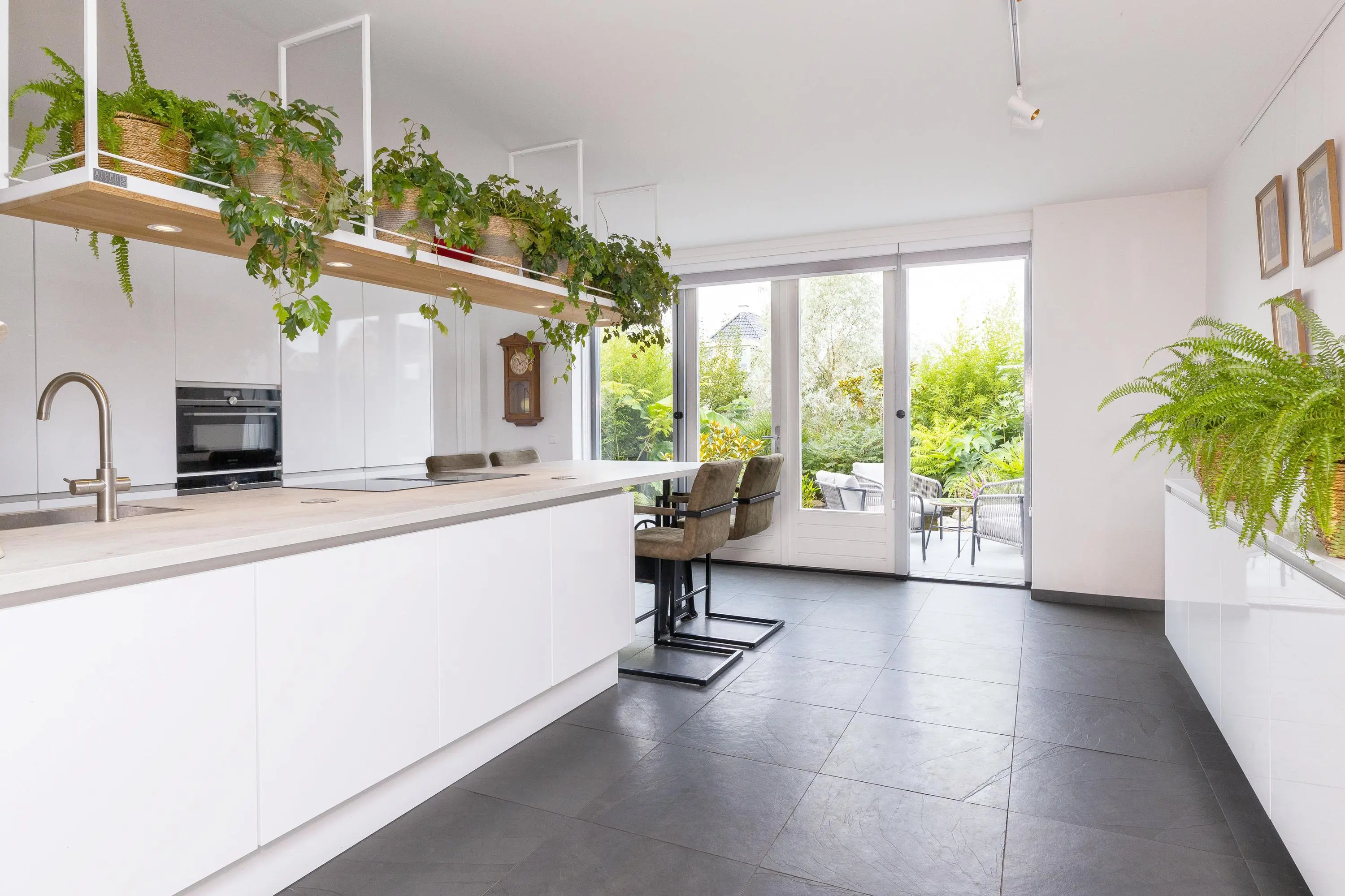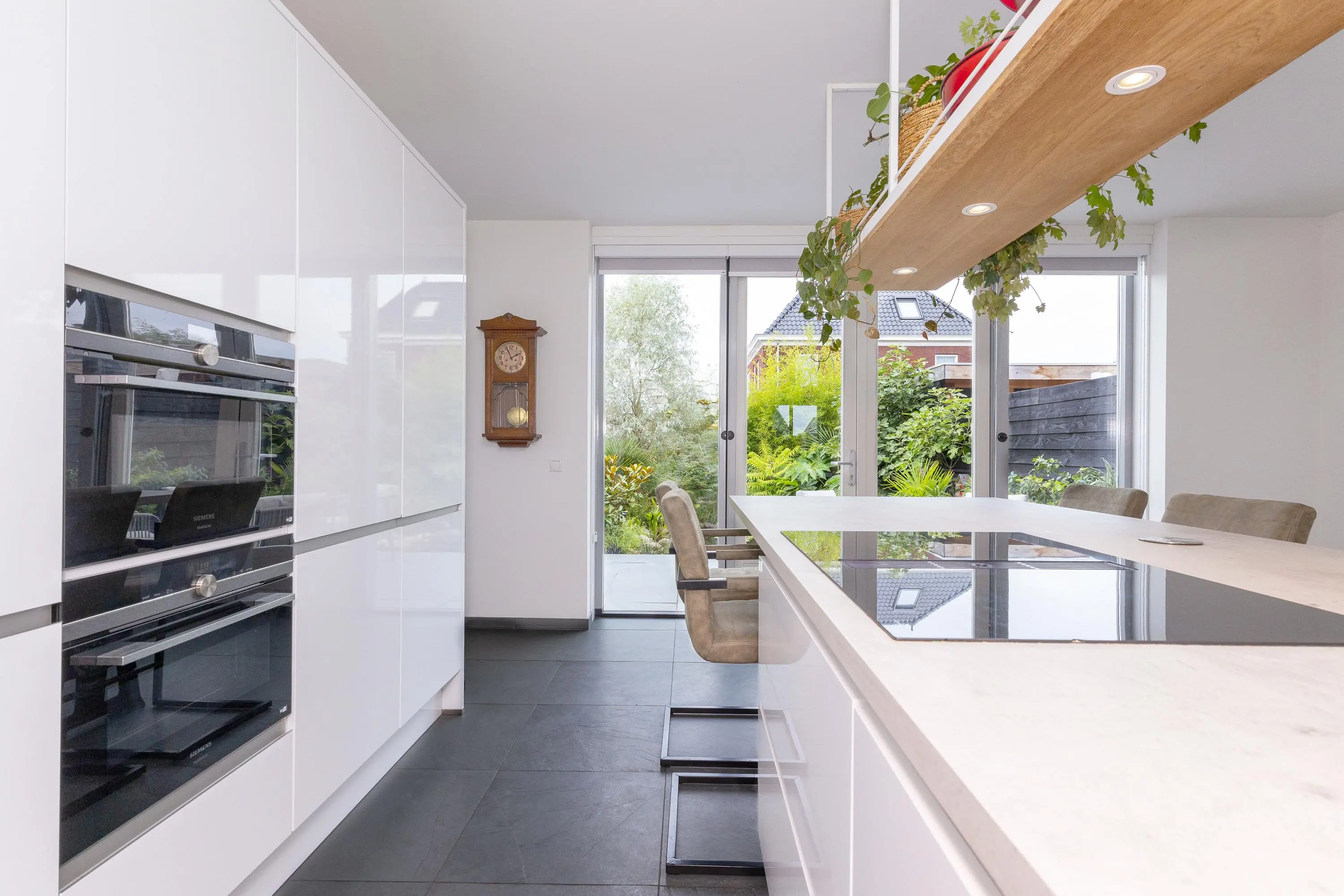 De open keuken vormt het kloppend hart van het huis. Met een groot kookeiland, hoogwaardige Siemens-apparatuur en een stijlvolle afwerking met vaste kastenwand is dit dé plek om samen te zijn. Via de openslaande deuren loop je direct de fraai aangelegde tuin in – binnen en buiten vloeien hier natuurlijk in elkaar over.