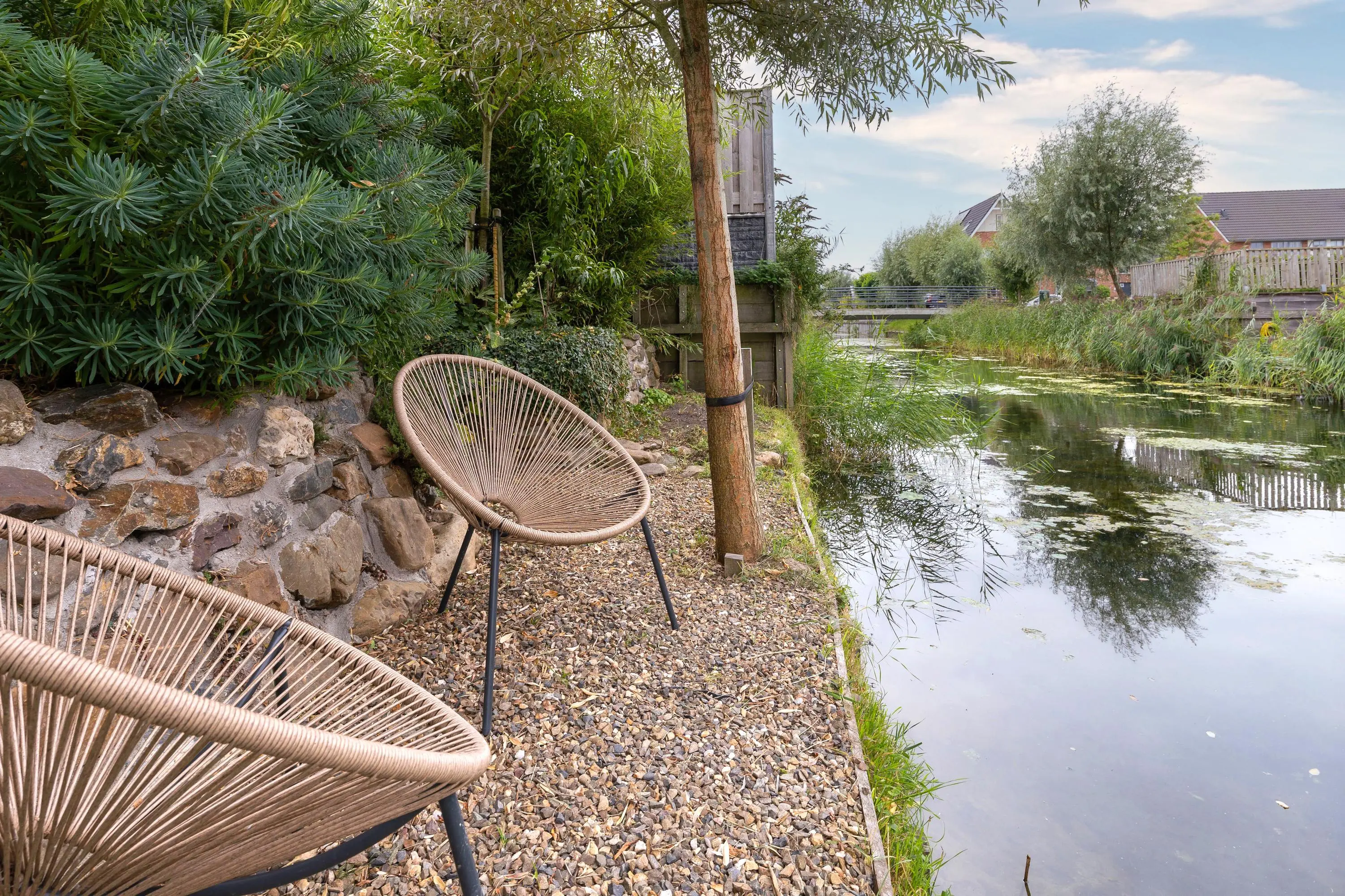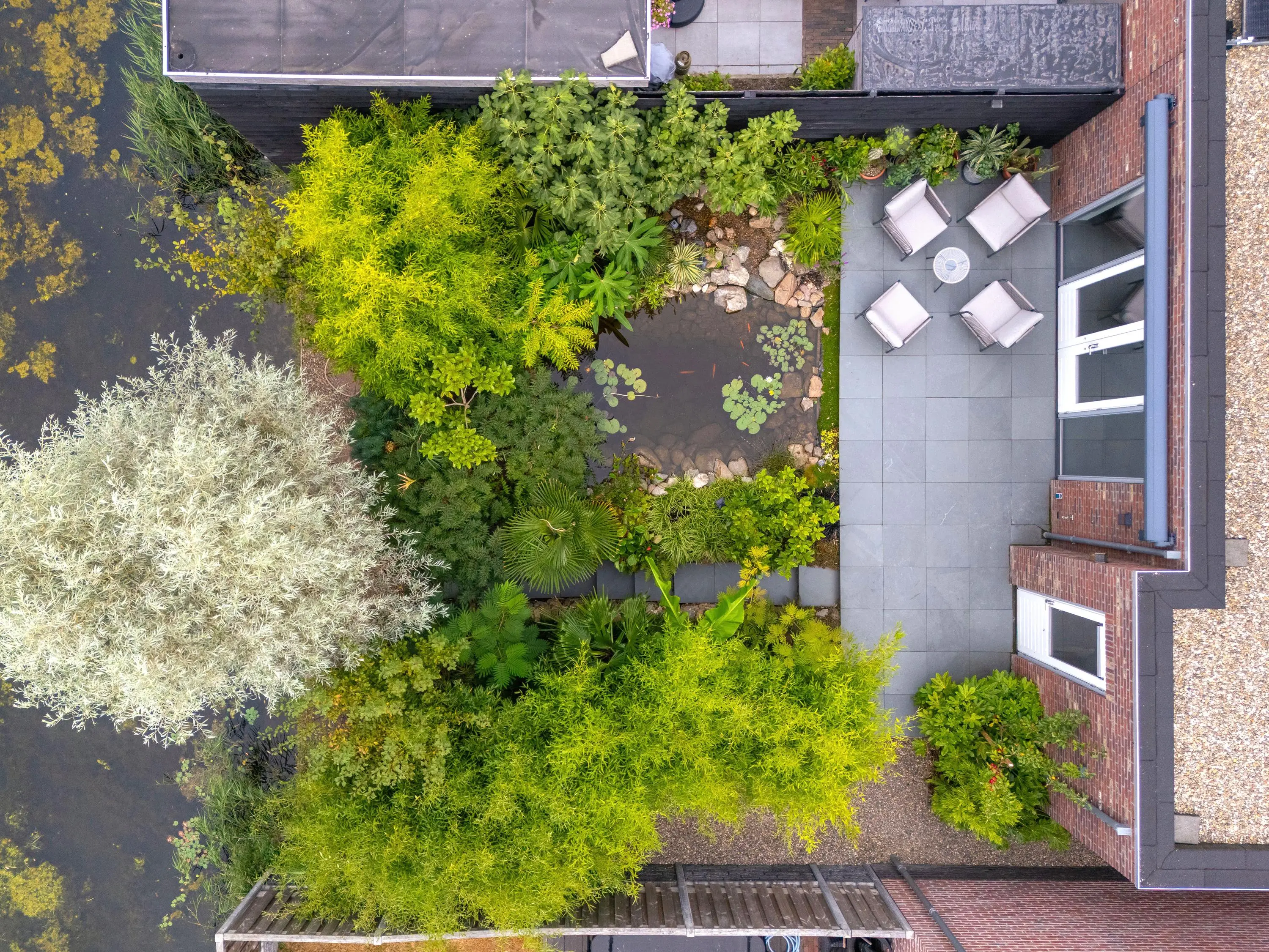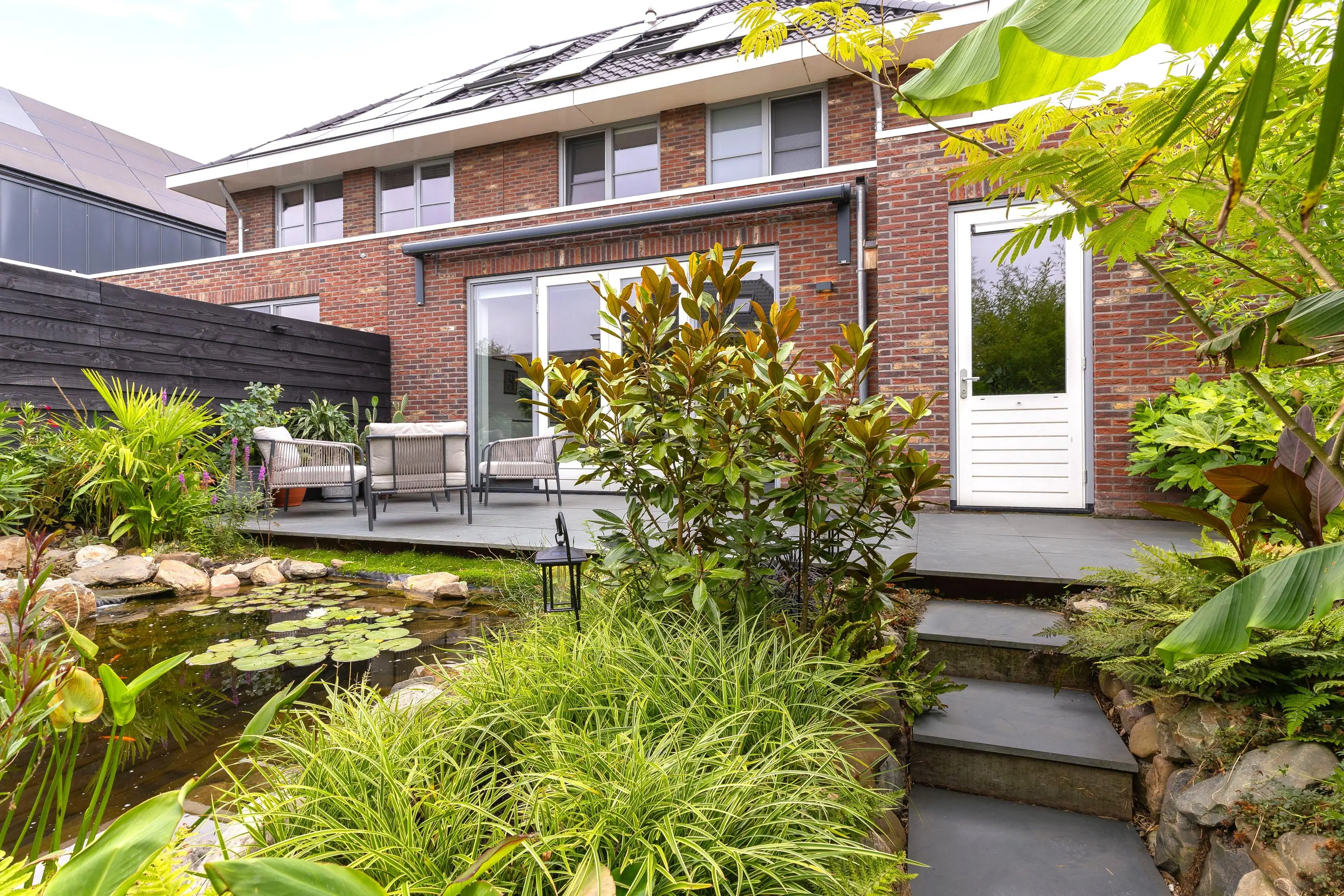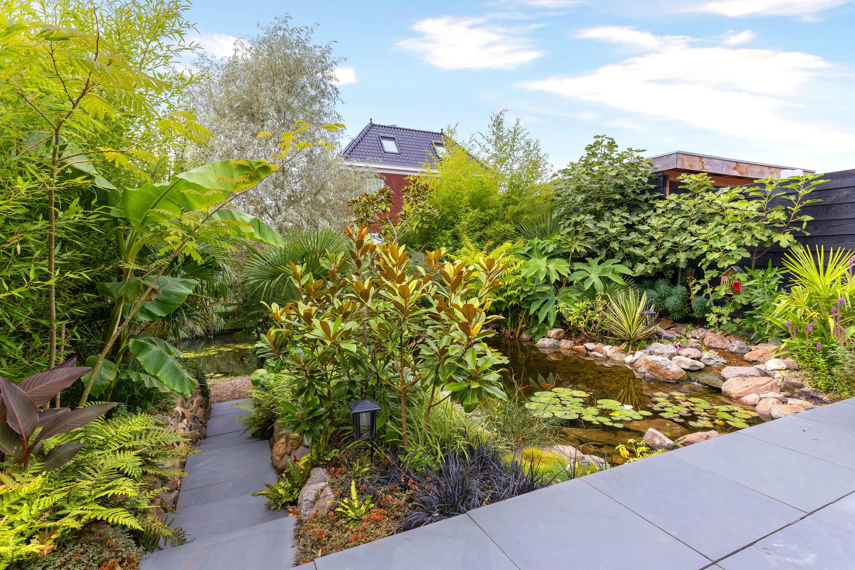 De tuin is een ware oase van rust. Met een sfeervolle vijver, mediterrane beplanting en ligging aan het water waan je je hier elke dag een beetje op vakantie. Door de gunstige ligging op het westen geniet je ’s avonds van de zonsondergang – perfect voor een borrel met vrienden of een rustig moment met een boek. De tuin is bereikbaar via de openslaande deuren én de zijkant van de woning, wat zorgt voor extra gemak.