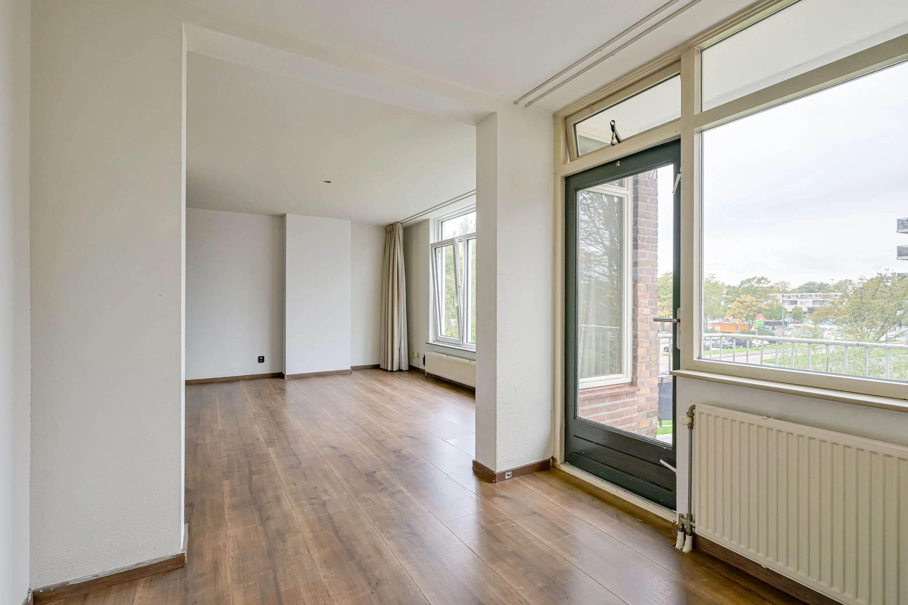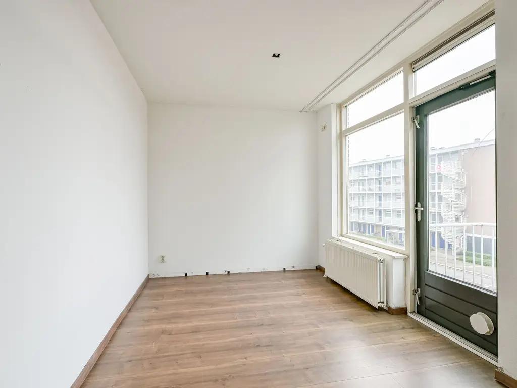 De woonkamer is aan de achterzijde van het appartement gelegen. Het leuke van dit appartement is dat de woonkamer eigenlijk in tweeën is verdeeld. Zo is er ruimte voor een fijne zithoek om heerlijk te loungen en een prima ruimte voor een royale eethoek. De woonkamer is voorzien van een grote raampartij welke zorgt voor veel lichtinval. Vanuit de woonkamer heeft u uitzicht over het openbaar groen en kijkt u aan de andere kant uit richting het winkelcentrum. Zo is er altijd wel iets te zien. Leuke toch! De eethoek geeft u de mogelijkheid voor het plaatsen van een grote tafel met stoelen. Vanuit dit gedeelte heeft u toegang tot het balkon. Het balkon is gelegen op het westen zodat u hier einde middag van de zon kunt genieten. Het zicht op het openbaar groen maakt het plaatje compleet.