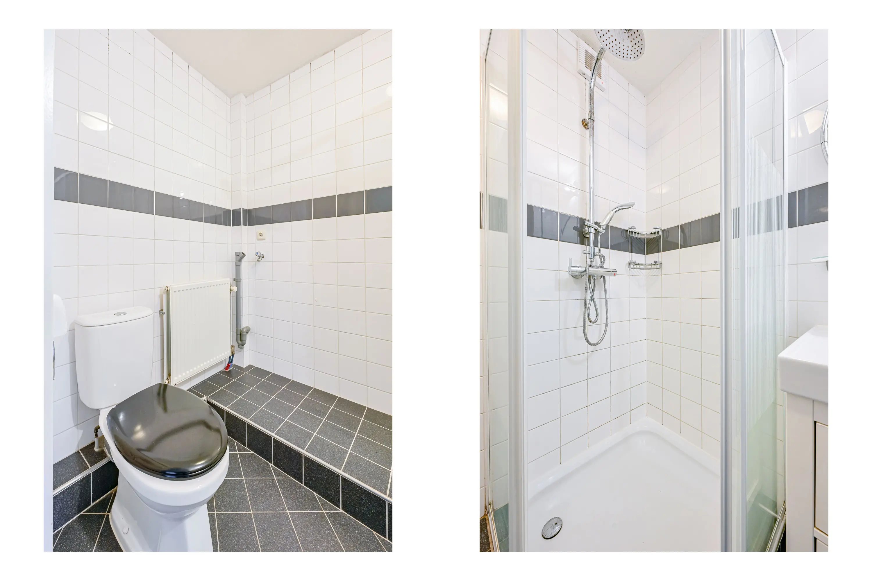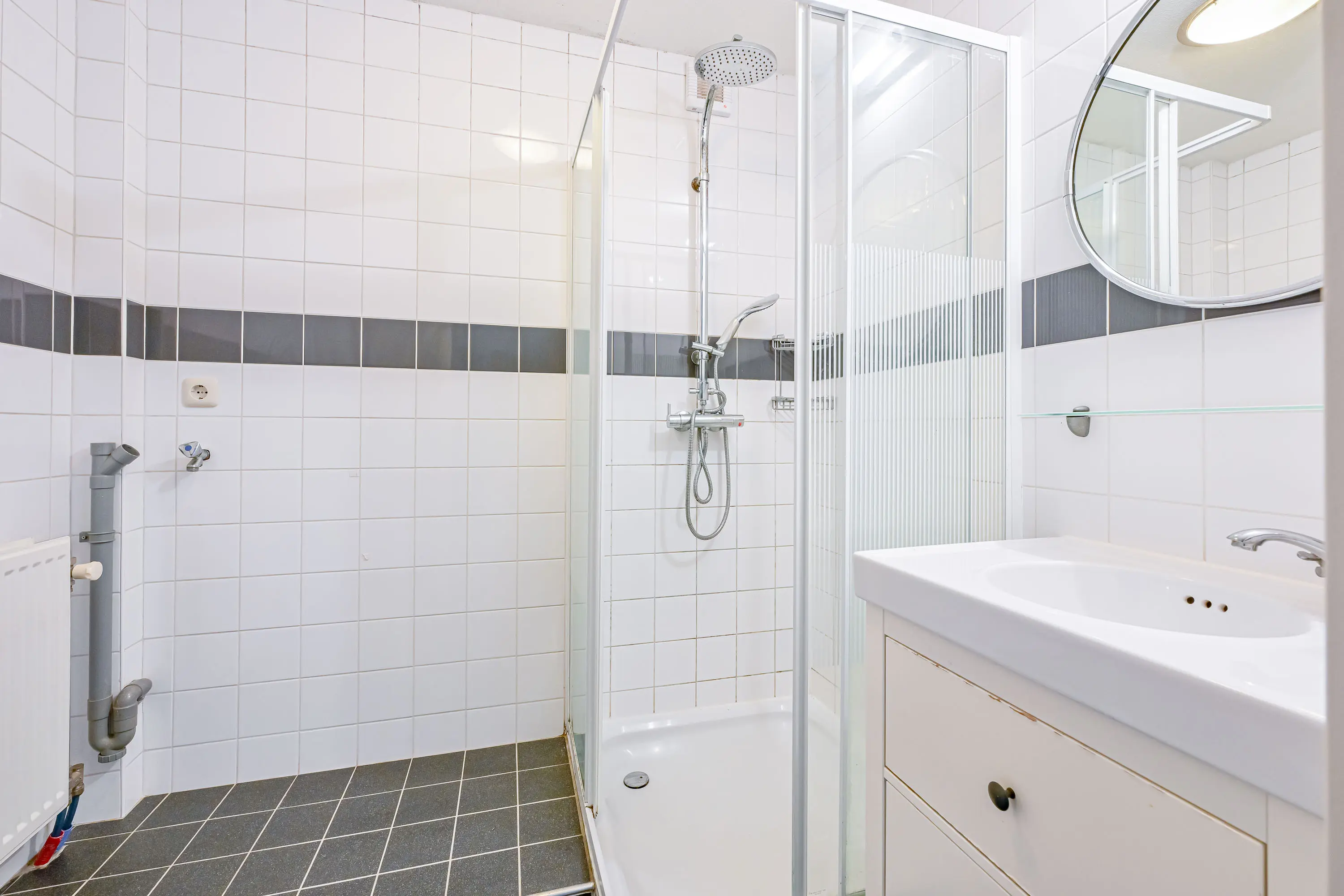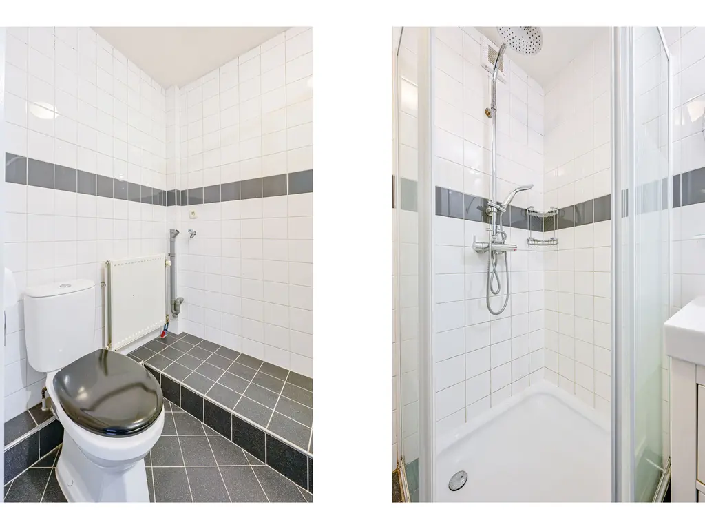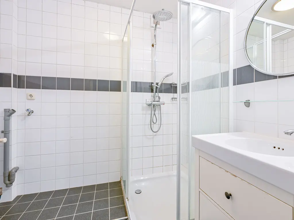 De badkamer is te bereiken vanuit de hal. Hier vindt u een douchecabine, wastafel met meubel, toilet en de aansluitingen voor wasmachine en droger.