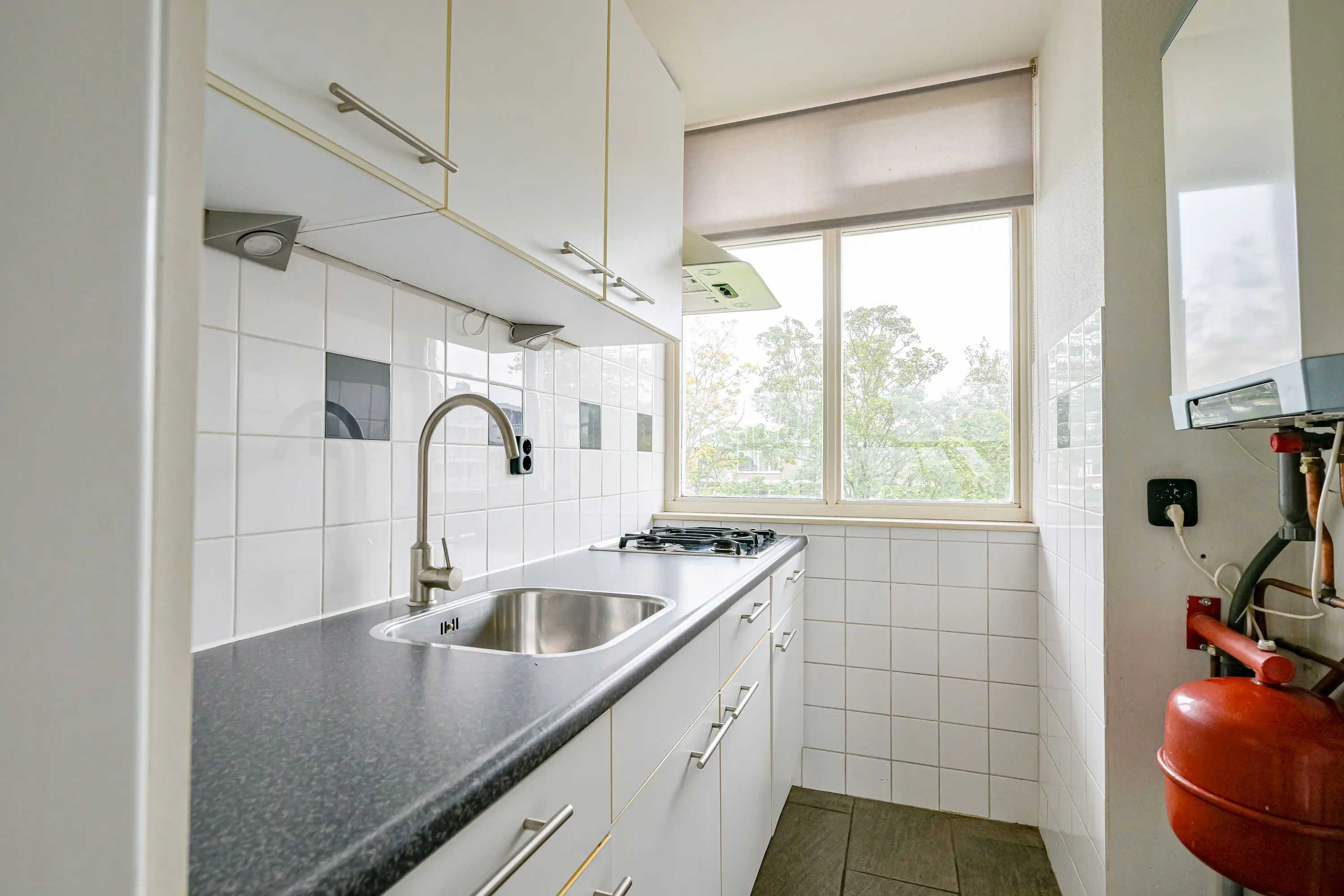 De keuken is aan de voorzijde van het appartement gesitueerd en uitgevoerd in een lichte kleurstelling. U heeft hier de beschikking over een gas-kookplaat, vaatwasser, koel-vriescombinatie en een afzuigkap. Verder is hier voldoende ruimte voor al uw keukengerei.