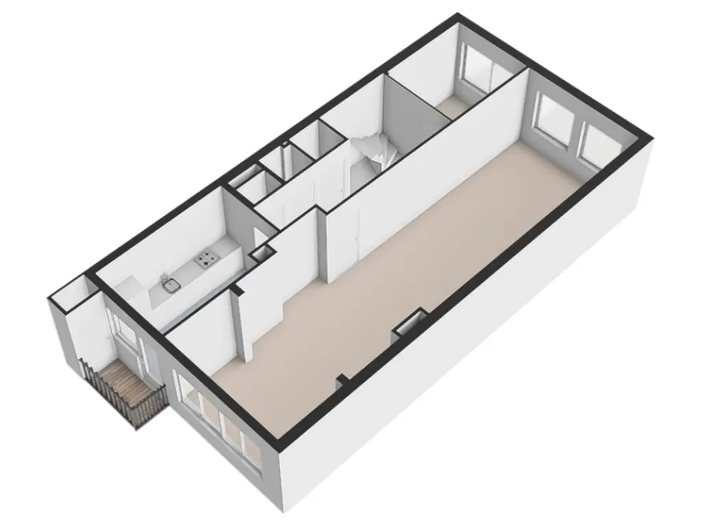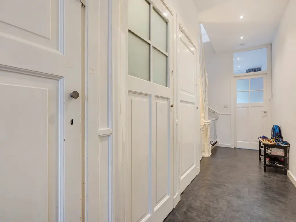 Entrance at street level, hallway with meter cupboard and internal stairs to the living area. First floor. Landing with toilet and access to all rooms. The living room is very spacious with beautiful ceiling moldings, plastered walls, and large windows, allowing for a wealth of natural light. The kitchen is modernly equipped with a 4-burner gas cooktop, extractor hood, oven, dishwasher, and access to the balcony from the kitchen. The adjacent storage room has a dryer connection. The second storage room is ideal for use as a pantry. There is a neat wall-mounted toilet with a hand basin. At the front of the house, you will find the first (bed)room, which can serve a variety of purposes.