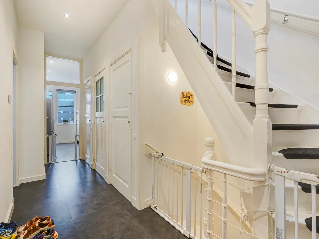 Entree op straatniveau, hal v.v. meterkast en binnentrap naar de woonverdieping. 1e verdieping. Overloop v.v. toilet en toegang tot alle vertrekken. De woonkamer is zeer riant opgezet met prachtige plafondlijsten, gestuukte muren en grote raampartijen waardoor u een zee aan lichtinval ervaart. De keuken is modern uitgerust en voorzien van 4 pits gaskookplaat, afzuigkap, oven, vaatwasser en vanuit de keuken toegang tot het balkon. De naastgelegen berging is v.v. droger aansluiting. De tweede berging is ideaal te gebruiken als voorraadkast. Keurig hangend toilet met fontein. Aan de voorzijde treft u de eerste (slaap)kamer aan welke tal van doeleinden kan hebben.