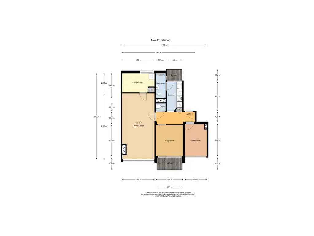 Via de voordeur kom je in de centrale hal die toegang geeft tot de meeste vertrekken. Aan de voorzijde bevinden zich twee ruime slaapkamers en een lichte woonkamer met brede raampartijen. Aan de achterzijde liggen de keuken, de badkamer, een separaat toilet en een extra kamer die diverse gebruiksmogelijkheden biedt: van werkkamer tot walk-in-closet of zelfs als uitbreiding van de woonkamer. De badkamer is via de keuken te bereiken. Aan beide kanten van dit ruim opgezette appartement, bevinden zich balkons. Het balkon aan de voorzijde gelegen (W), is via de slaapkamer te bereiken. Het balkon aan de achterzijde (O) betreed je vanuit de keuken.