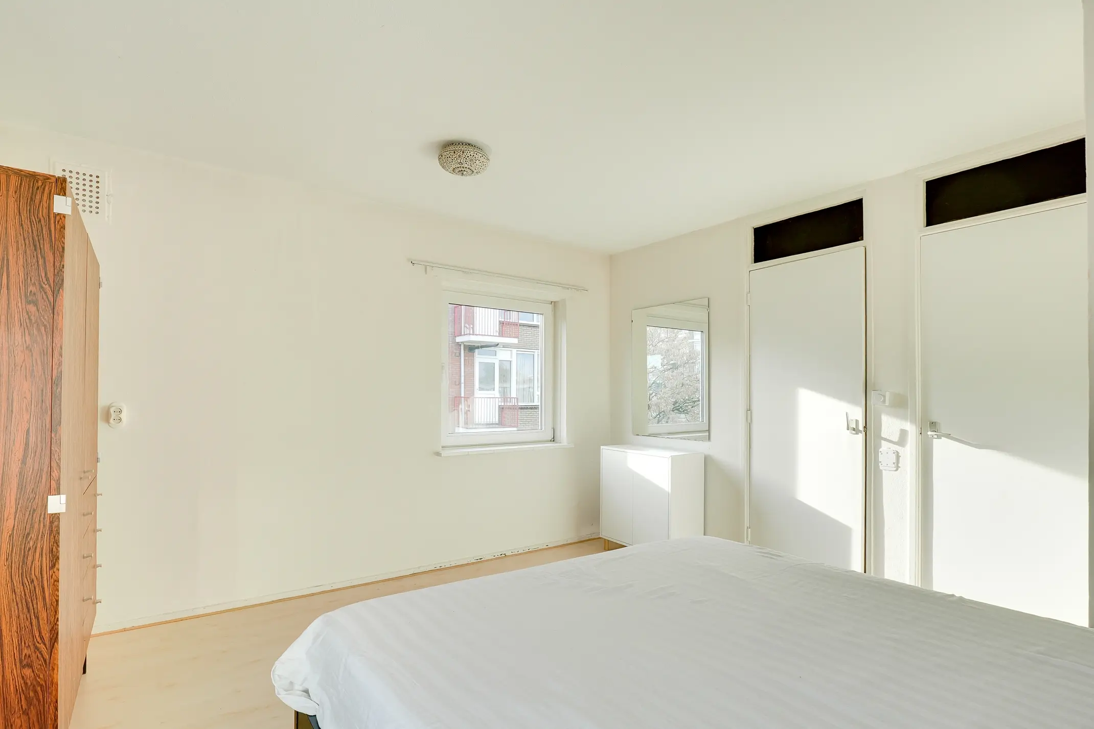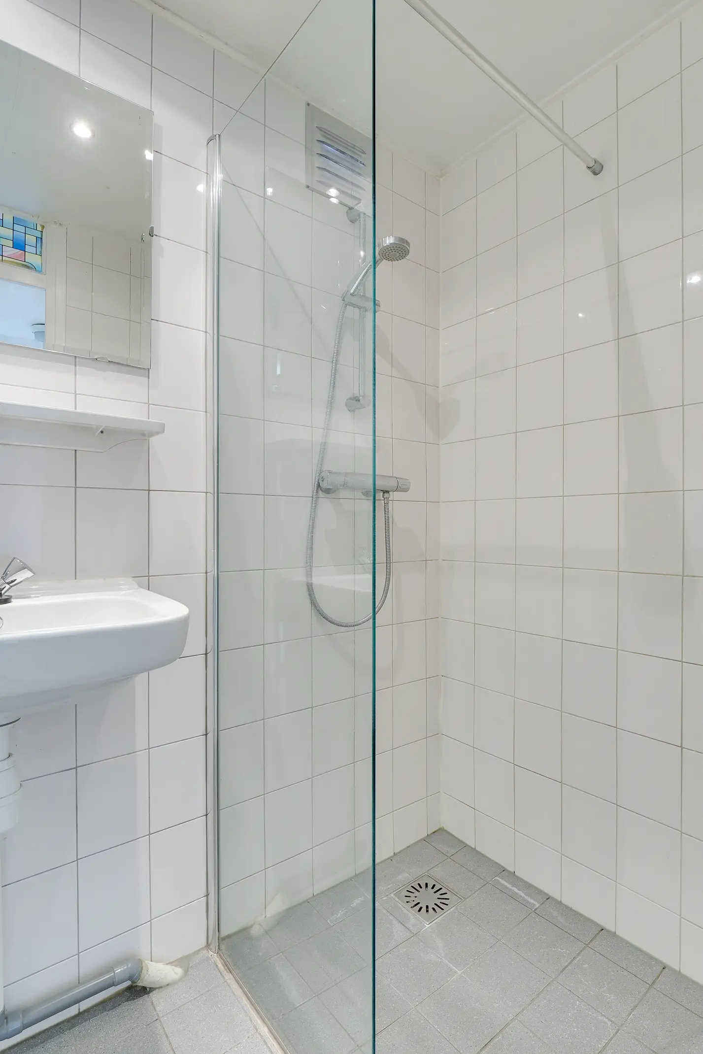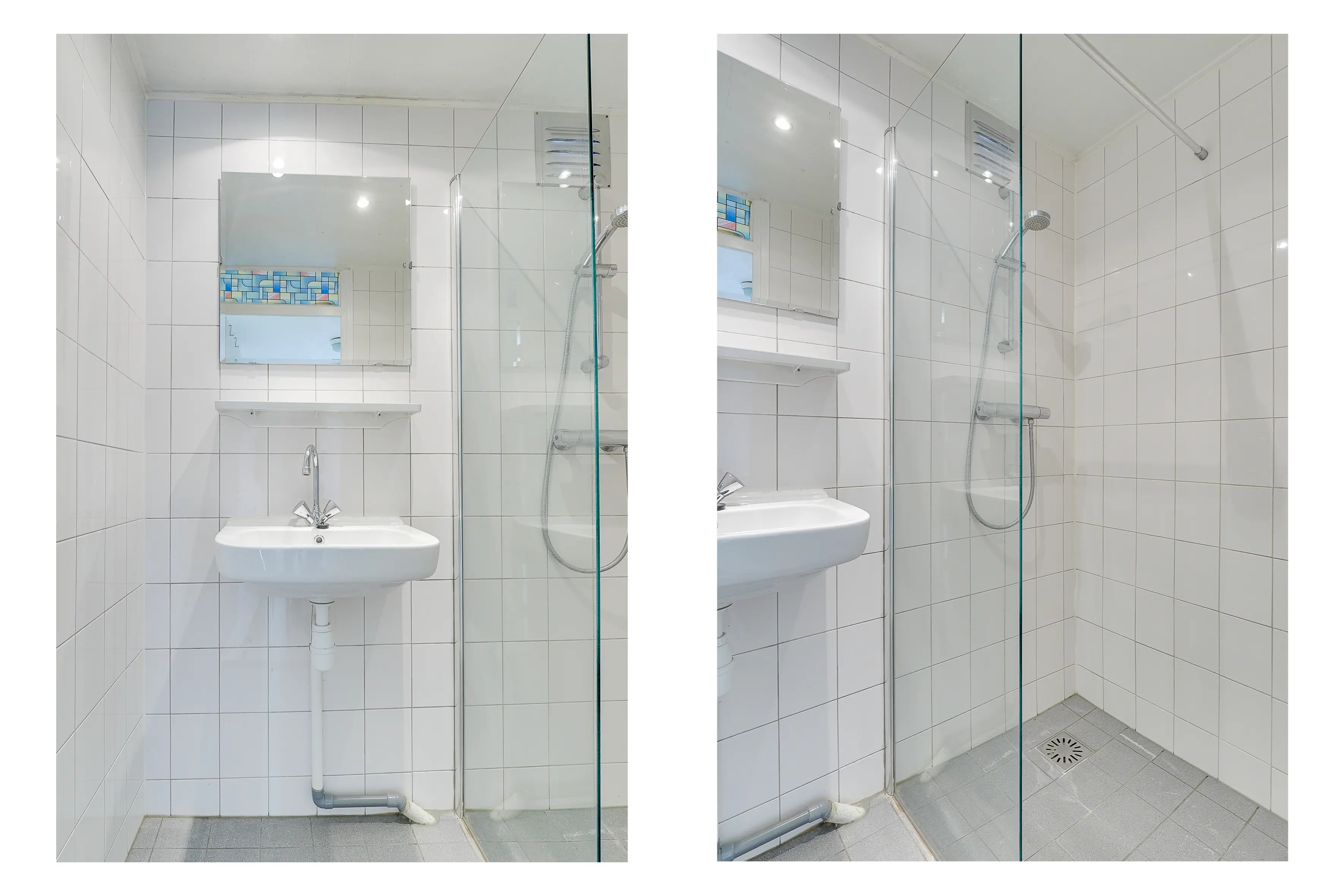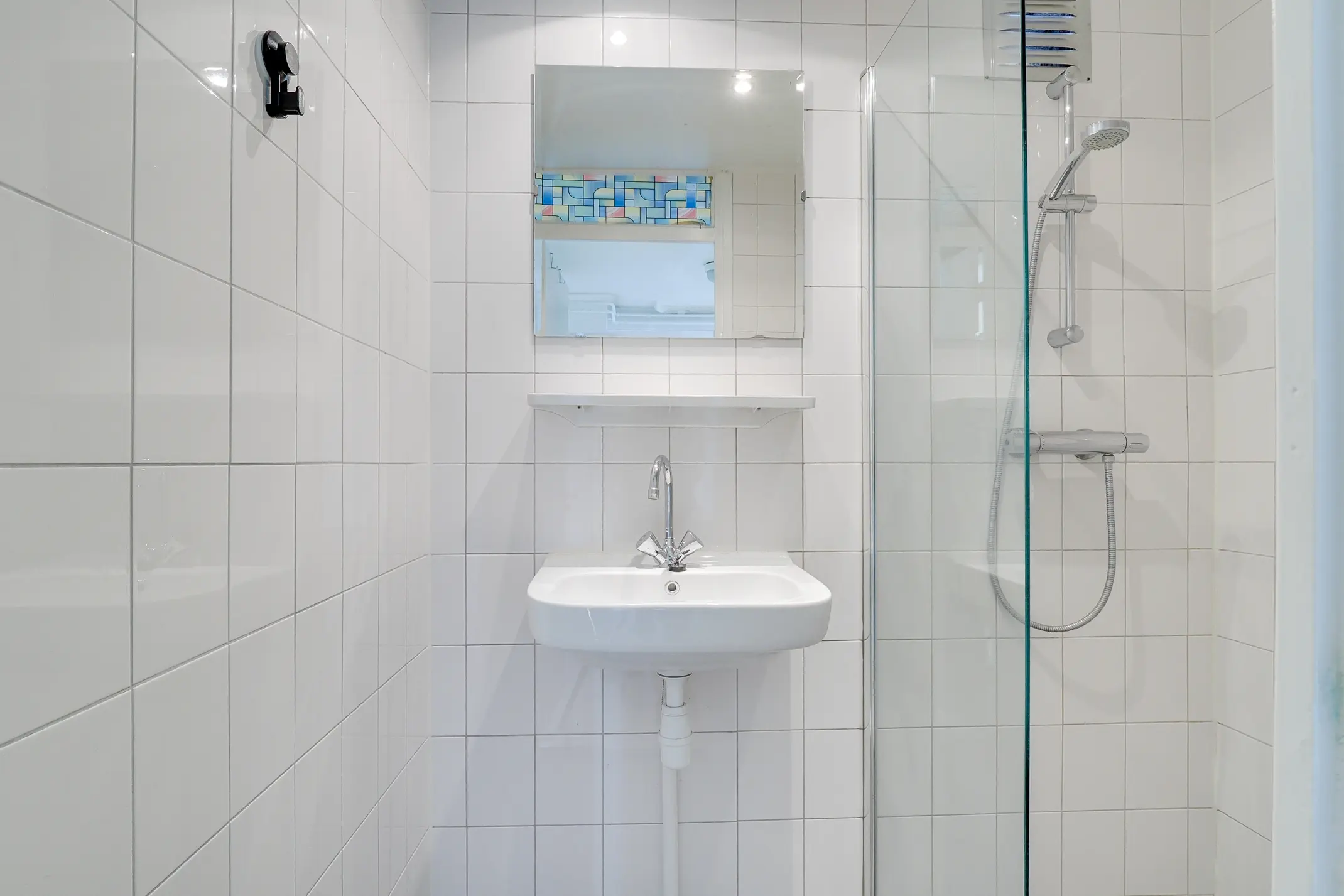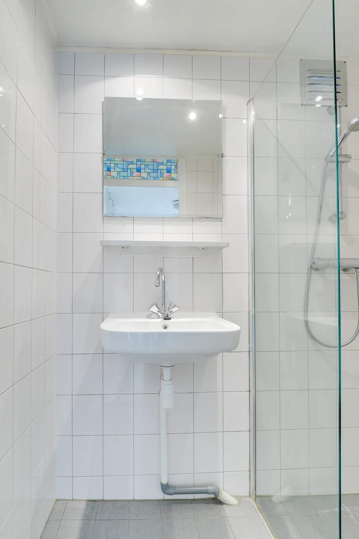 Een verdieping hoger bevinden zich twee goed bemeten slaapkamers en een nette badkamer met inloopdouche en wastafel. Oorspronkelijk waren het drie slaapkamers; één kamer is momenteel samengevoegd, maar dit is eenvoudig weer terug te brengen naar de originele indeling. Vanuit de slaapkamer aan de achterzijde stap je zó het balkon op: wakker worden met zon en uitzicht, wie wil dat niet?