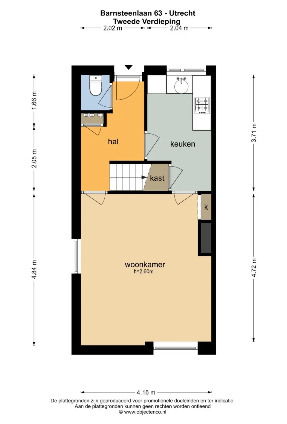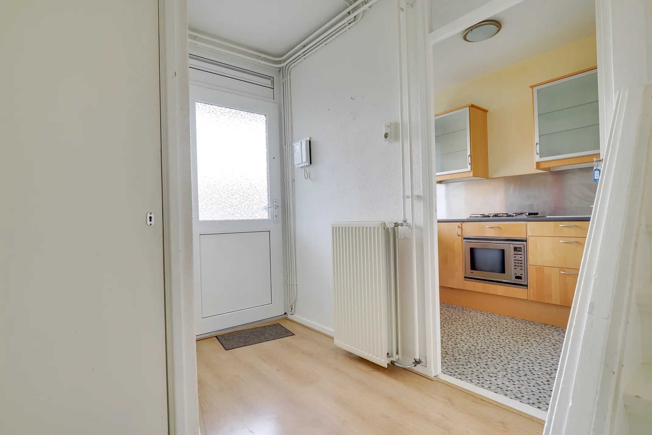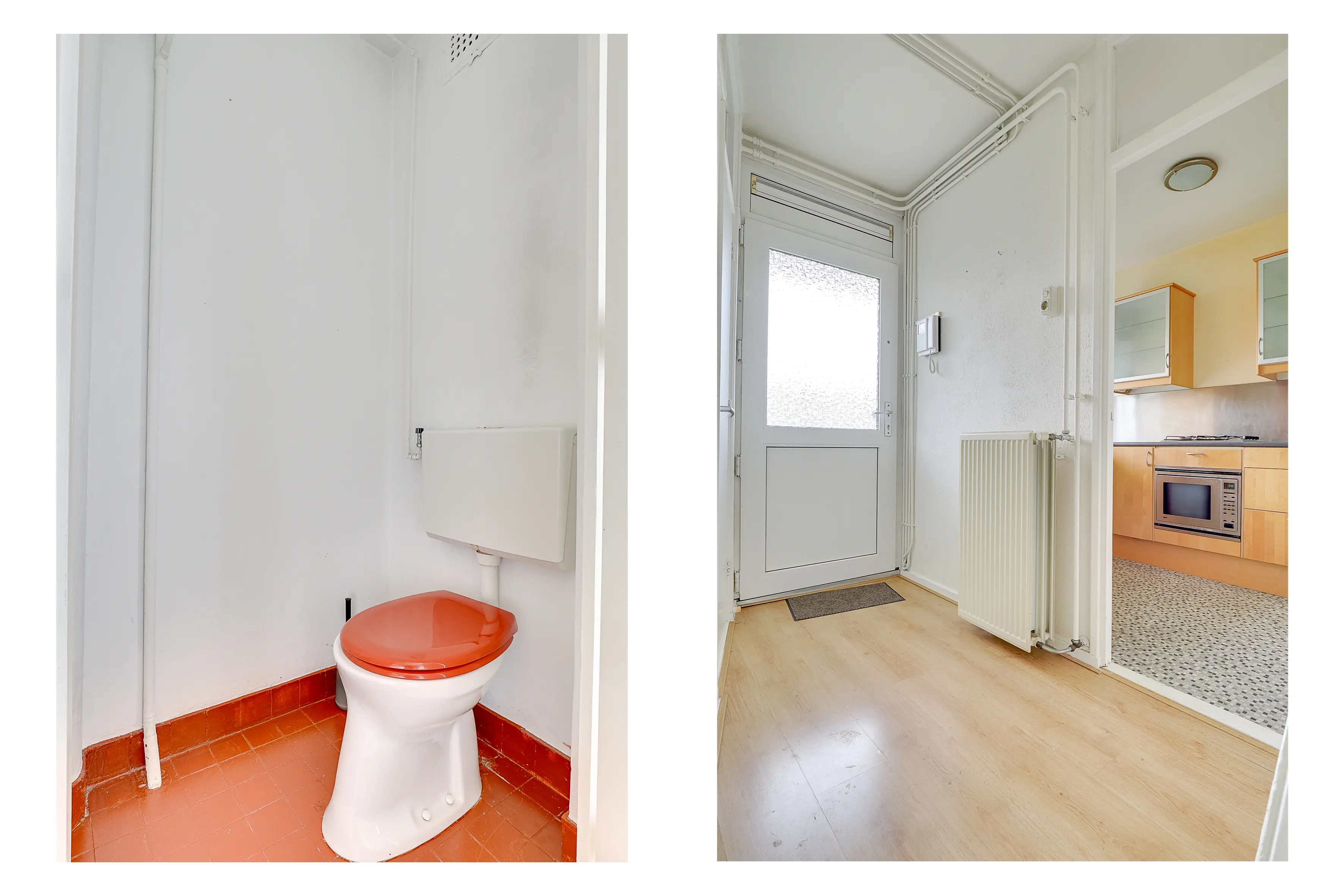 De ruime hal biedt toegang tot het toilet en de trap naar de slaapverdieping, waardoor de indeling efficiënt en praktisch is.