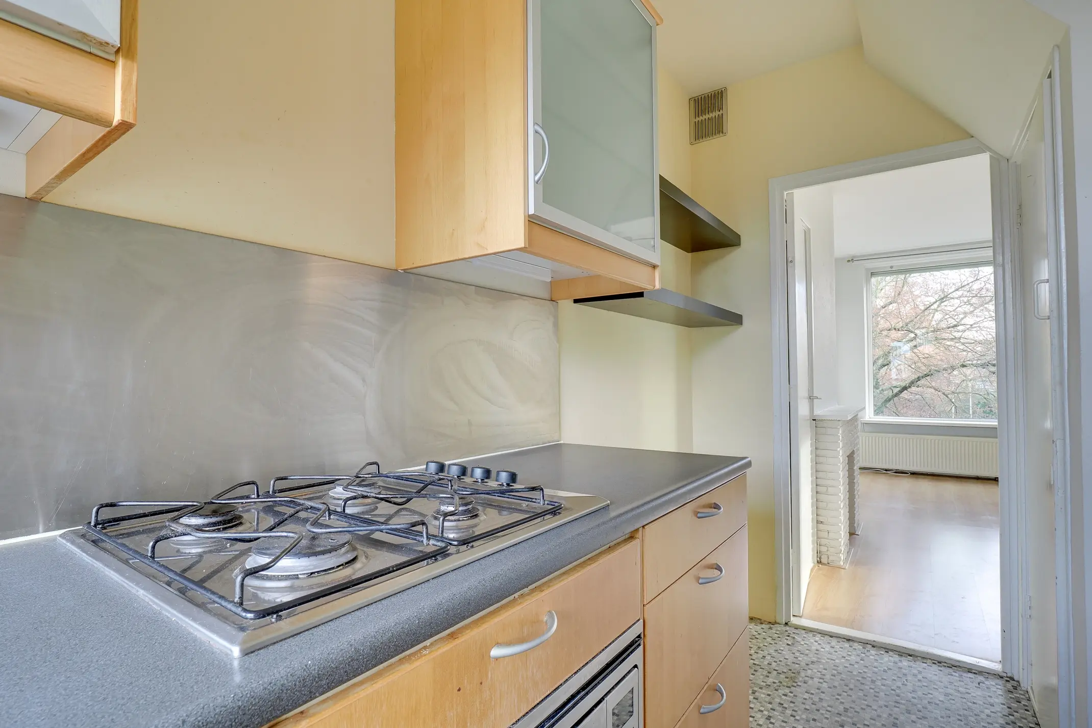 Aan de achterzijde bevindt zich de eenvoudige keuken, uitgerust met onder andere een 4-pits kookplaat, combioven, koelkast en diepvries. Vanuit hier kijk je schitterend uit over het groene grasveld en de fraaie, volwassen boompartijen achter het gebouw — een serene plek om te koken met uitzicht.