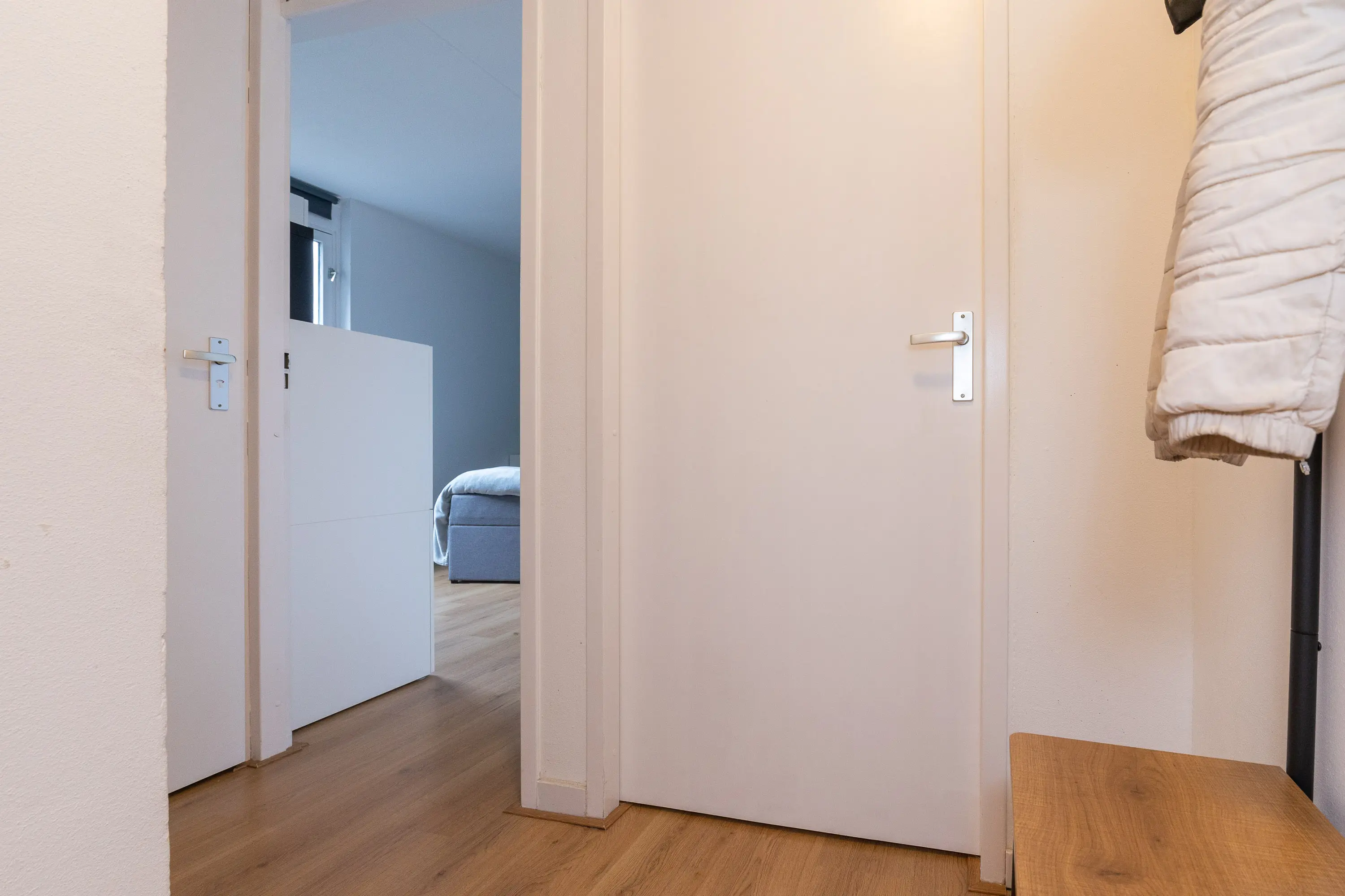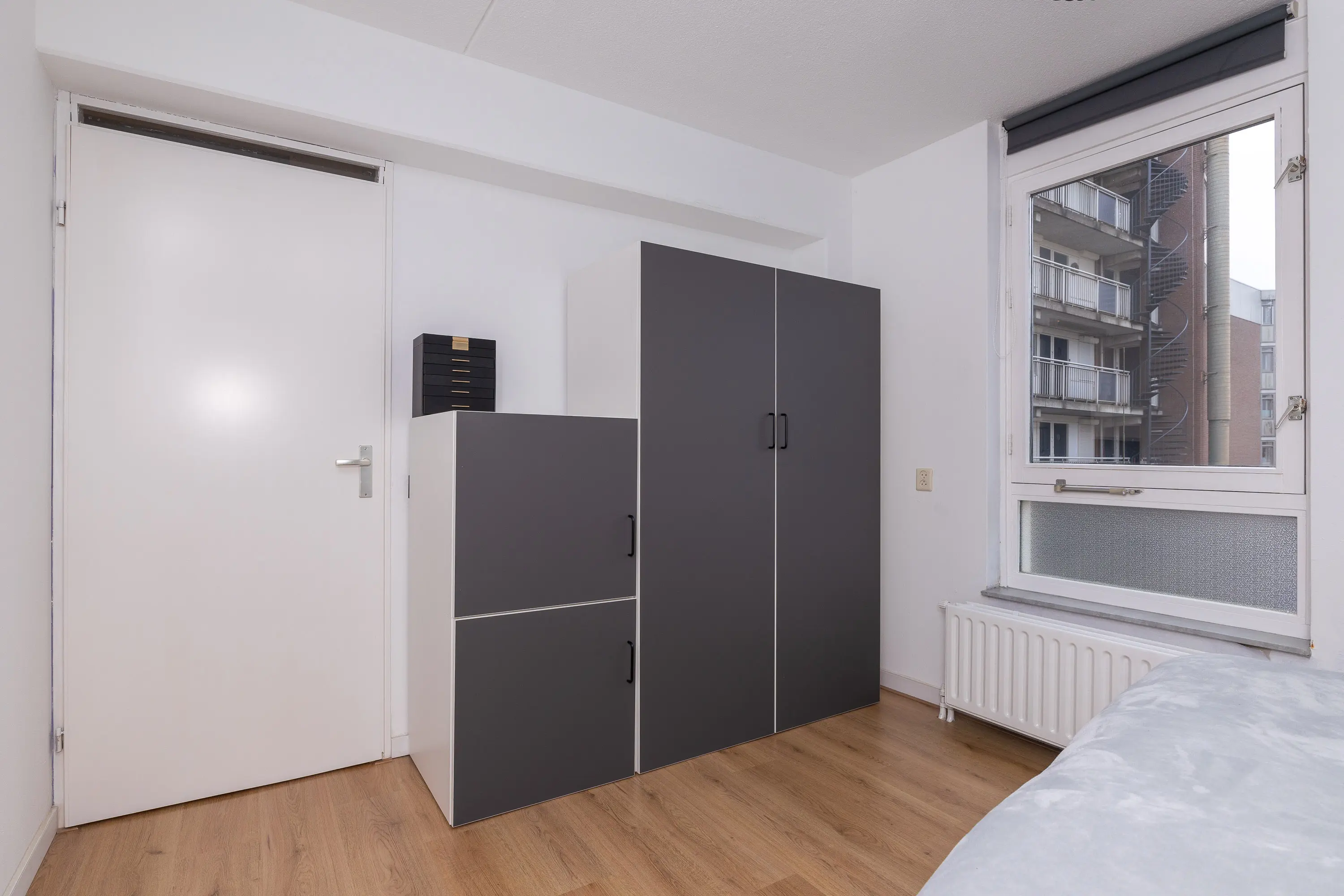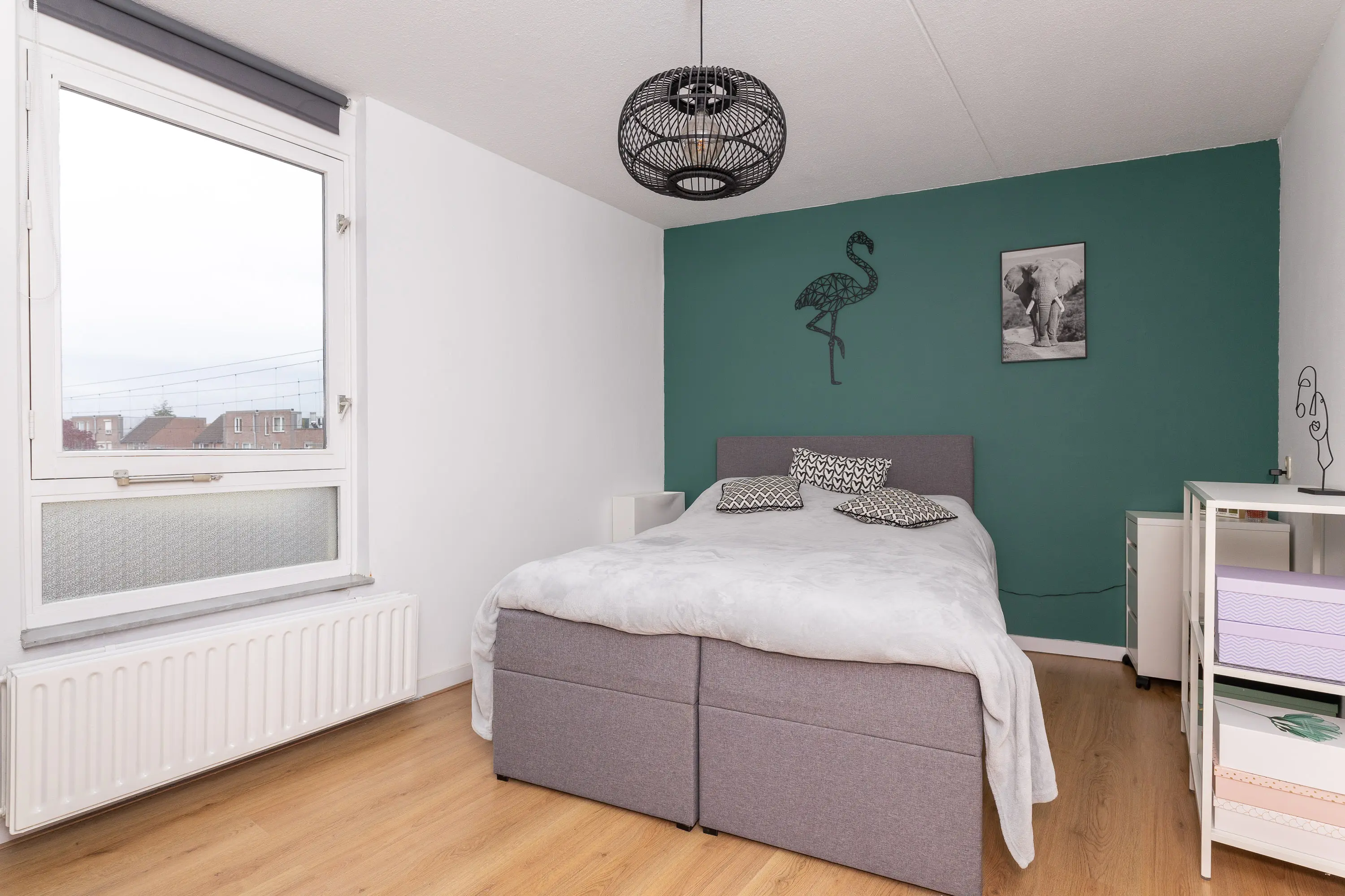 De ruime slaapkamer aan de achterzijde biedt voldoende plek voor een groot bed en een kledingkast, en geniet eveneens van veel natuurlijk licht. De badkamer is in 2022 volledig vernieuwd en heeft een moderne, frisse uitstraling. Deze is uitgerust met een inloopdouche met rainshower, een toilet, witgoedaansluiting, wandradiator en een raam voor extra ventilatie en daglicht.