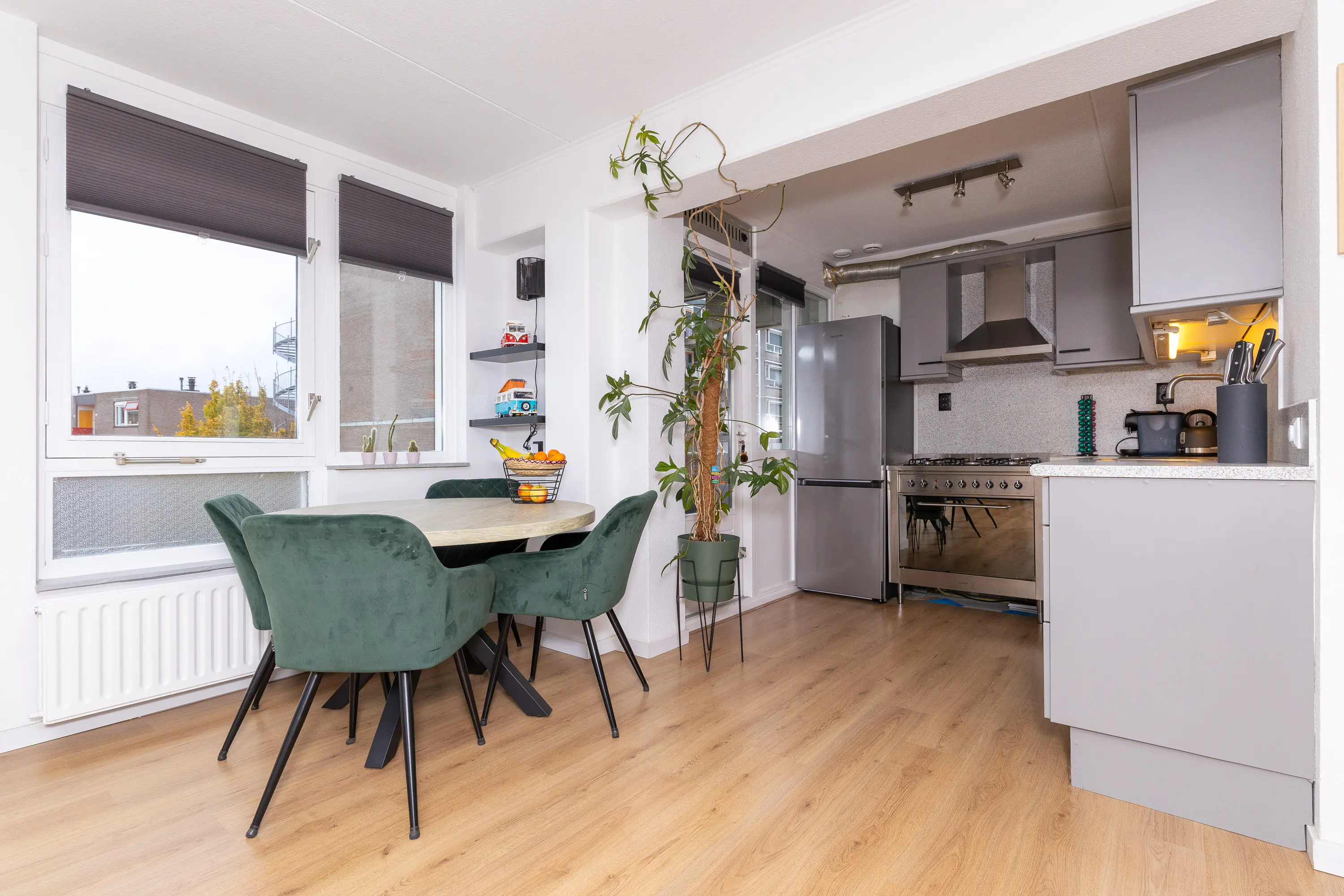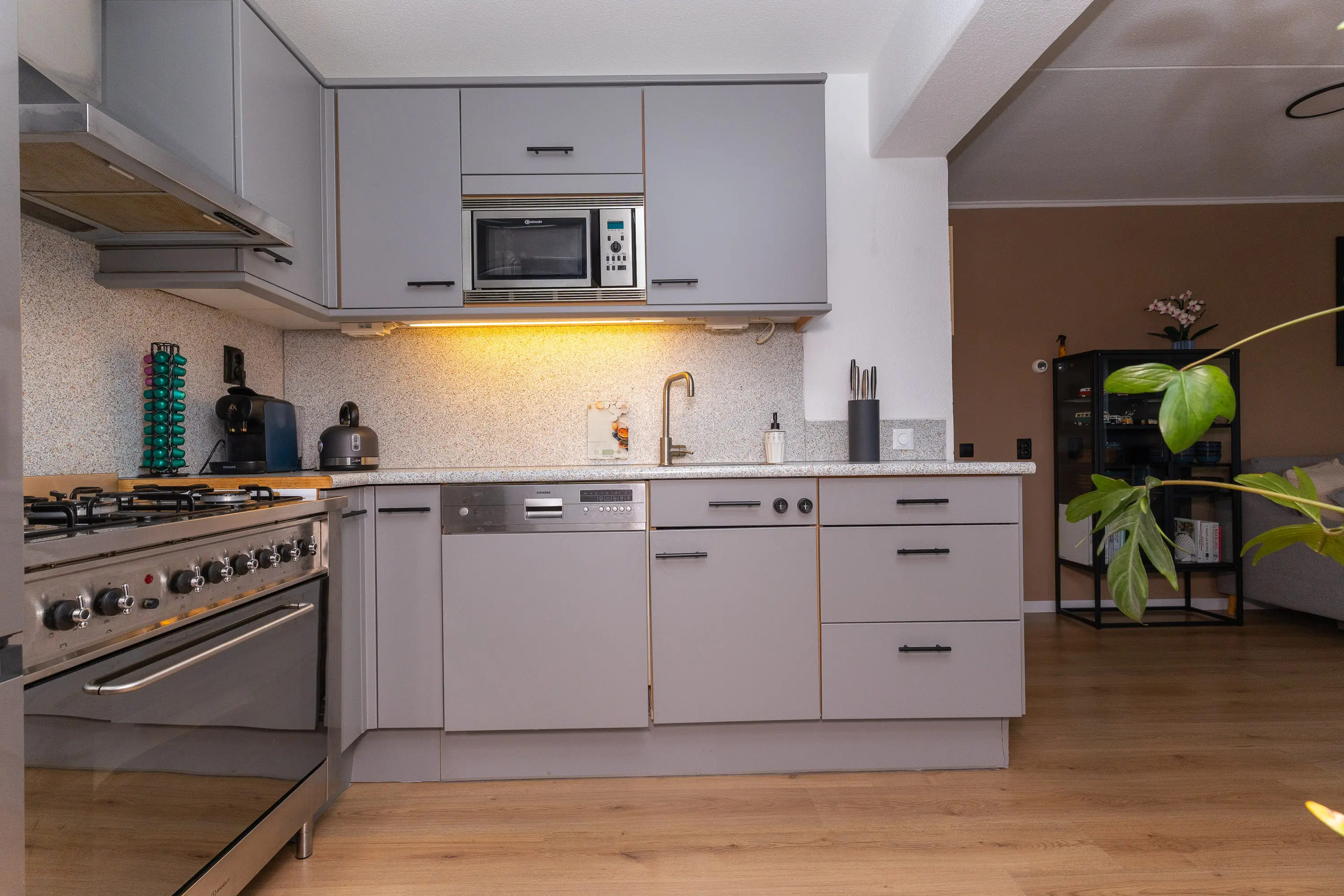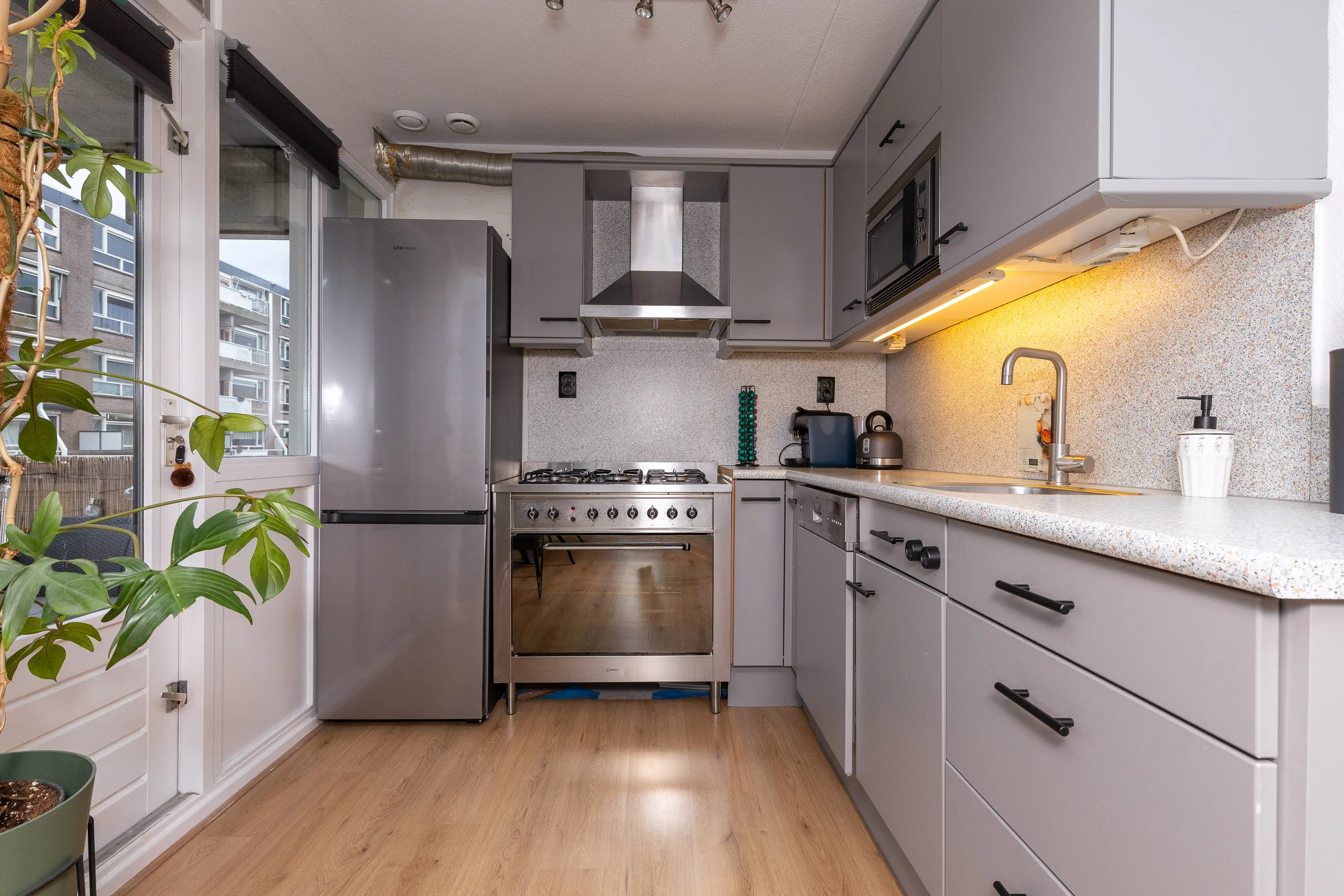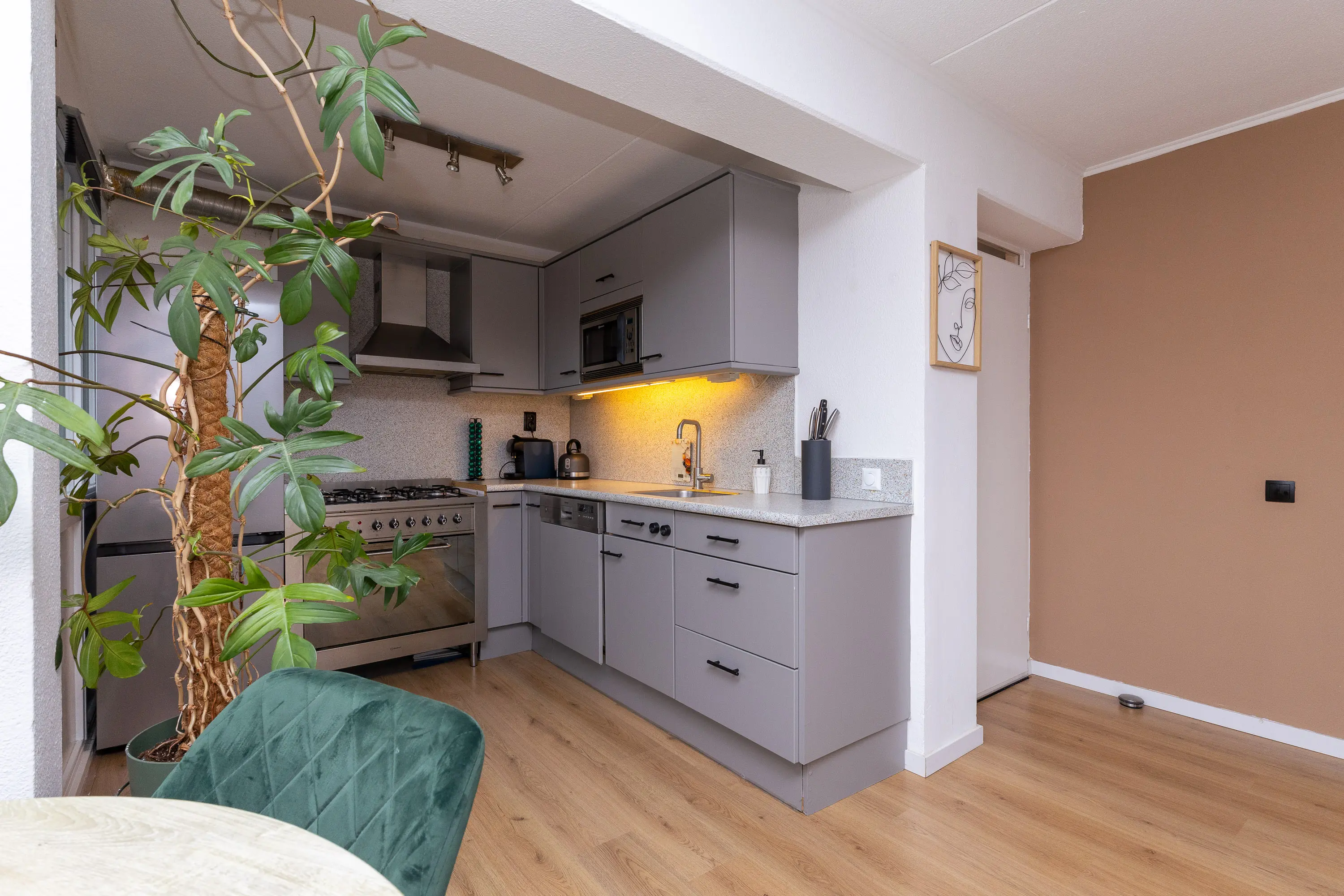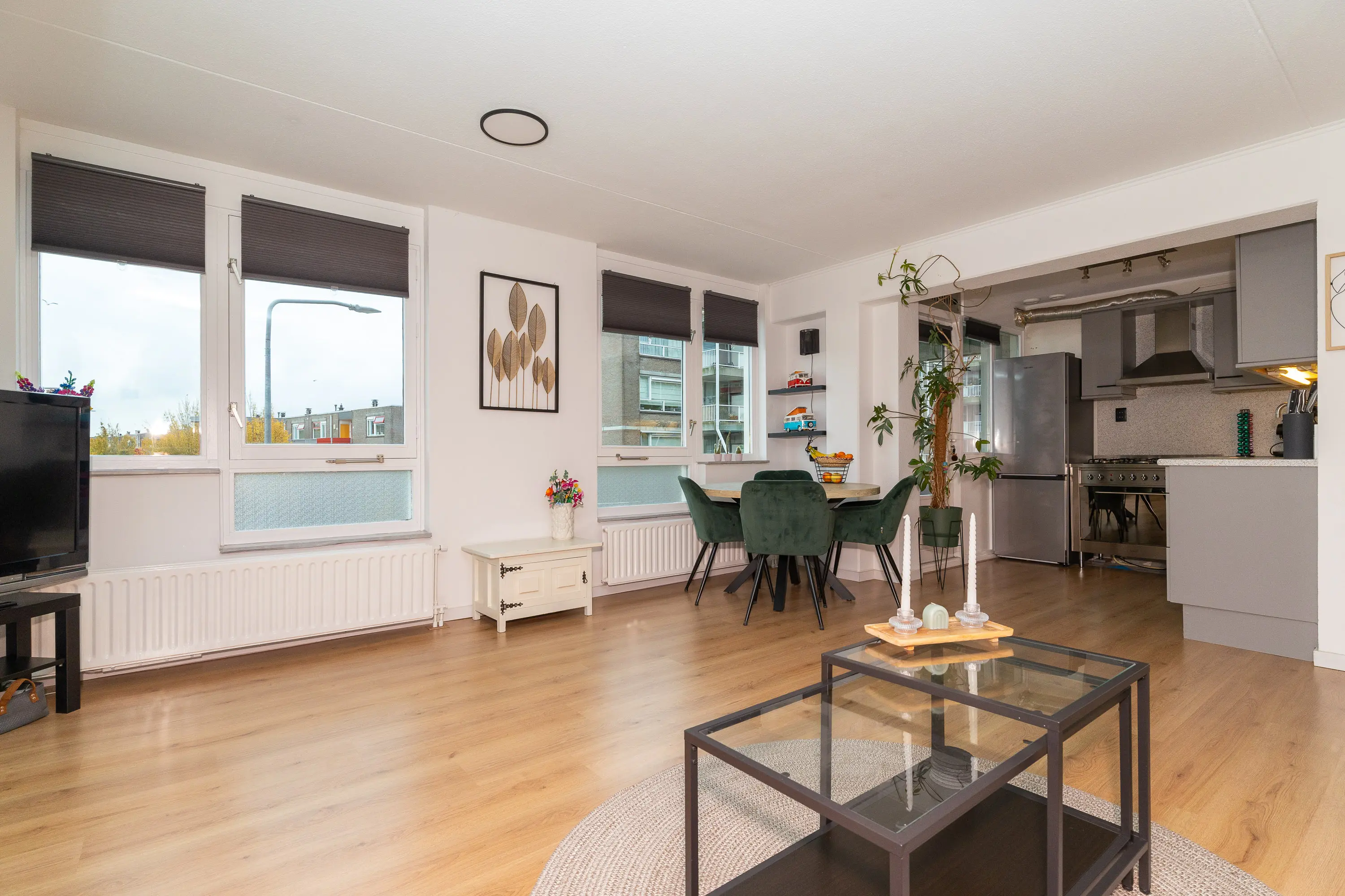 Bij binnenkomst valt direct de verzorgde afwerking en de prettige lichtinval op. De woonkamer is royaal opgezet en profiteert van ramen aan meerdere zijden, waardoor er een aangenaam en open gevoel ontstaat. De open keuken sluit hier perfect op aan en is voorzien van diverse inbouwapparatuur zoals een oven, 5-pits gasfornuis, afzuigkap en vaatwasser. Vanuit de keuken is er toegang tot het balkon, een fijne plek om te genieten van de ochtendzon of om even buiten te zitten.