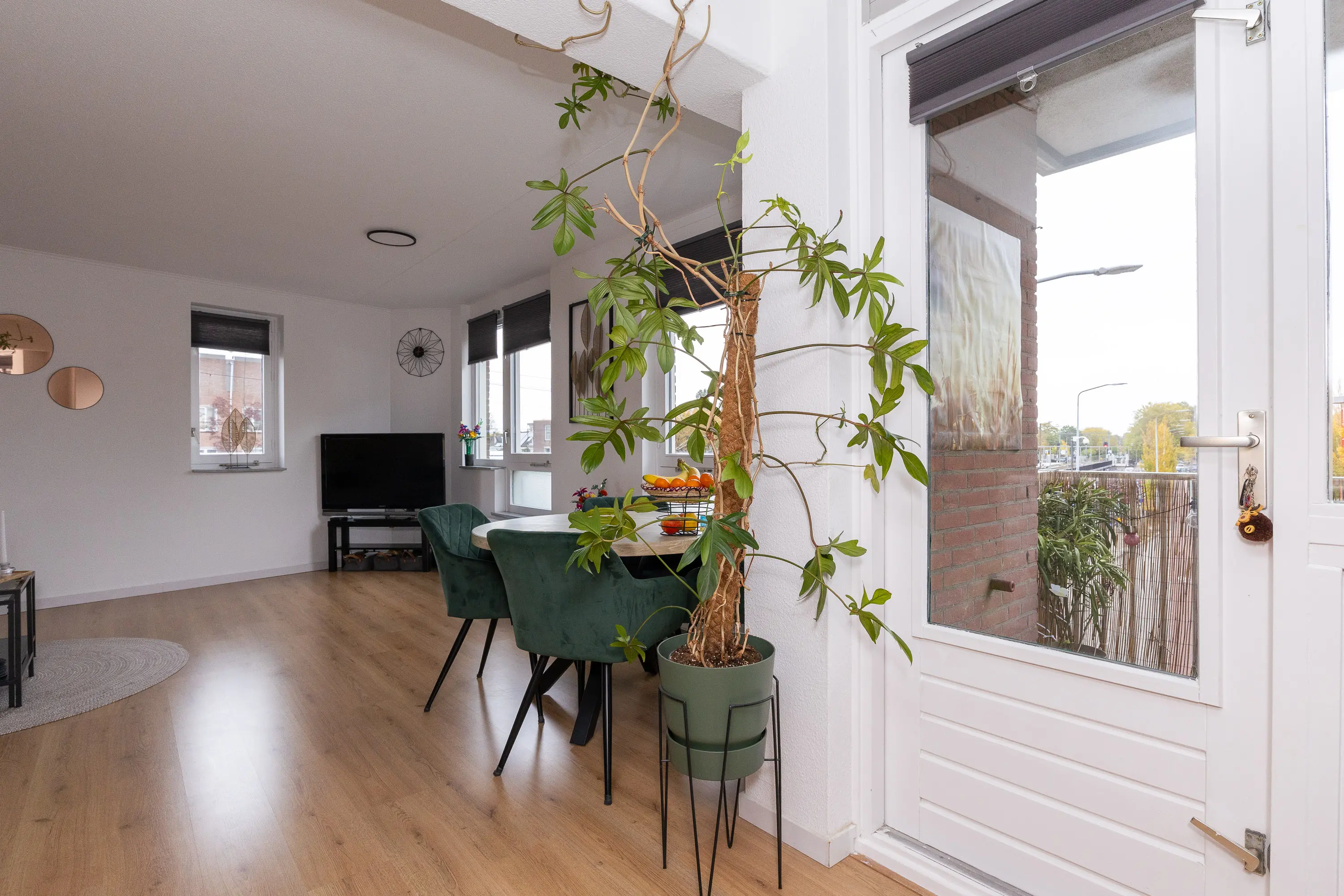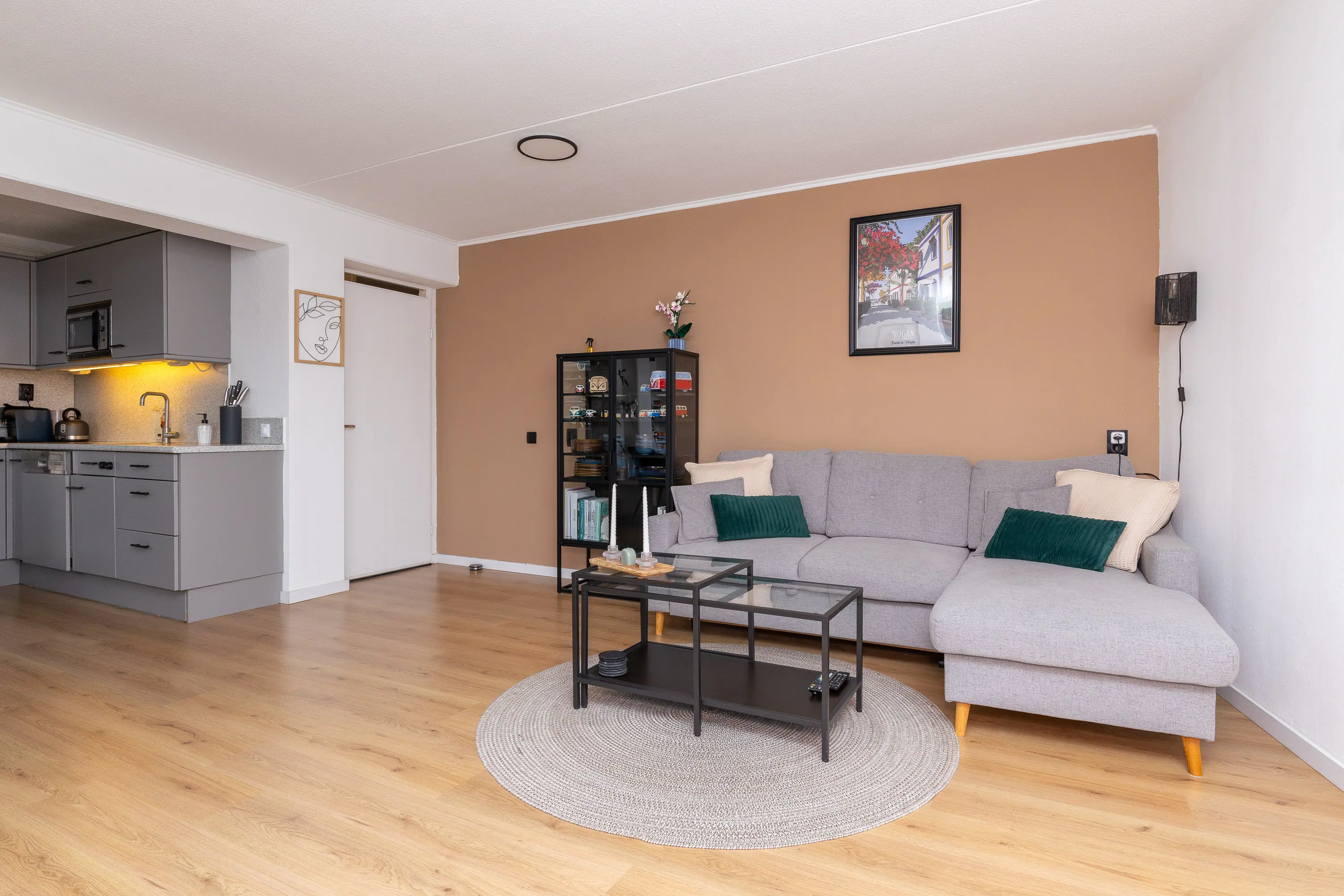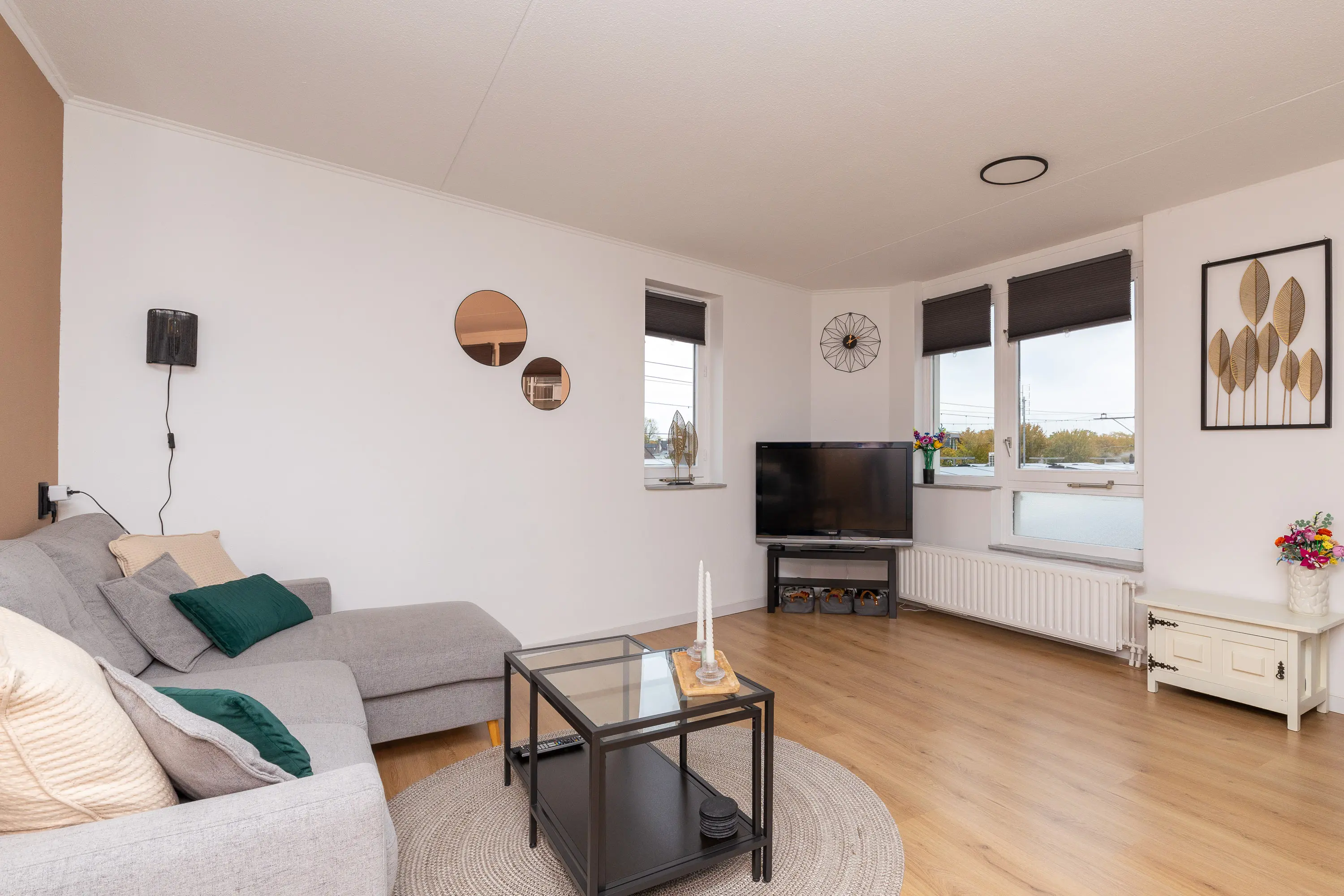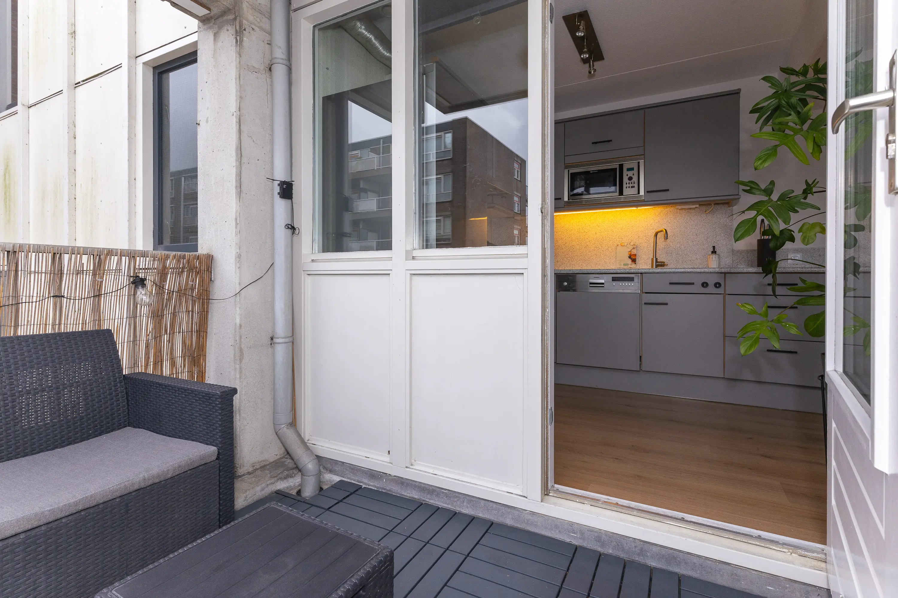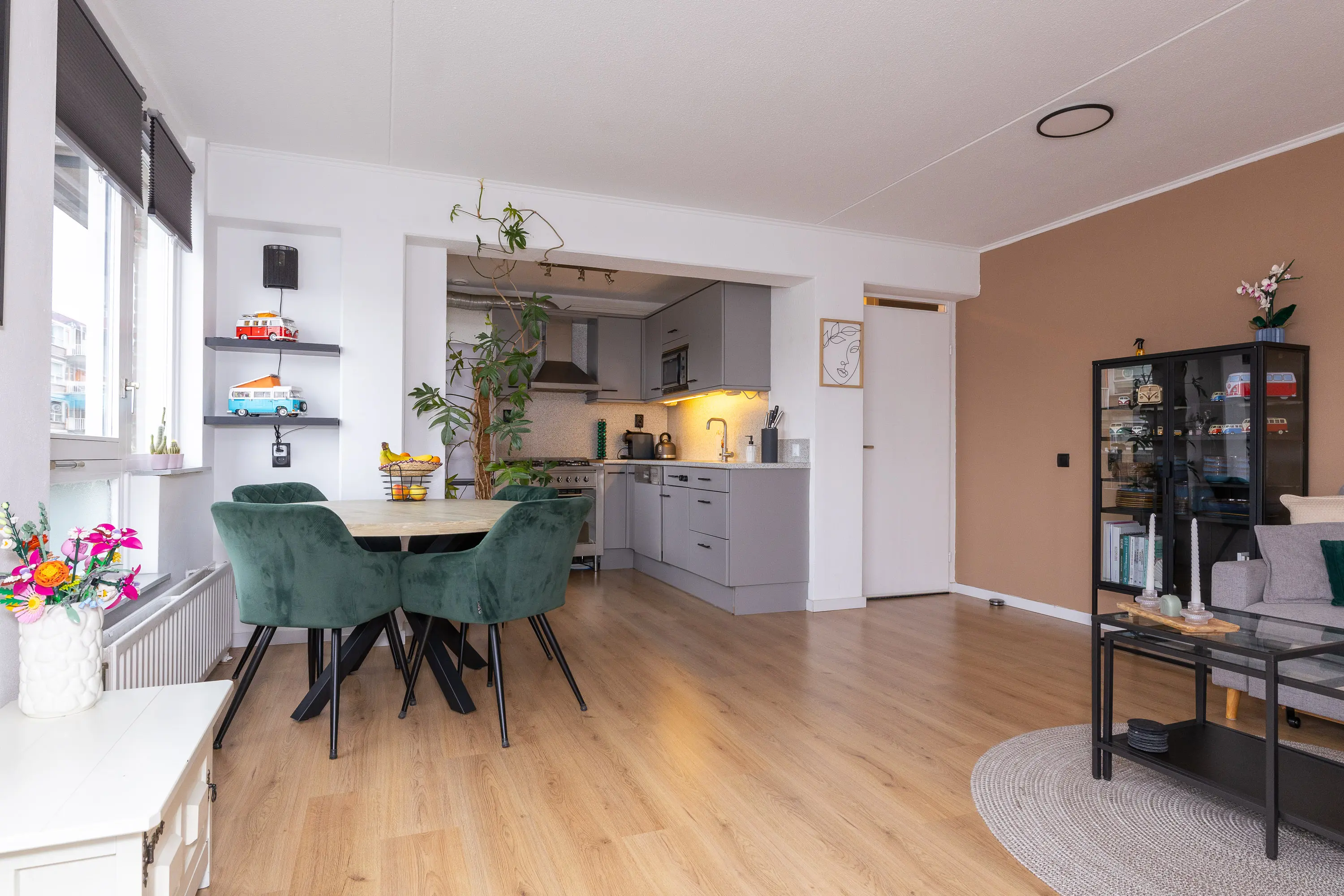 Bij binnenkomst valt direct de verzorgde afwerking en de prettige lichtinval op. De woonkamer is royaal opgezet en profiteert van ramen aan meerdere zijden, waardoor er een aangenaam en open gevoel ontstaat. De open keuken sluit hier perfect op aan en is voorzien van diverse inbouwapparatuur zoals een oven, 5-pits gasfornuis, afzuigkap en vaatwasser. Vanuit de keuken is er toegang tot het balkon, een fijne plek om te genieten van de ochtendzon of om even buiten te zitten.