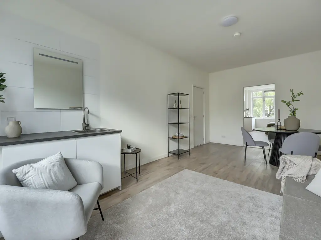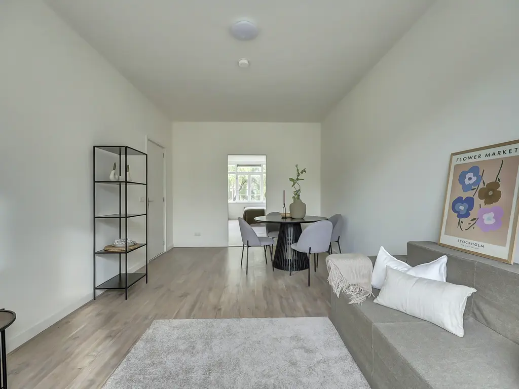 Je komt binnen in een kleine hal en hebt van daaruit direct toegang tot zowel het toilet, de keuken aan de achterzijde als de woonkamer. We stappen de woonkamer en-suite in, waar je aan de achterkant een heerlijke ruimte hebt om een grote eethoek te creëren — fantastisch om lange avonden te tafelen met vrienden en/of familie. Je zou er ook voor kunnen kiezen om de scheidingswand tussen de voor- en achterkamer te verwijderen, zodat je een royale doorzonwoonkamer krijgt.