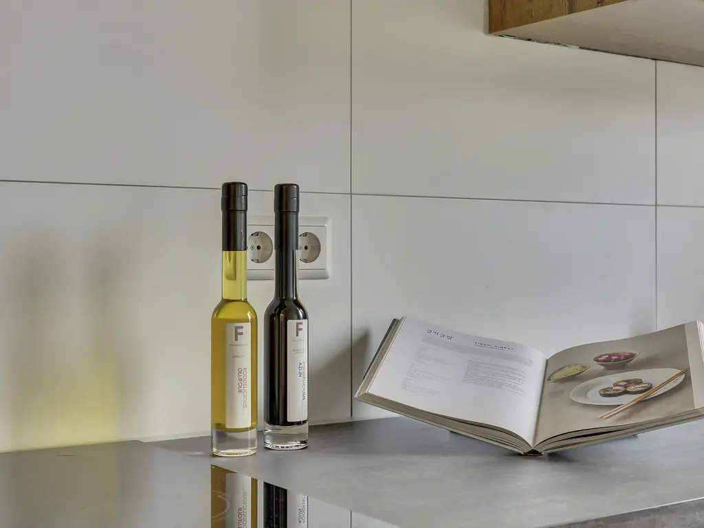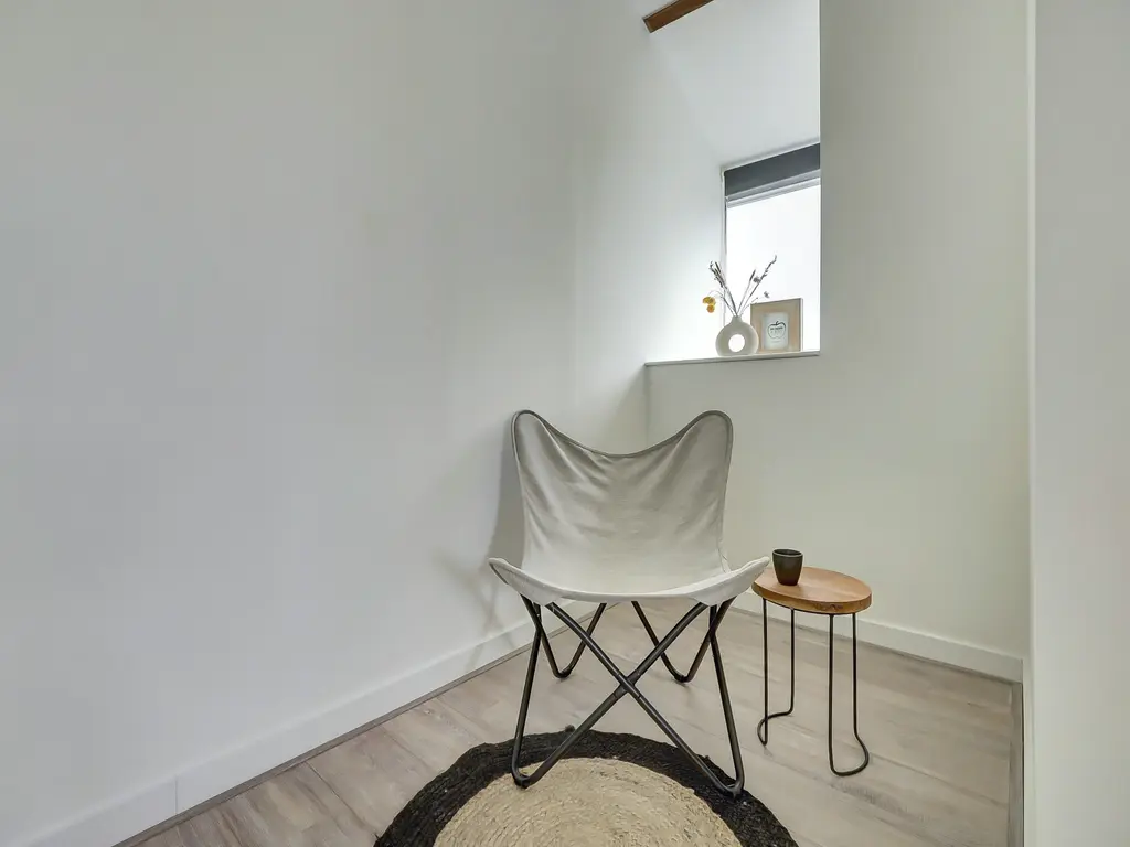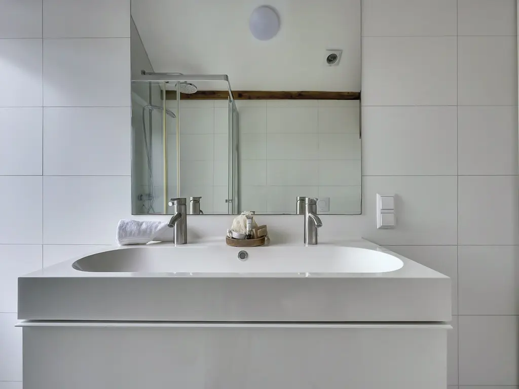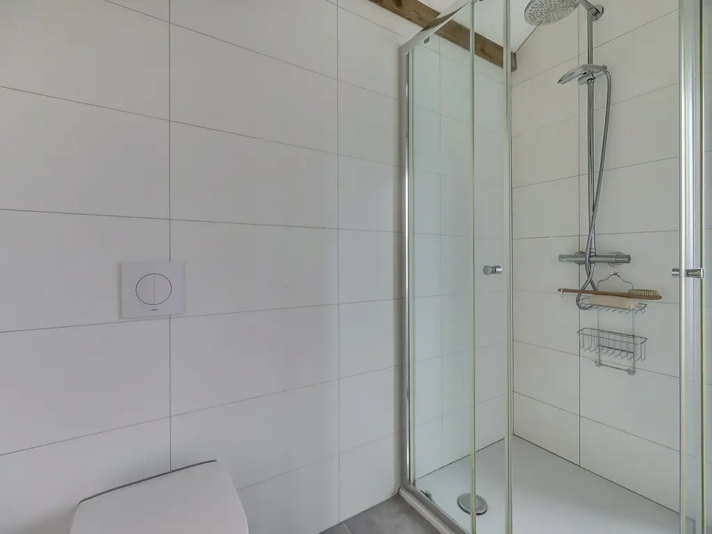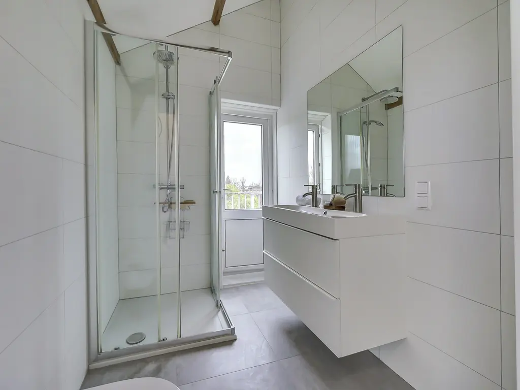 Daarnaast vinden we op deze etage de badkamer, die is voorzien van een grote douchecabine met zowel regendouche als handdouche, een tweede toilet, een dubbele wastafel met mengkranen, een grote spiegel erboven en een strak badkamermeubel. Ook vanuit de badkamer heb je toegang tot het balkon. De hoogte van het plafond maakt dit een bijzonder sfeervolle ruimte!