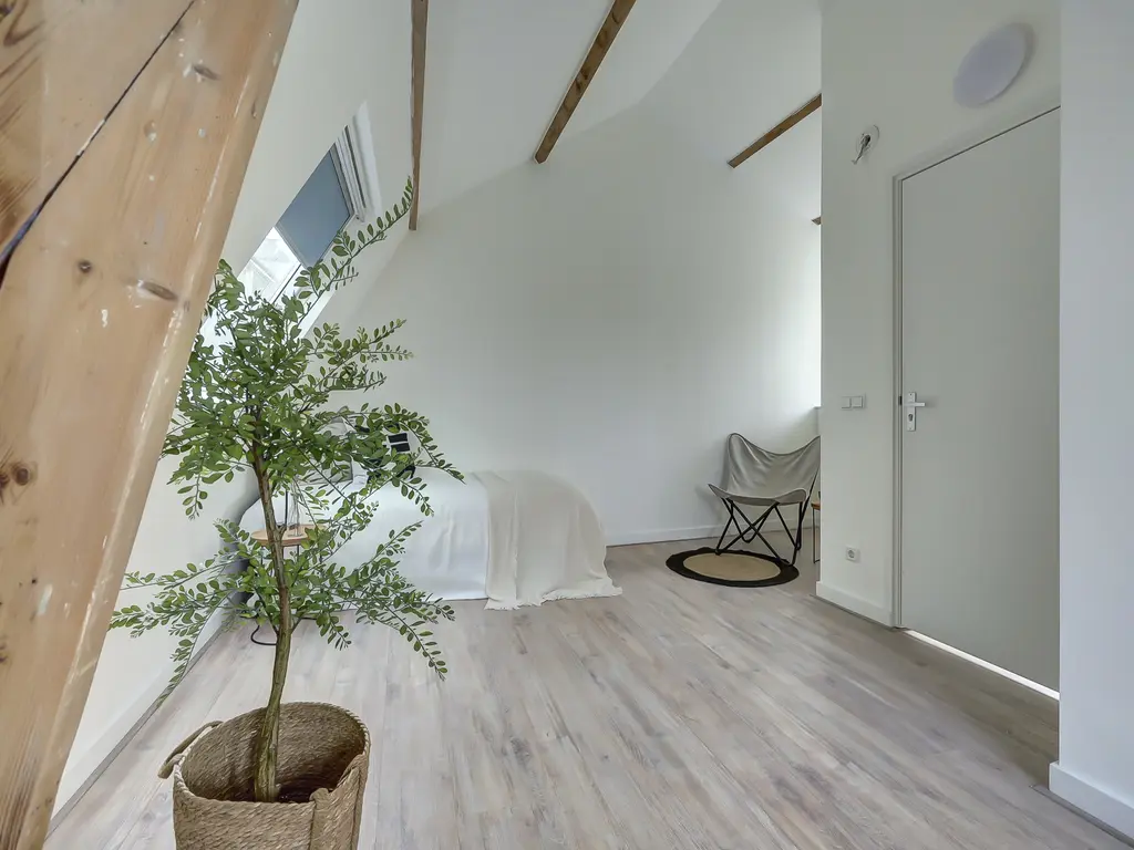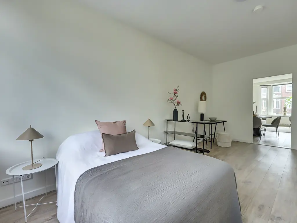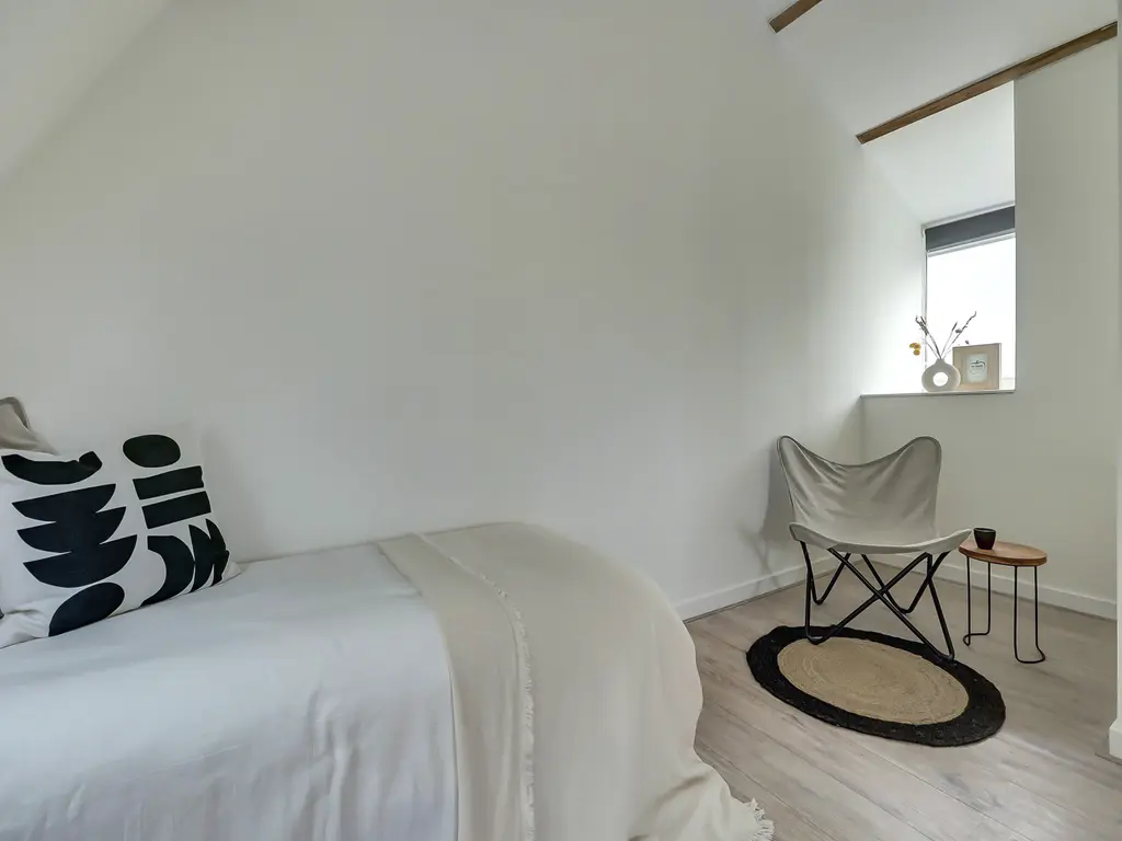 Met de trap lopen we naar de vierde verdieping, waar je beschikt over de achterste helft van de etage. Daar treffen we een sfeervolle slaapkamer met ruimte voor een groot tweepersoonsbed en voldoende plek voor kledingkasten. Vanuit deze kamer heb je toegang tot het balkon aan de achterzijde, dat ligt op het noorden — een fijn plekje om in de ochtend te genieten van een kop koffie in de zon!