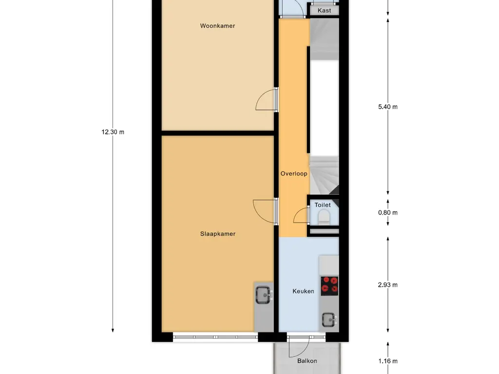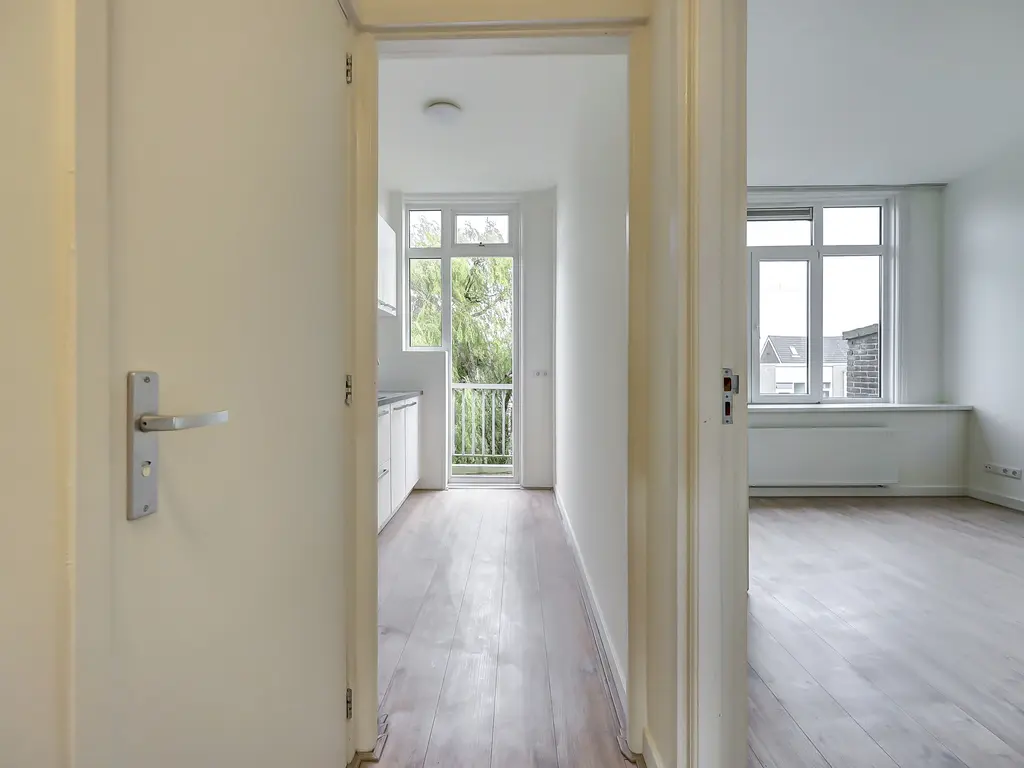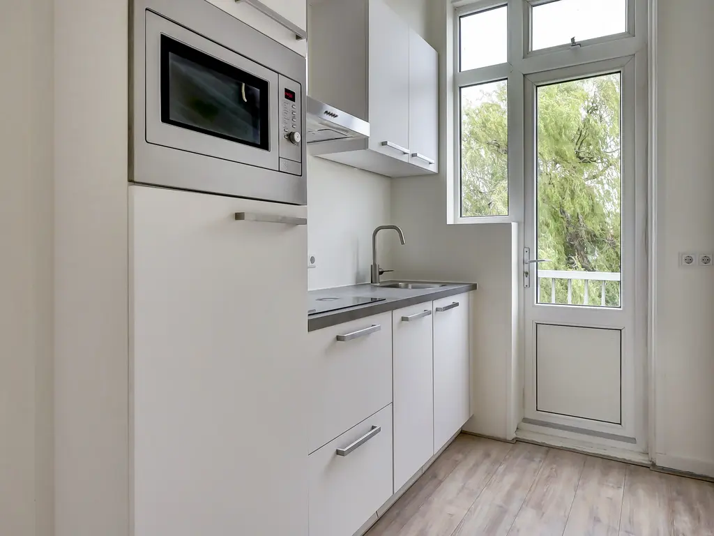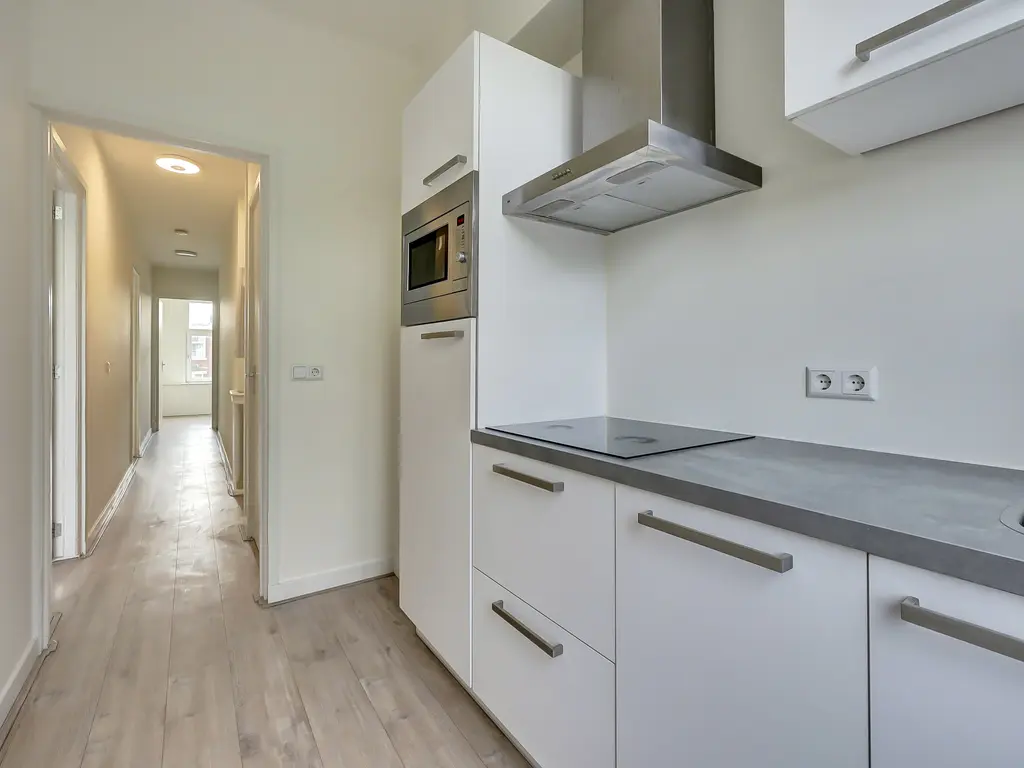 De muur tussen de voor- en achterkamer is eenvoudig te verwijderen, wat een prachtige, grote doorzonwoonkamer oplevert. Aan de achterzijde bevindt zich vanuit de hal de keuken, voorzien van een ingebouwde koelkast en oven: een nette, moderne keuken met toegang tot het balkon aan de achterzijde.