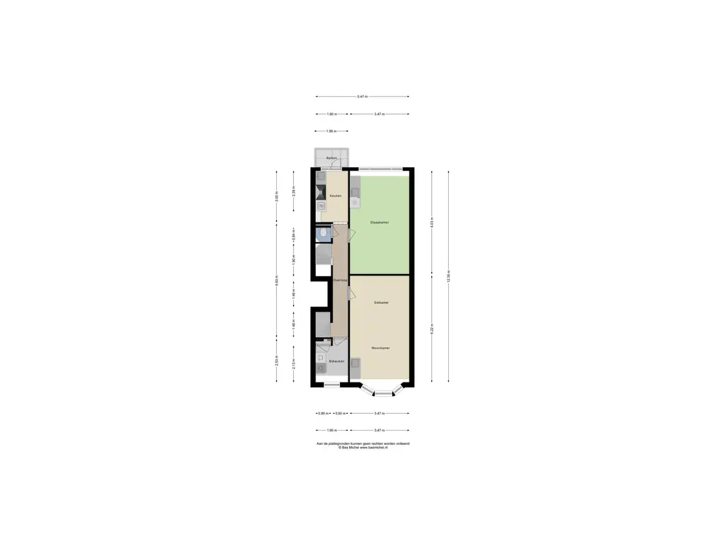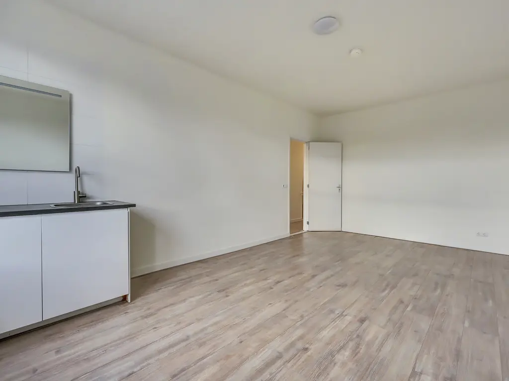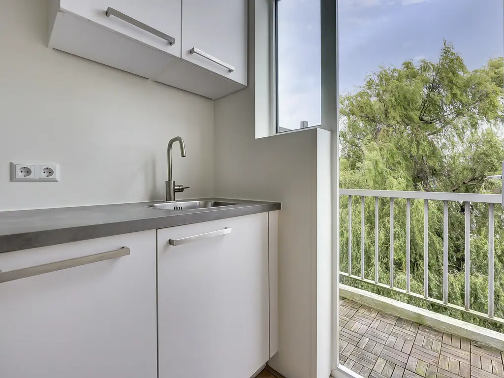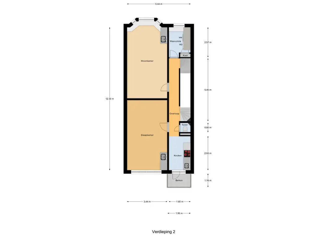 De muur tussen de voor- en achterkamer is eenvoudig te verwijderen, wat een prachtige, grote doorzonwoonkamer oplevert. Aan de achterzijde bevindt zich vanuit de hal de keuken, voorzien van een ingebouwde koelkast en oven: een nette, moderne keuken met toegang tot het balkon aan de achterzijde.
