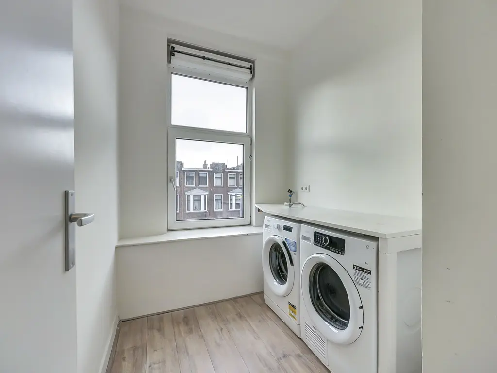 Aan de voorzijde bevindt zich een kleinere kamer, voorzien van aansluitingen voor de wasmachine en droger.