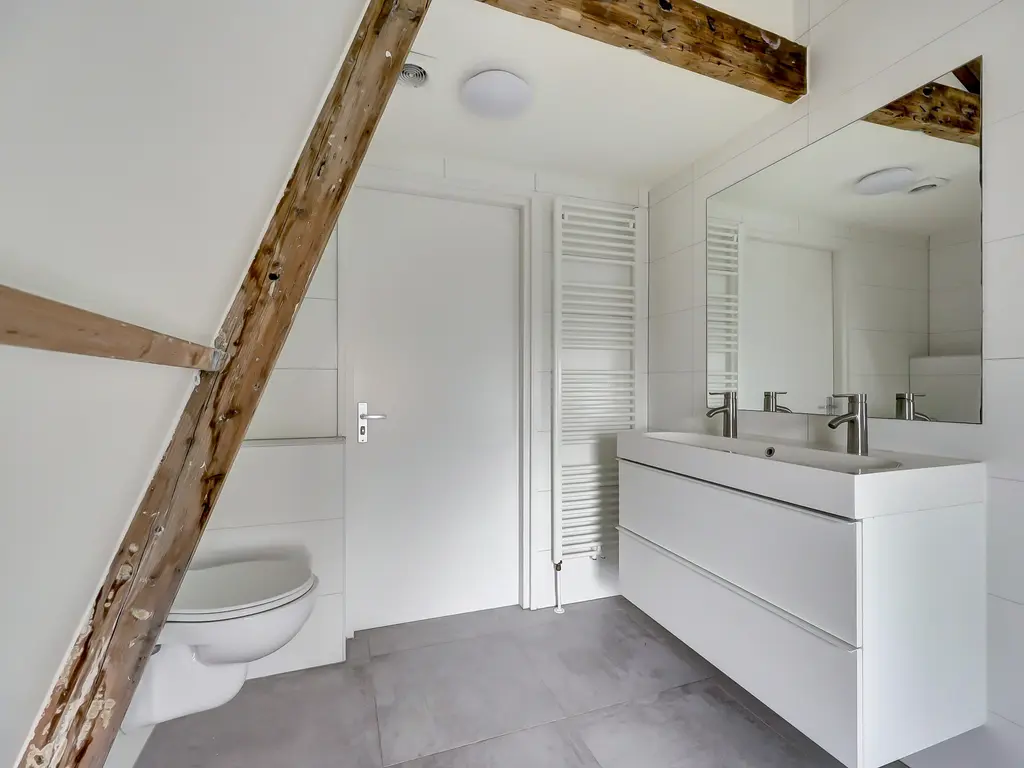 badkamermeubel. Het hoge plafond maakt dit tot een bijzonder sfeervolle ruimte!