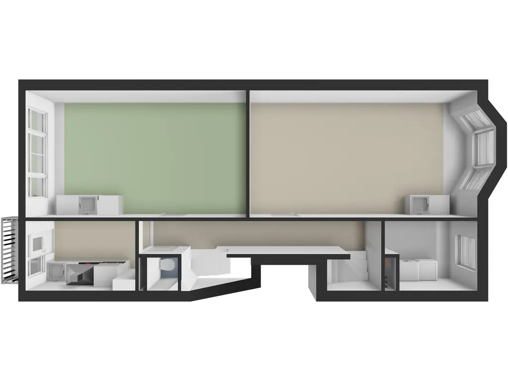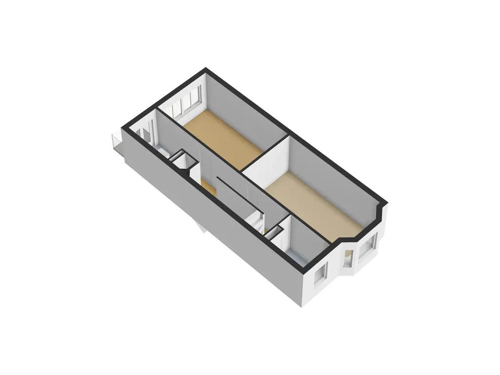 Achter de voordeur leidt de trap naar de derde etage, waar je aankomt in de hal die toegang geeft tot iedere ruimte op deze verdieping. Deze verdieping bestaat uit een riante voorkamer van ca. 23 m² en een grote achterkamer van ca. 19 m². Dit appartement is voorheen verhuurd geweest, waarbij er drie ruime kamers waren met een eigen keuken. De keukens zijn blijven zitten; je zou hier dus ook perfect met z’n drieën kunnen wonen, waarbij je het toilet en de badkamer deelt, maar ieder een eigen keukenblokje hebt en daarnaast een gezamenlijke keuken. Uiteraard kunnen de keukenblokjes er ook eenvoudig uit, zodat je het appartement als geheel kunt bewonen — alleen, met z’n tweeën of met je gezin.