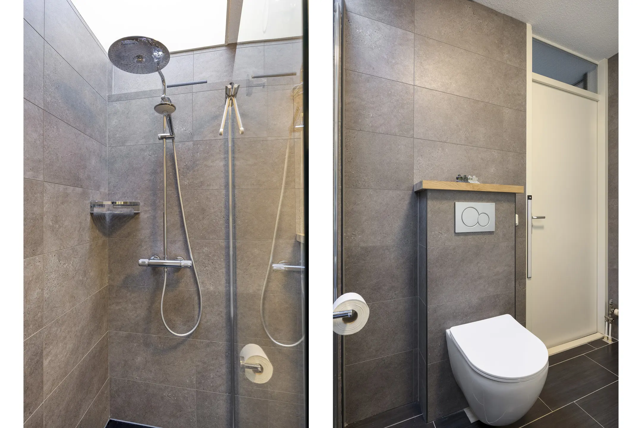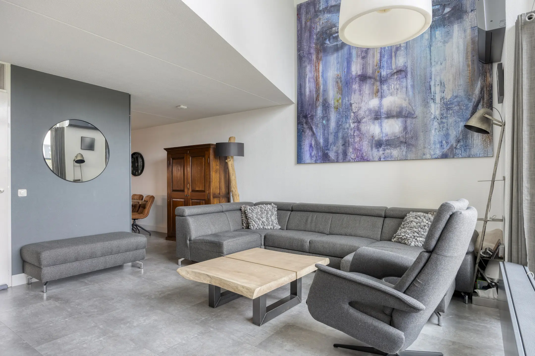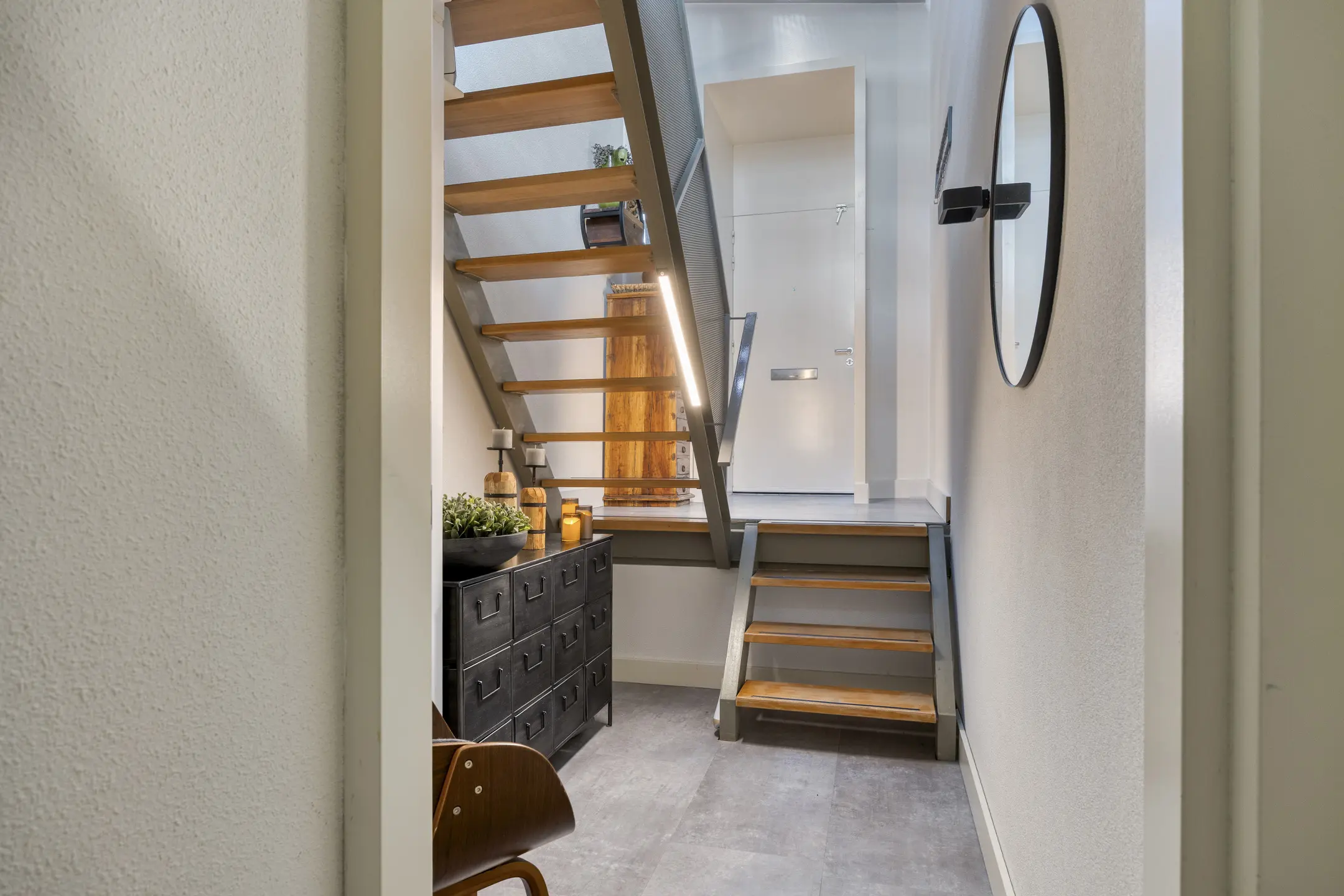 Via de voordeur stap je de ruime hal binnen, waar meteen de moderne uitstraling van de woning opvalt. Vanuit hier heb je toegang tot het trappenhuis én enkele treden omlaag naar het souterrainniveau.