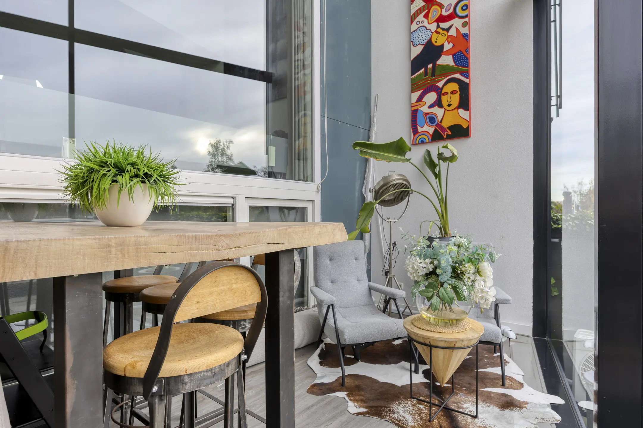 De serre, enkele treden lager gelegen, vormt een prachtig verlengstuk van de living. Met het hoge plafond, de glazen wanden en het uitzicht over de vallei is dit een inspirerende plek voor een zitruimte, atelier of muziekkamer.