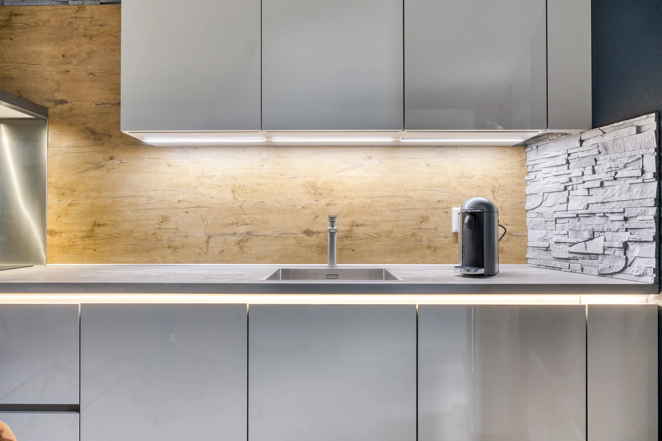 Aan de voorzijde van de woning bevindt zich de open keuken. Deze is voorzien van een lang werkblad met spoelbak, diverse kastruimte en moderne inbouwapparatuur, waaronder een inductie kookplaat, afzuigkap, combi-oven, vaatwasser en koelkast met vriesruimte. Hier is voldoende plek voor een grote eettafel, perfect voor lange diners met familie of vrienden.