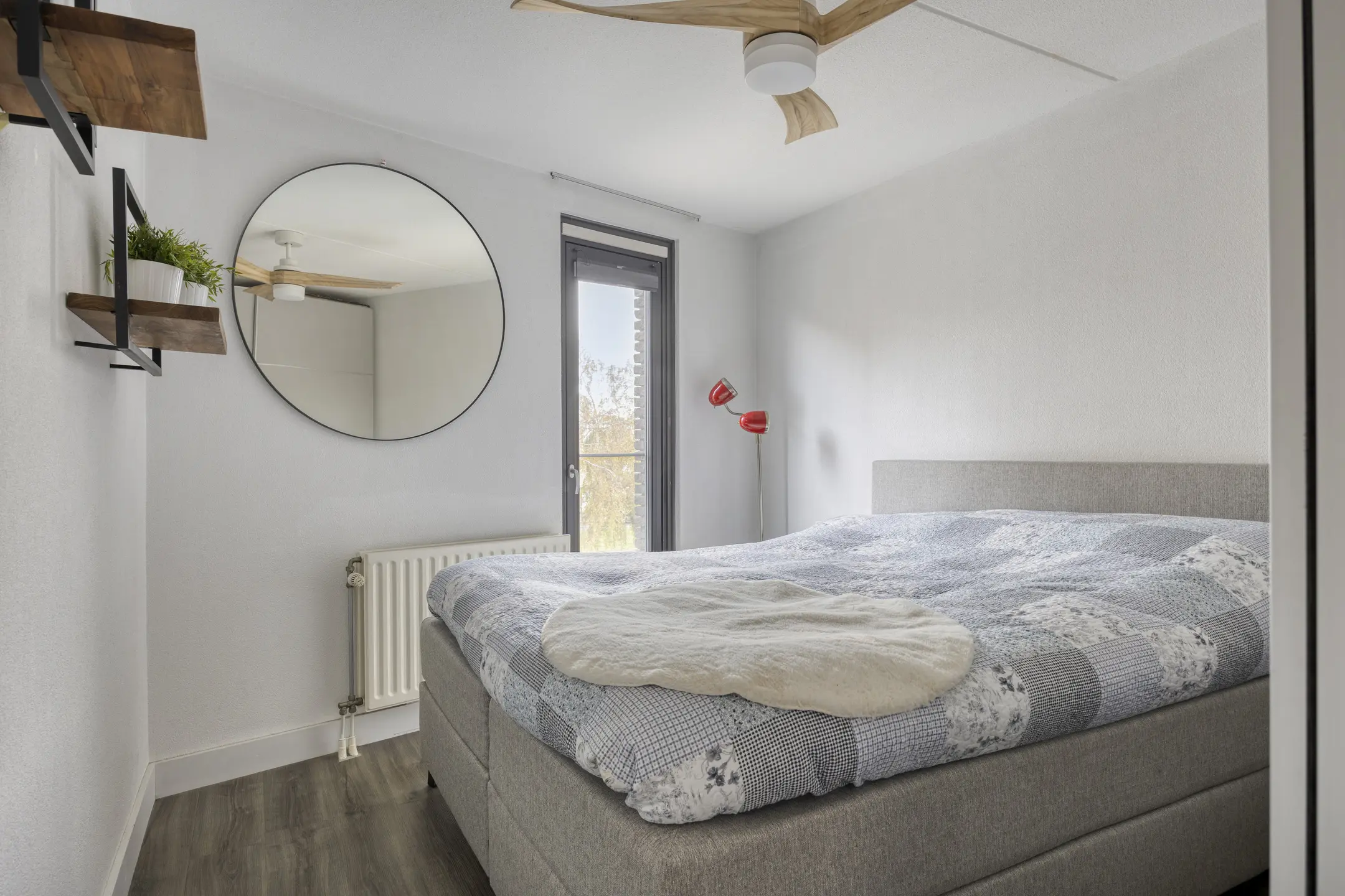 Via het statige trappenhuis met lichtkoepel bereik je de bovenste verdieping. De overloop geeft toegang tot twee goed bemeten slaapkamers, beide voorzien van een nette laminaatvloer en grote raampartijen. De moderne badkamer is geheel betegeld en uitgerust met douche, dubbele wastafel met meubel, toilet en spiegel met verlichting. Ook hier zorgt een lichtkoepel voor extra veel daglicht.