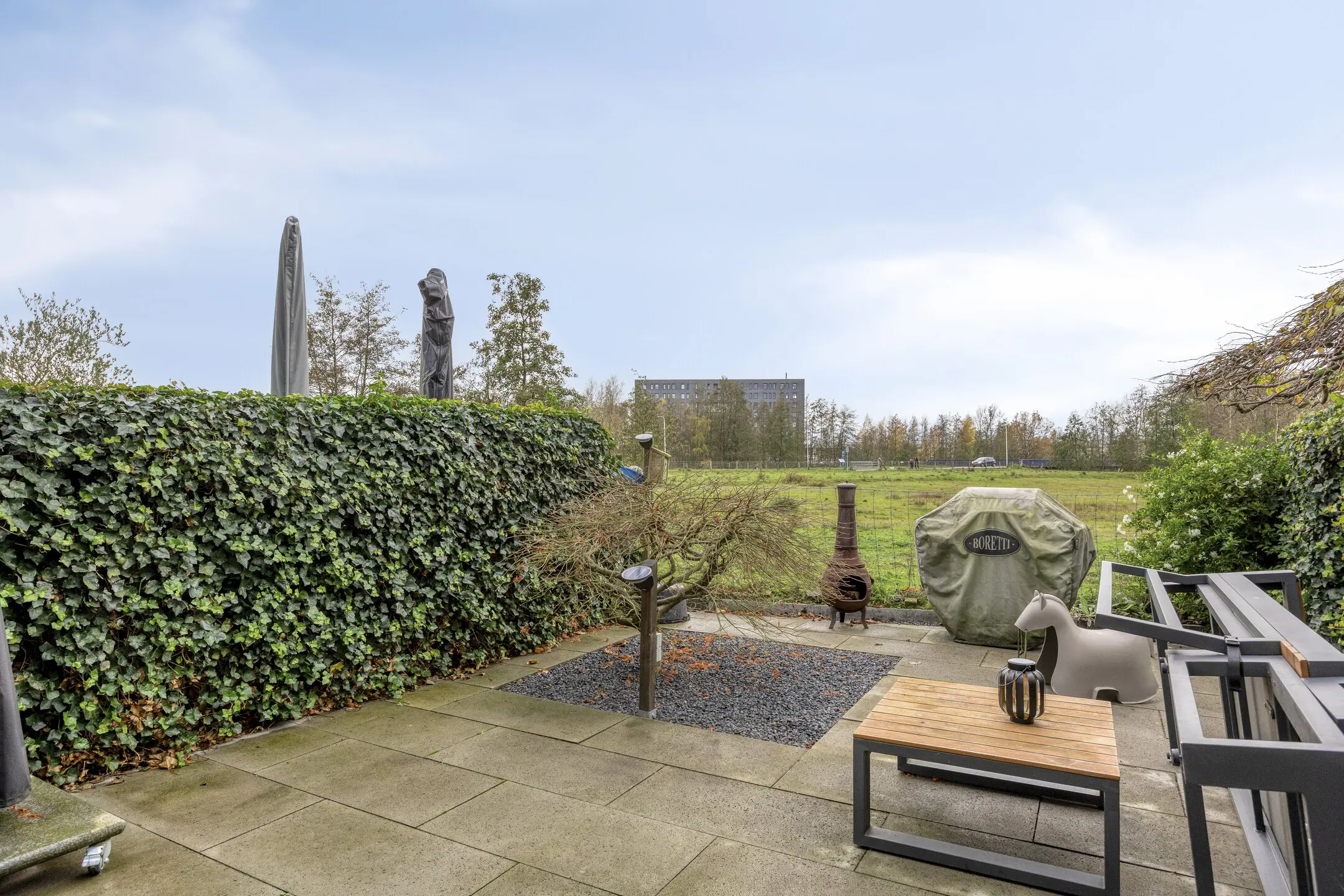 De achtertuin ligt op het zonnige zuidwesten en is grotendeels onderhoudsvriendelijk aangelegd met siertegels. Door de ligging direct aan de Dongevallei geniet je hier van een weids uitzicht, rust en privacy. Het vrije zicht over het natuurgebied – waar regelmatig Schotse Hooglanders grazen – maakt het buitenleven hier echt bijzonder.