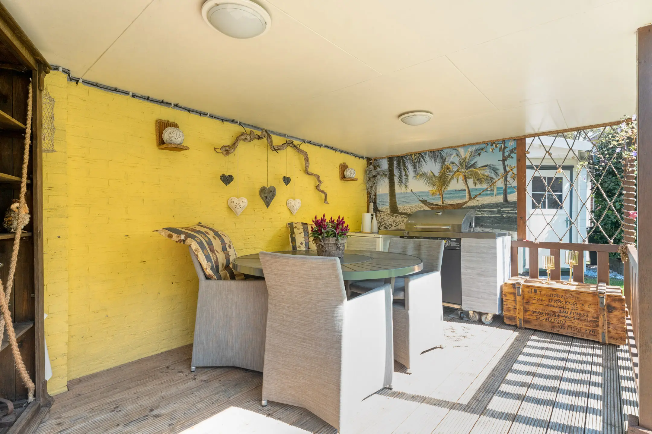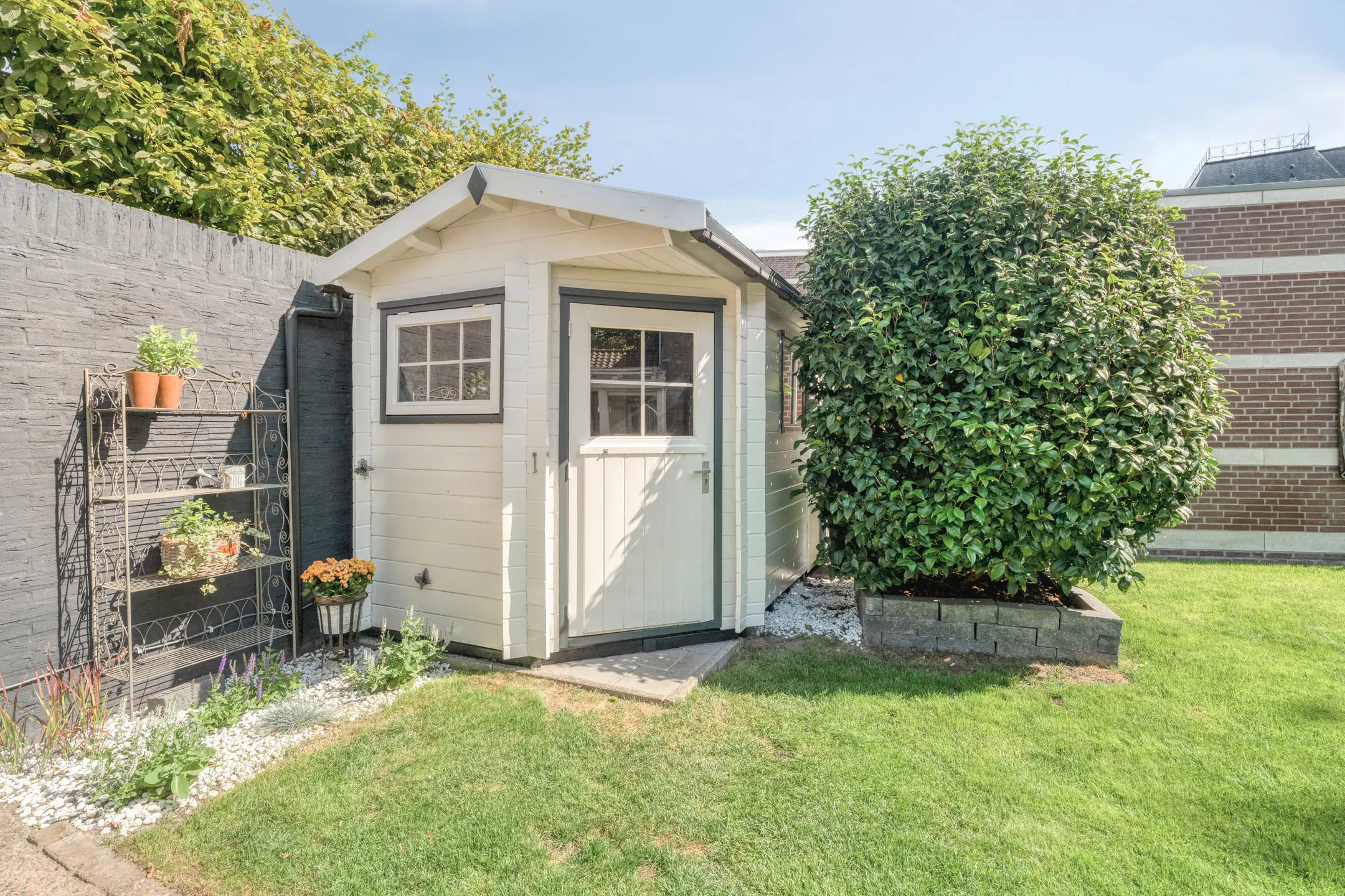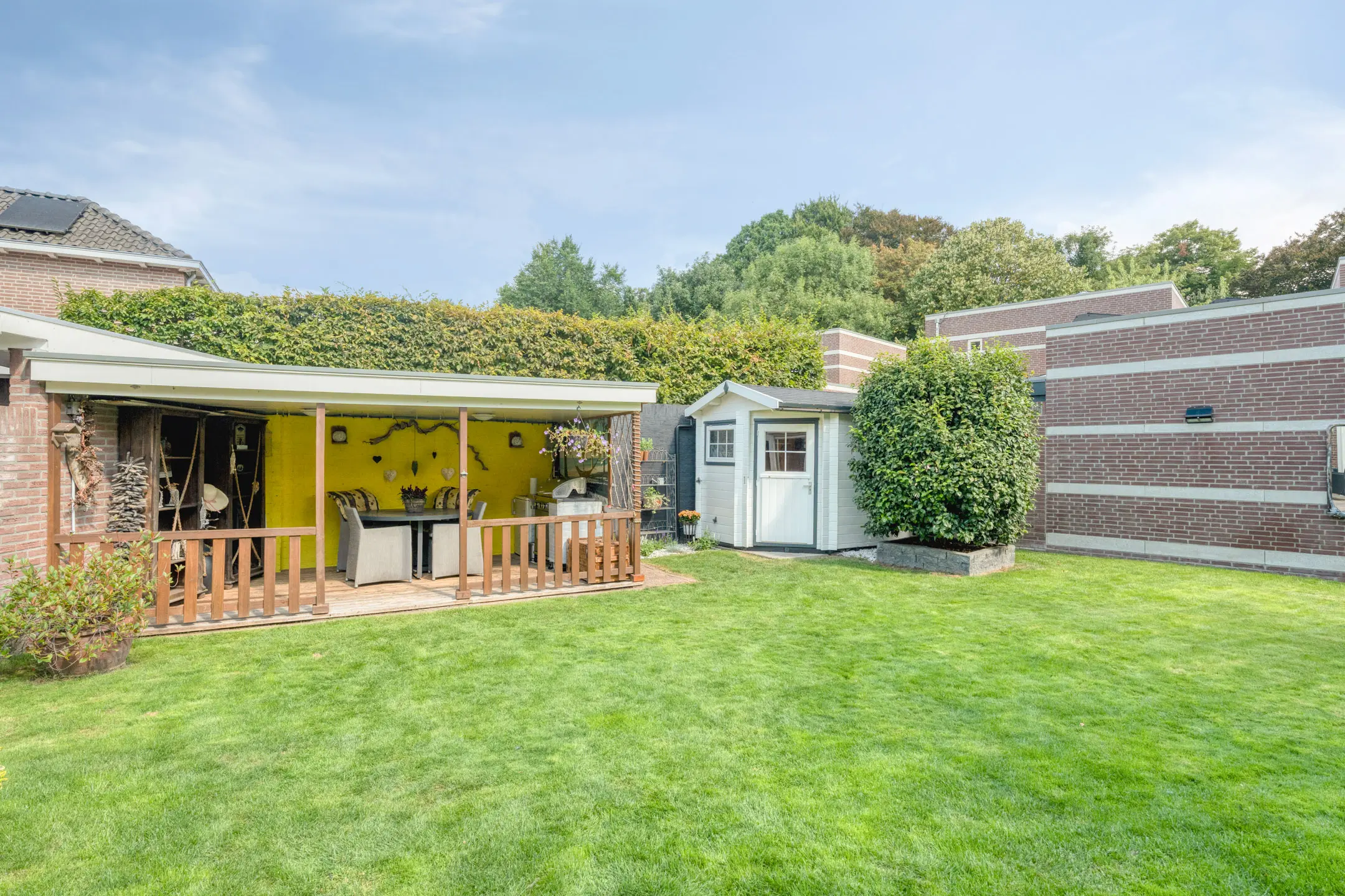 Buiten vind je een goed onderhouden tuin met zowel een achtertuin als een zijtuin. De achtertuin is voorzien van een overkapping, solardouche en een tuinhuis v.v. afzuigkap. De zijtuin is voorzien van een looppad naar de poort en een containeropstelplaats.